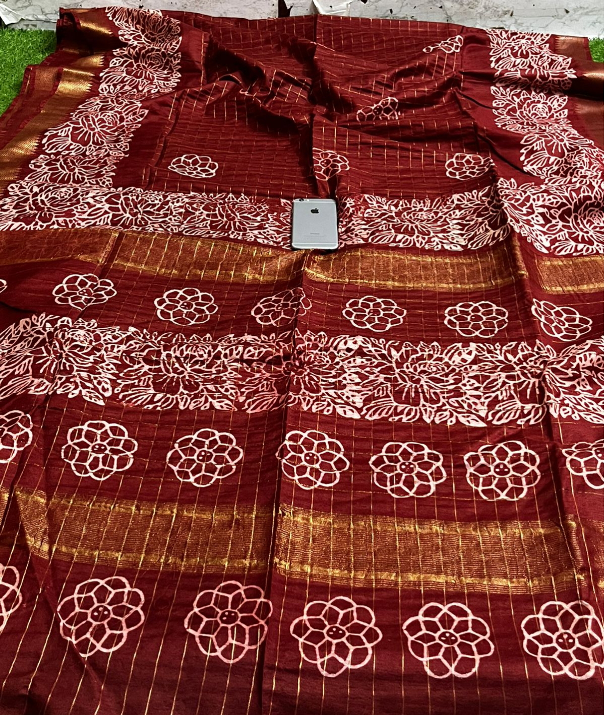 Bring home the charm of traditional craftsmanship with the Aarvi Grace Kota Staple Mangalagiri Saree, beautifully adorned with modern discharge print designs.