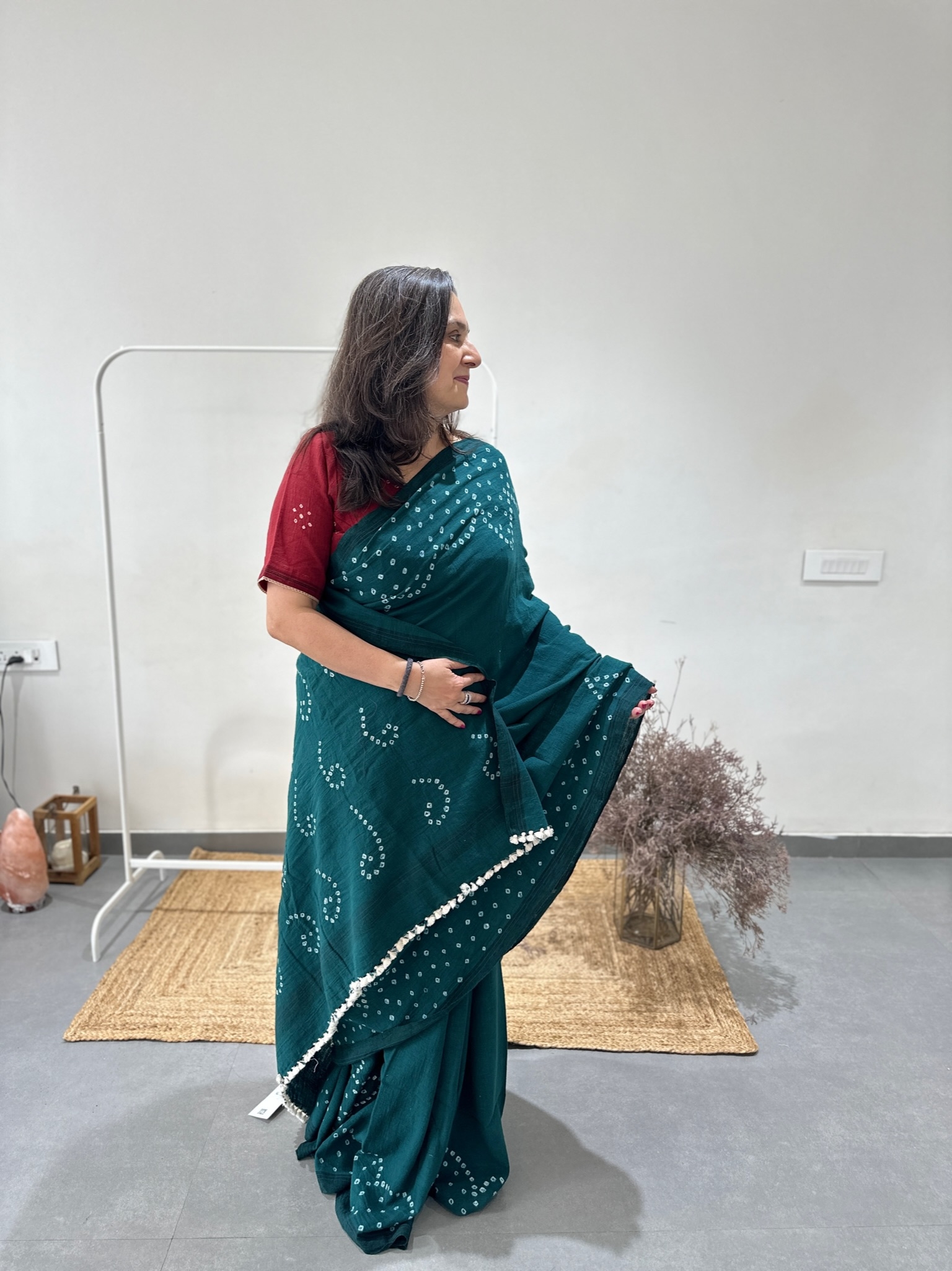 Stepping into the realm of timeless beauty with this Ajrakh Bandhani saree. Handmade with love, it exudes grace and elegance.A vibrant and intricately tie-dyed masterpiece, embodying the rich cultural heritage of India.