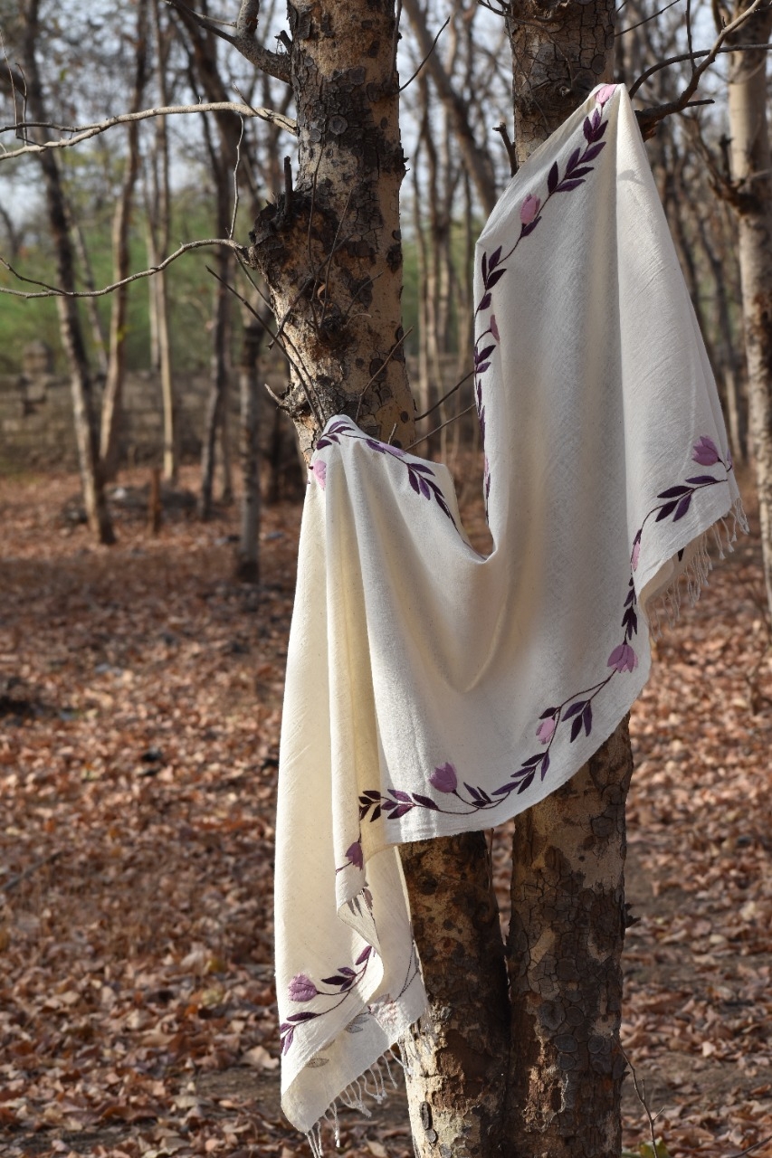 The white base color is adorned with intricate lavender floral petal applique work, making it a versatile accessory that adds a touch of elegance to any outfit. Handcrafted by skilled artisans, each stole is a unique testament to traditional craftsmanship and sustainable practices.