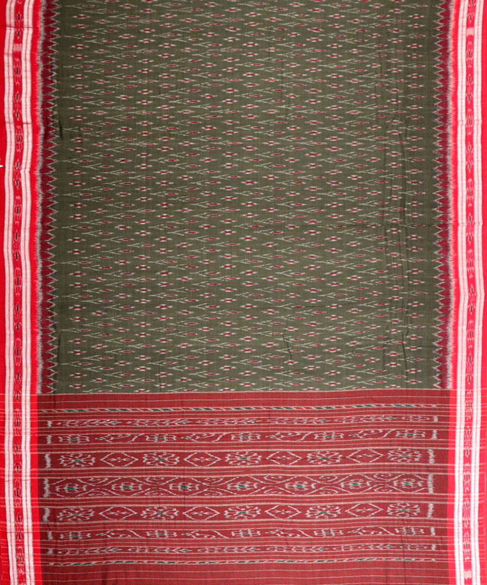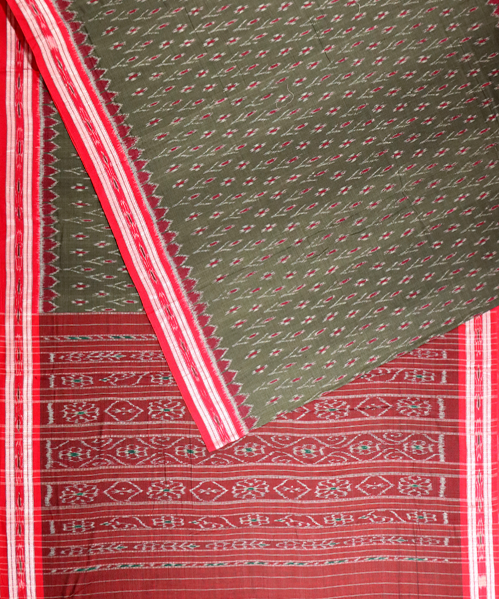 Exclusive Handwoven nuapatna cotton saree Artichoke base with Traditional ikat in body & border dark red base with dobby, traditional & temple ikat & Pallu dark red base with traditional ikat ,Saree has no Blouse piece.