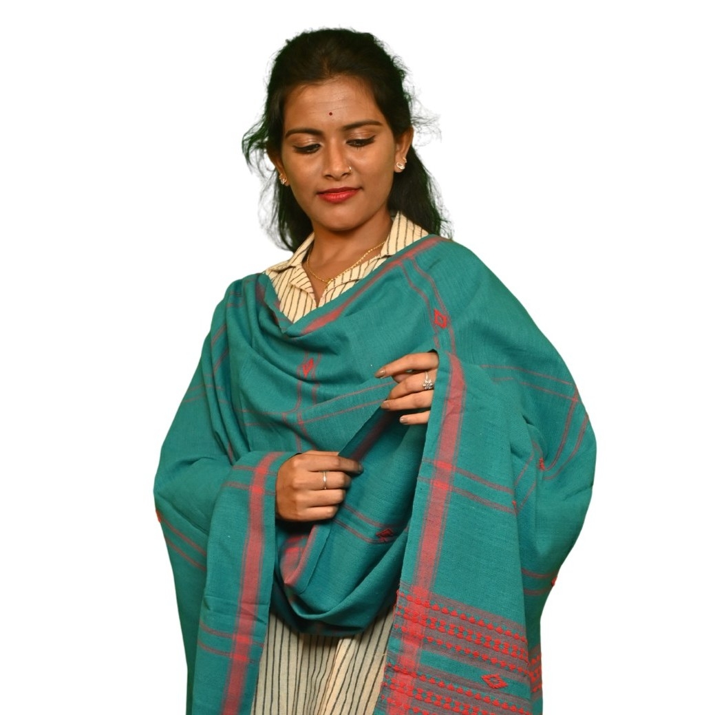 Authentic Kotpad Cotton Dupatta | Teal Green with Red Tribal Motifs | Handwoven Odisha
