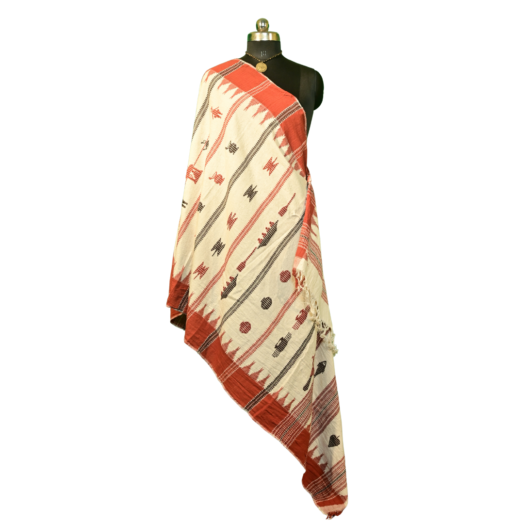 The shawl features a soft off-white base enriched with maroon and black tribal motifs, symbolizing nature, culture, and tribal heritage. Borders display classic Kotpad geometric patterns, while the hand-twisted fringes