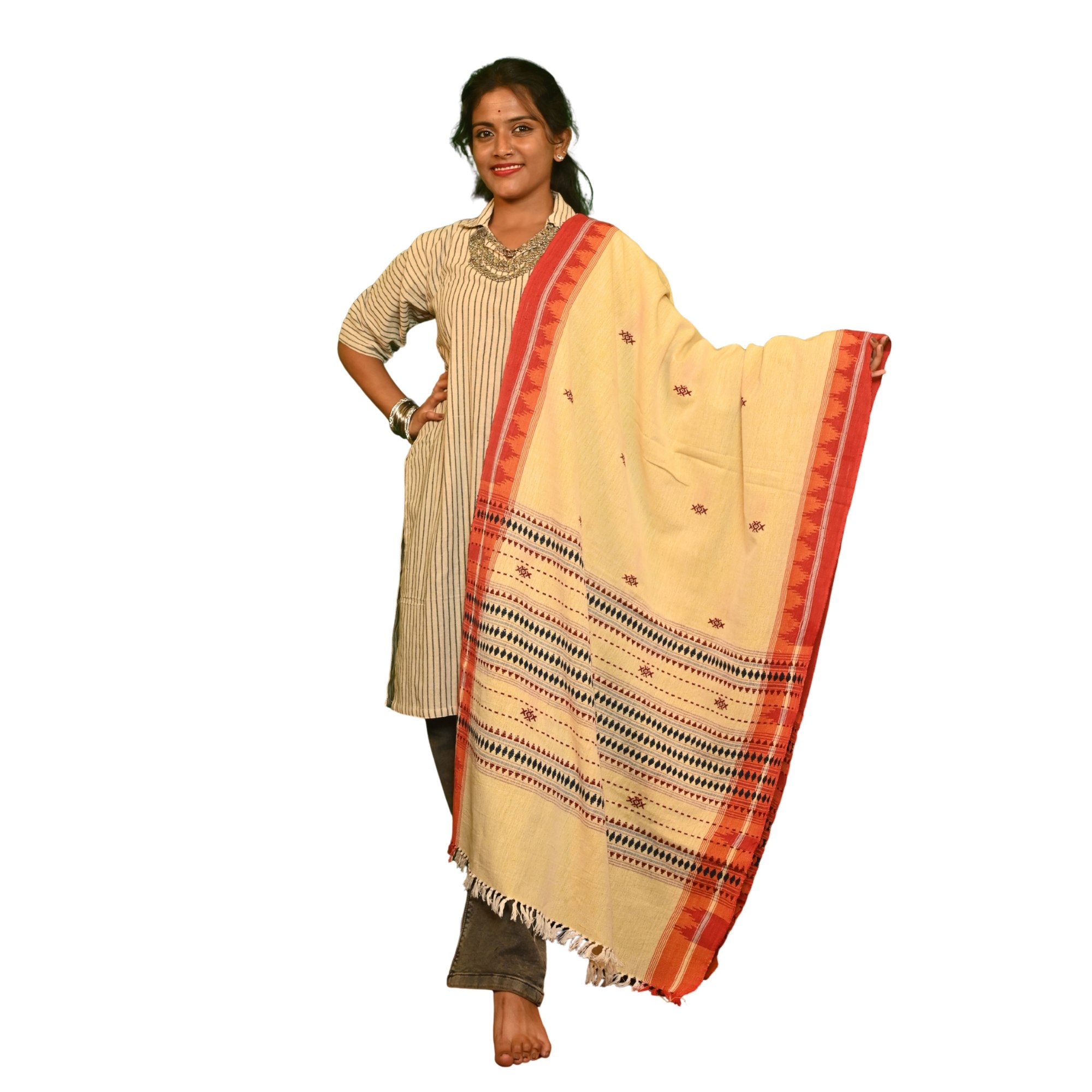Authentic Kotpad Handwoven Tussar Dupatta | Natural Beige with Red Tribal Border & Geometric Motifs | Odisha Handloom