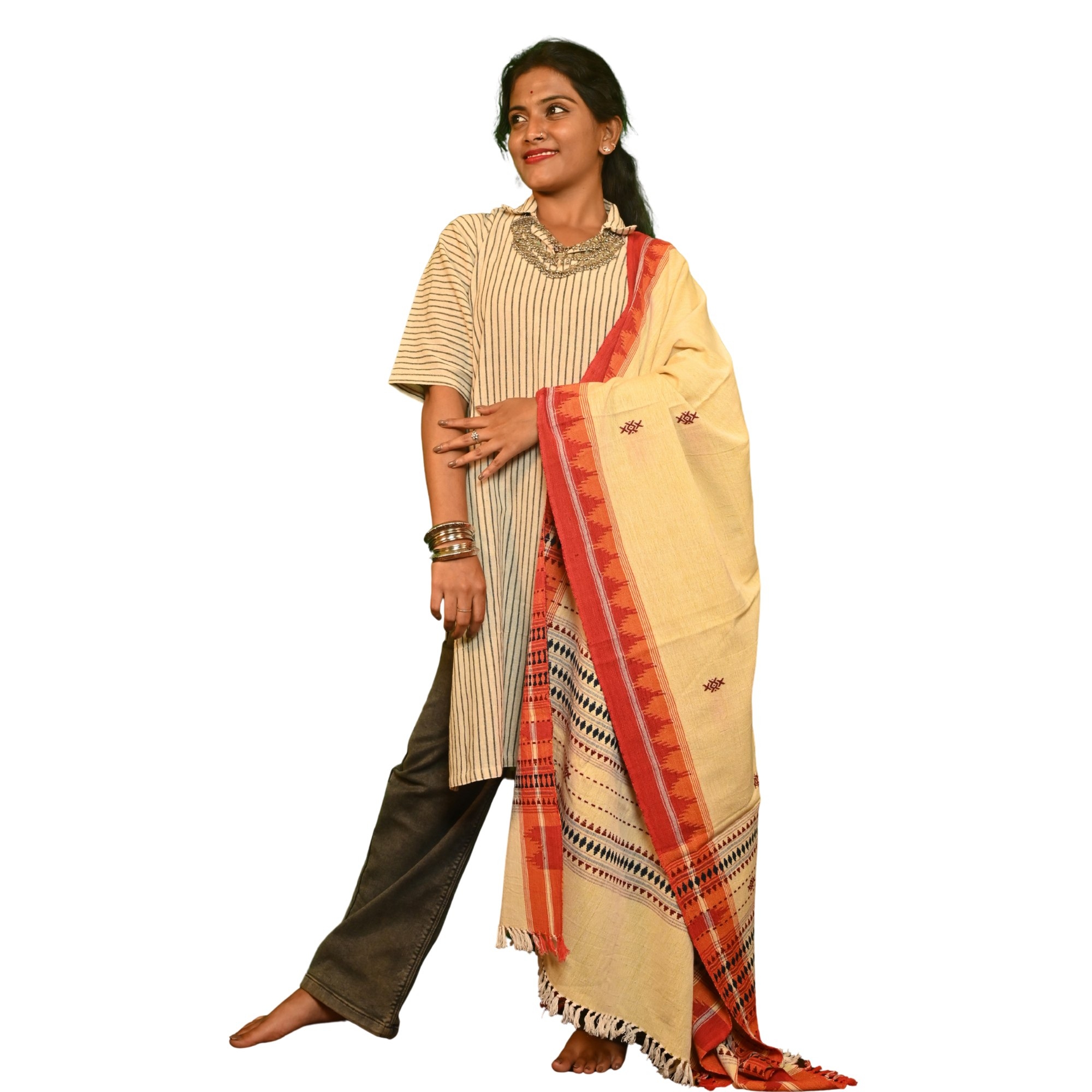 This authentic Kotpad Tussar dupatta is handwoven by tribal artisans of Koraput, Odisha, using traditional pit-loom techniques and natural dyes. The soft beige body features delicate tribal motifs, complemented by a rich red woven border and geometric pallu patterns. Lightweight and breathable, it is perfect for everyday and ethnic wear. Slight variations in colour and size are natural marks of genuine handloom craftsmanship.