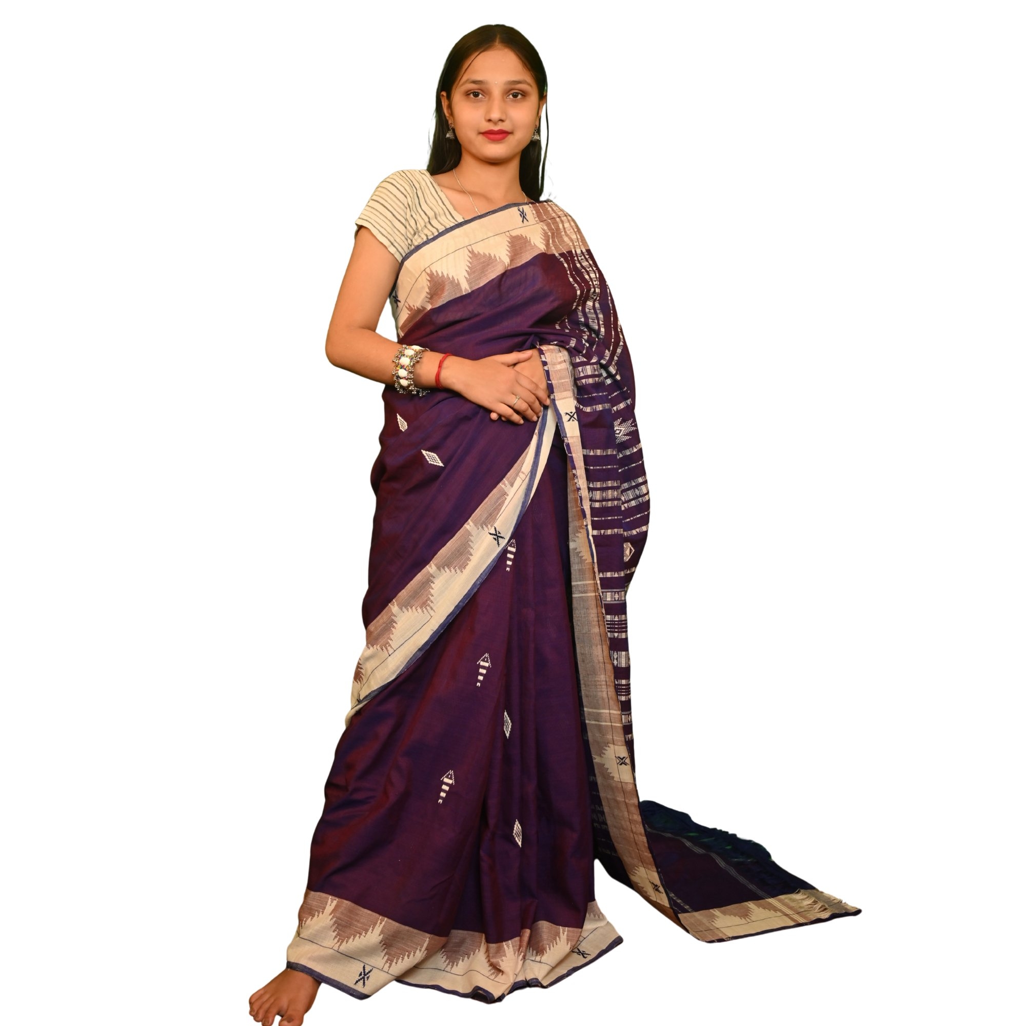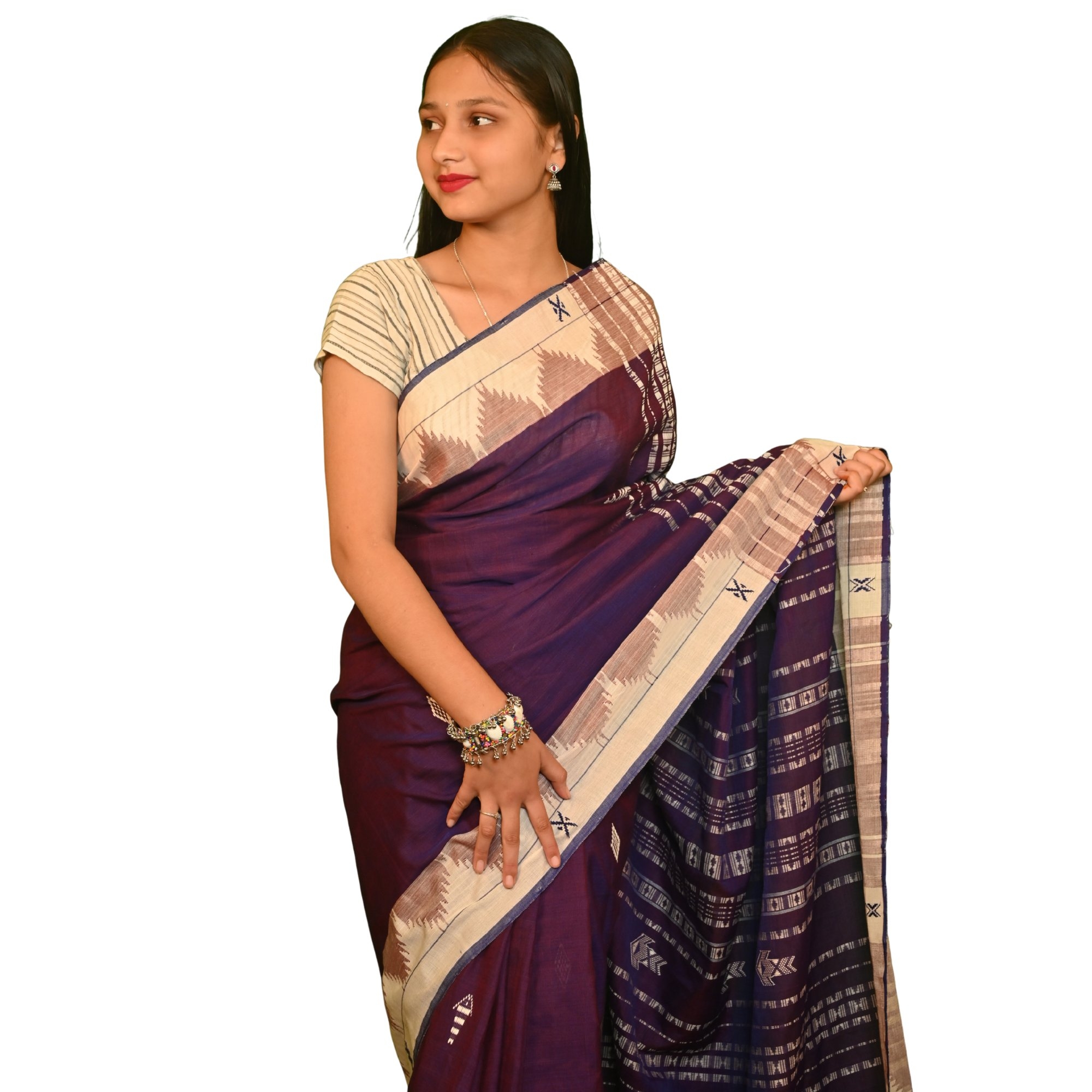 This Kotpad traditional cotton saree is handwoven by tribal artisans of Koraput, Odisha, following the GI-tagged Kotpad weaving tradition and natural dye practices. The deep brown body is highlighted with mustard and red tribal accents that bring warmth and visual depth to the saree. The woven striped pallu adds texture and cultural rhythm. Includes a matching unstitched blouse piece. As an authentic handloom product, slight variations in color and size may occur.