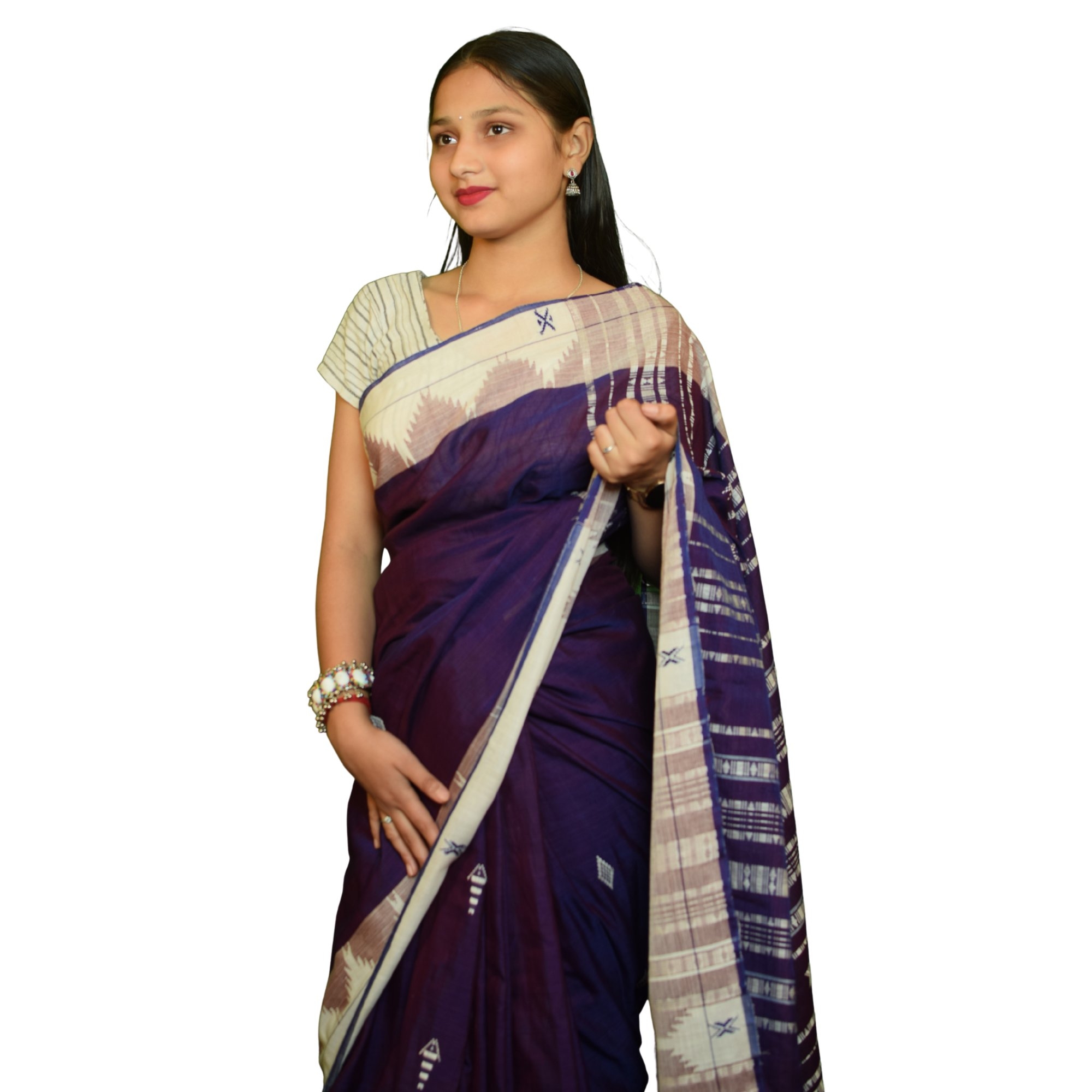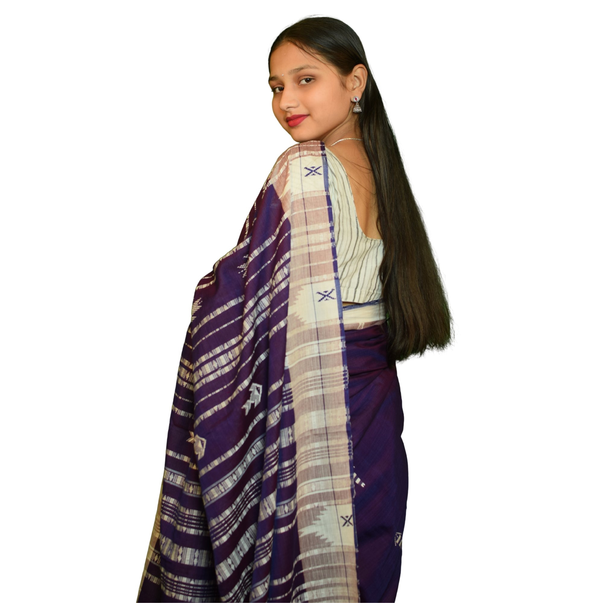 Authentic Kotpad Traditional Cotton Saree | Deep Blue with Tribal Accents & Woven Striped Pallu | Handwoven by Koraput Tribal Artisans