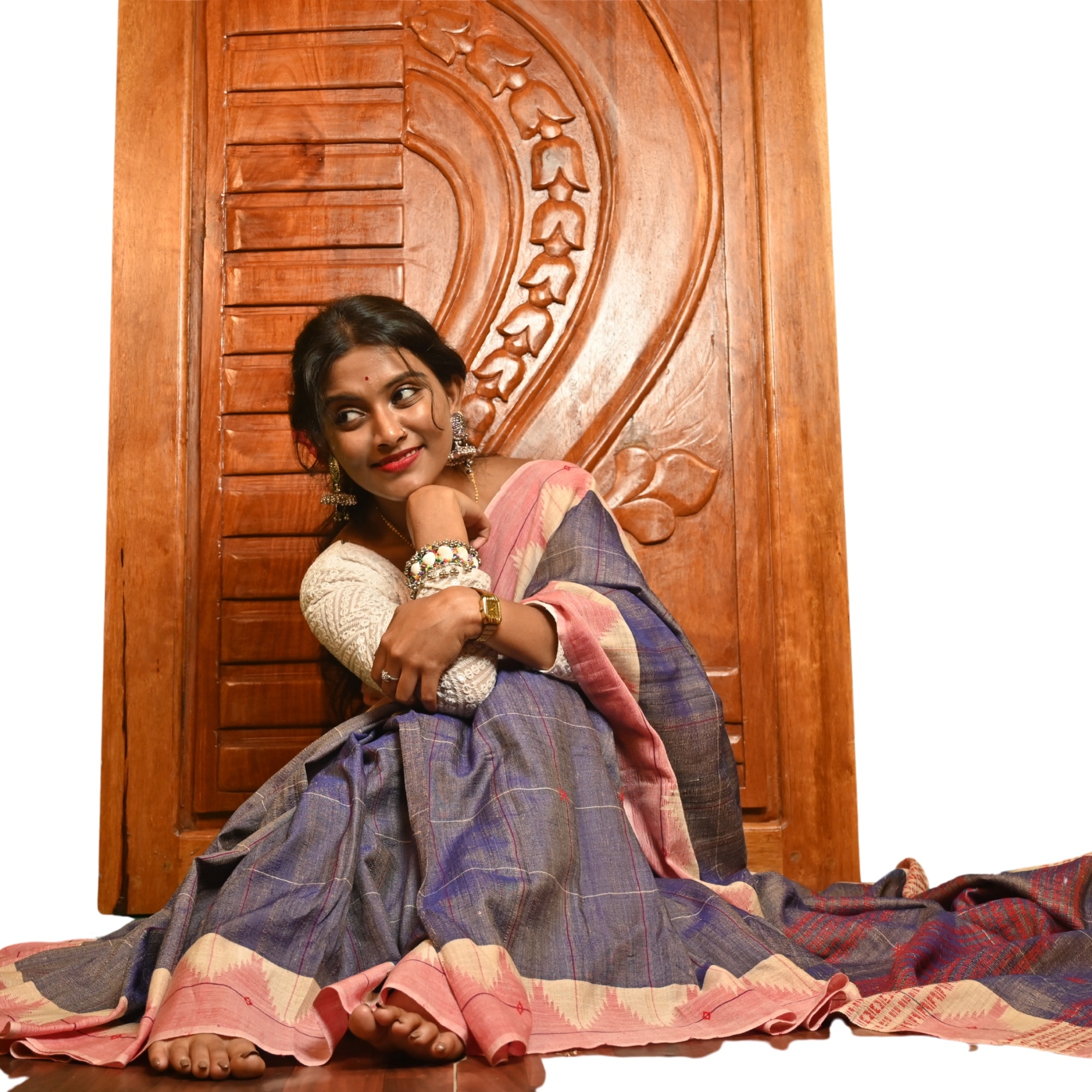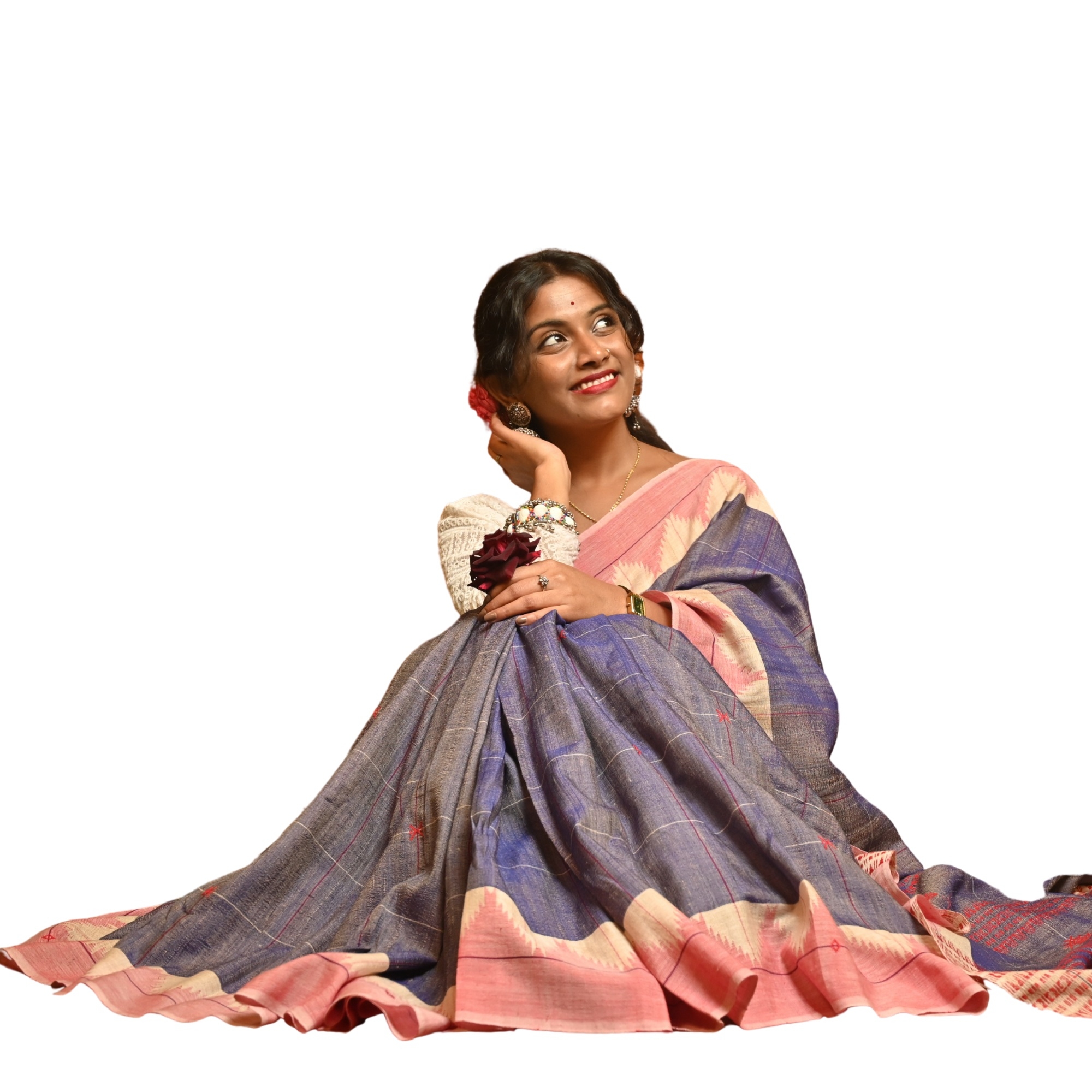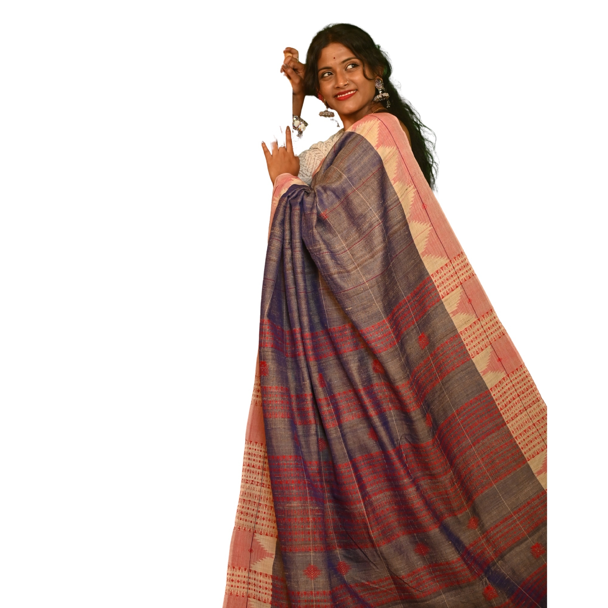 This Kotpad traditional Tussar silk saree is handwoven by tribal artisans of Koraput, Odisha, following the GI-tagged Kotpad weaving tradition and natural dye practices. The rich rust red body is enhanced with bold black tribal motifs, while the striped woven pallu adds depth, texture, and cultural significance. Includes a matching unstitched blouse piece. As an authentic handloom product, slight variations in color and size may occur.