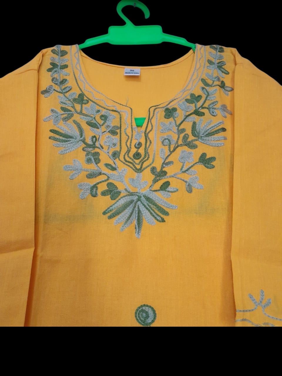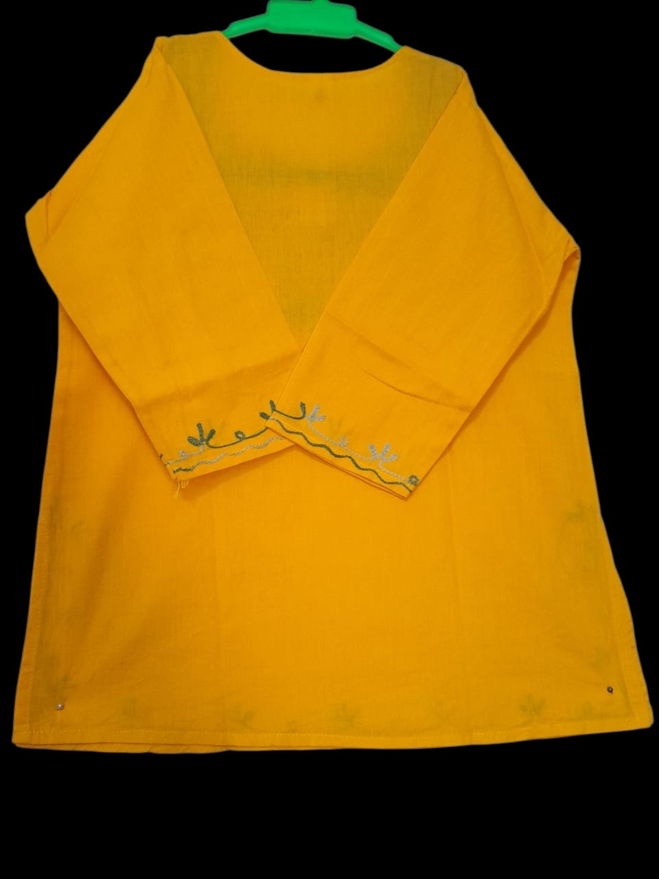 the baby kurti is a yellow ,pure cotton garment with intricate aari emboridery. colour yellow/mustared. fabric pure cotton,described as ruby cotton in same sources. emborided features floral and vine motifs in green and silver/grey, done using aari work.