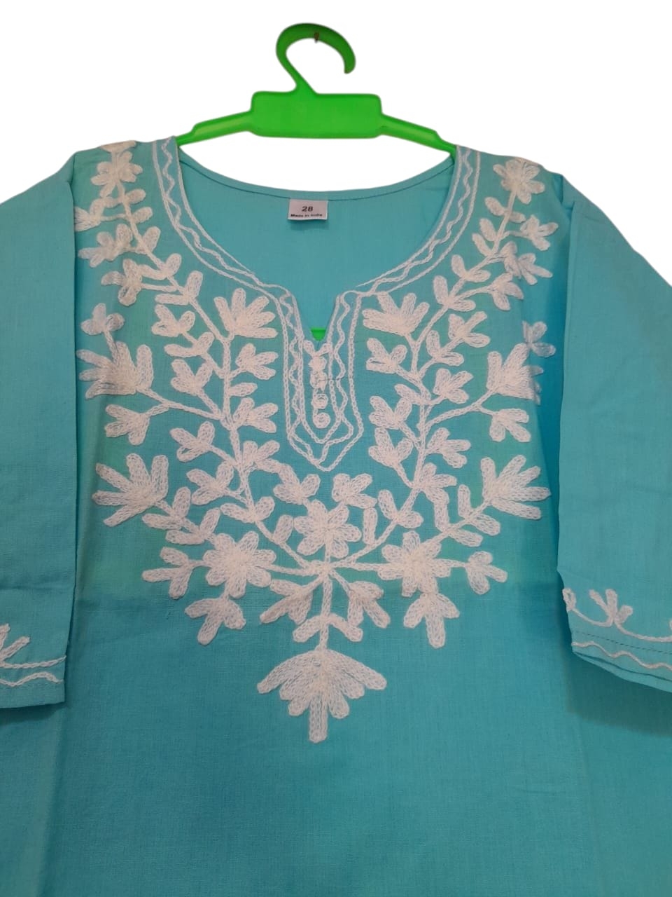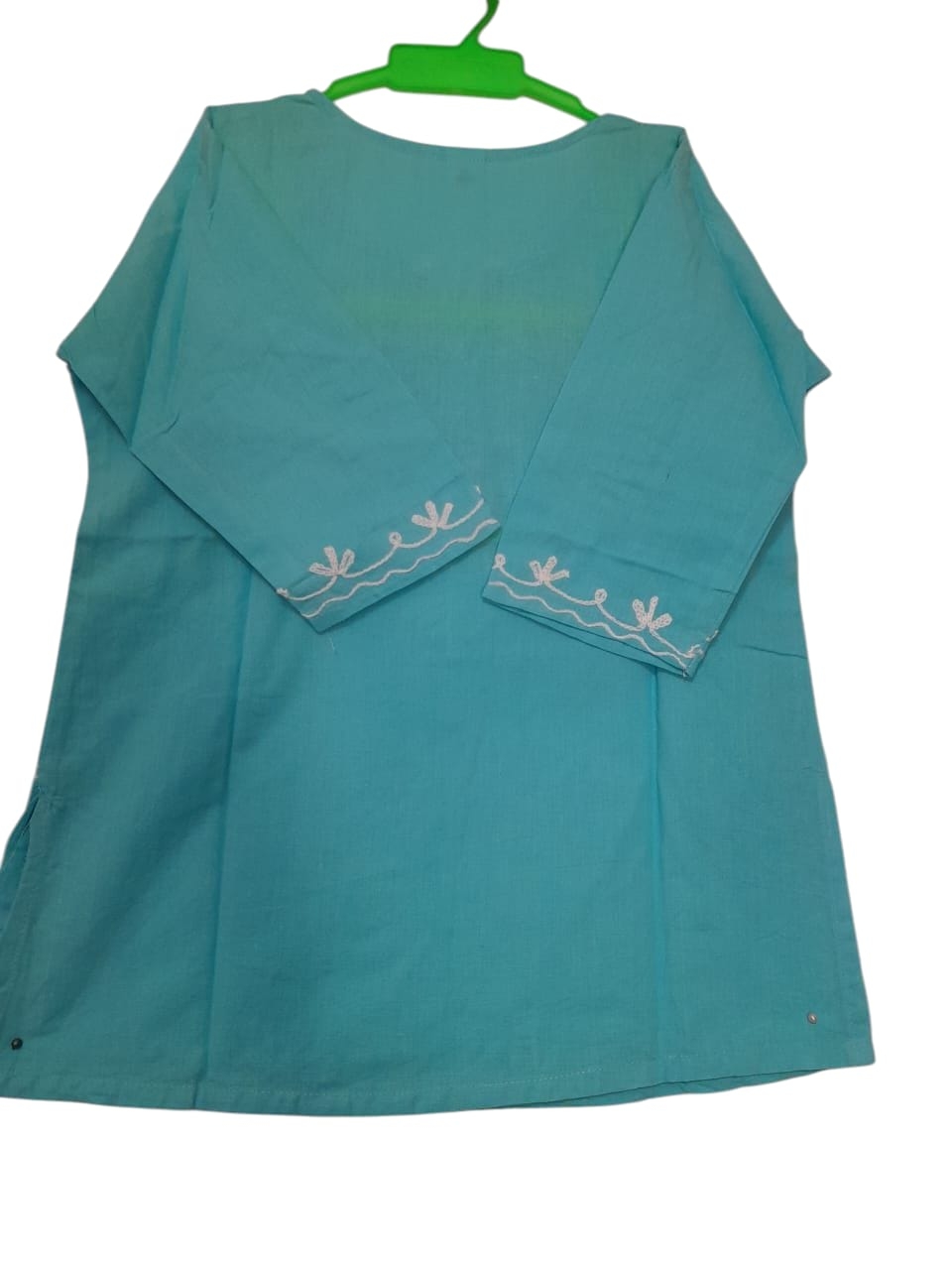 The kurti in the image is a short, embroidered kurti, often referred to as a Lucknowi Chikankari kurti.Based on the visual evidence and common product descriptions for similar items, here are the key features:Design: The kurti features intricate white embroidery in floral and leaf patterns, which is a characteristic style of Lucknowi Chikankari work. The embroidery is concentrated on the yoke, sleeves, and hemline. Fabric: The material is typically a soft, breathable fabric like rayon or cotton. Fit and Length: It has a straight silhouette and is a short, hip-length style. Neckline and Sleeves: The neckline is a rounded V-slit design. The sleeves are 3/4th length and also feature embroidery. Color: The kurti is a light blue or turquoise color.