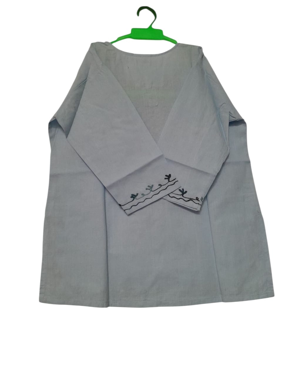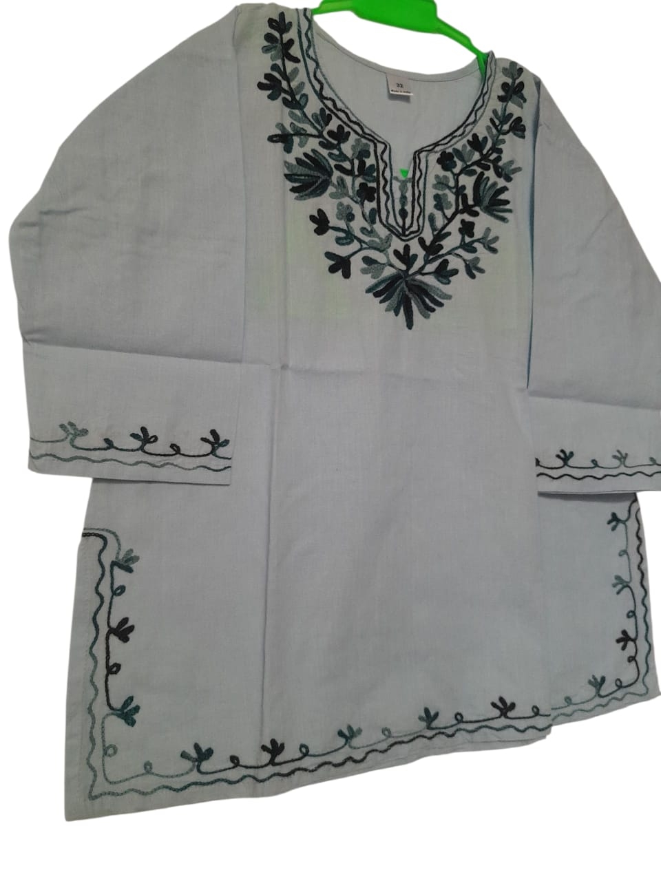 Color: grey.Neckline: V-neck.Sleeves: Three-quarter length with embroidered cuffs.Embroidery: Intricate floral or leafy embroidery in shades of dark blue and green is present on the front neckline and chest area, as well as on the cuffs and the bottom hem. The bottom hem has a scalloped, embroidered edge.Fabric: The fabric appears to be a lightweight, breathable material, likely cotton.