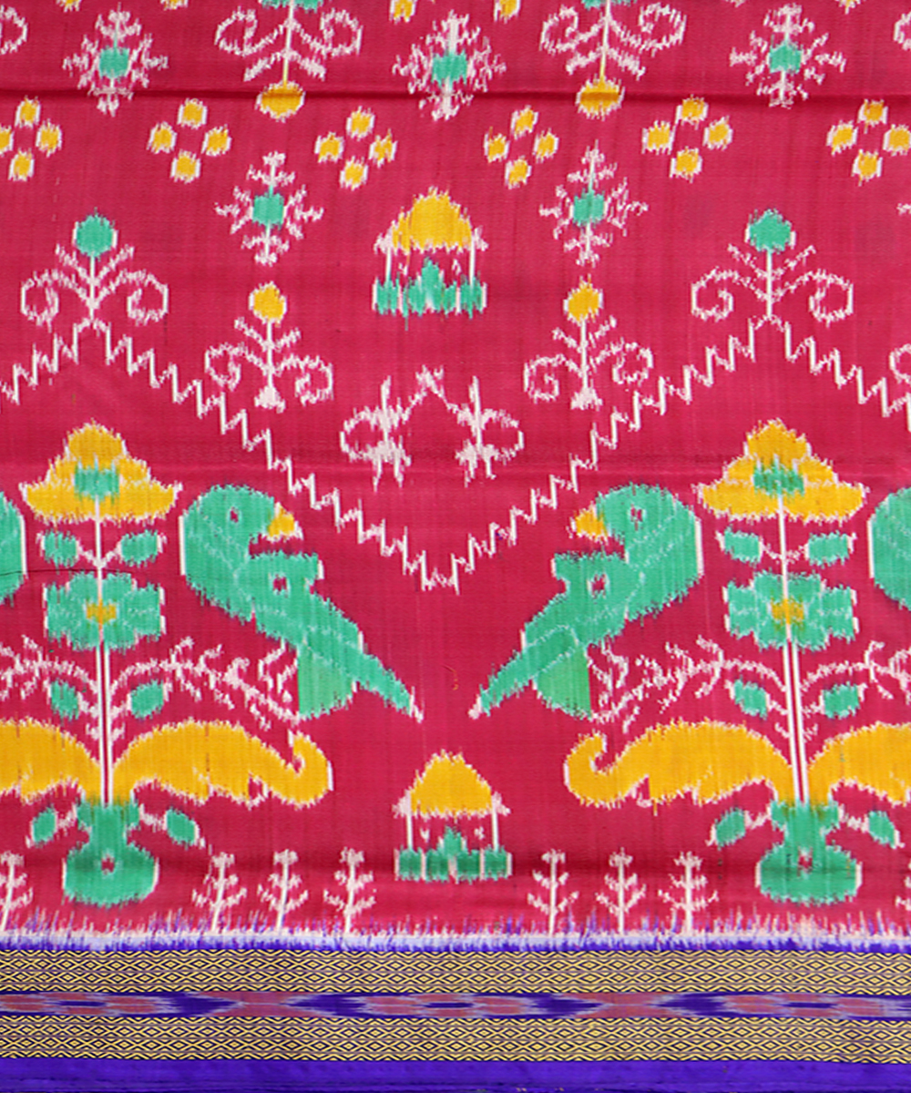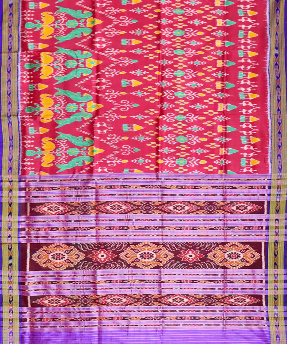 Handwoven traditional Khandua silk saree Barbie Pink base Ikat in body & border dark blue base with traditional ikat & Pallu dark blue base with traditional ikat