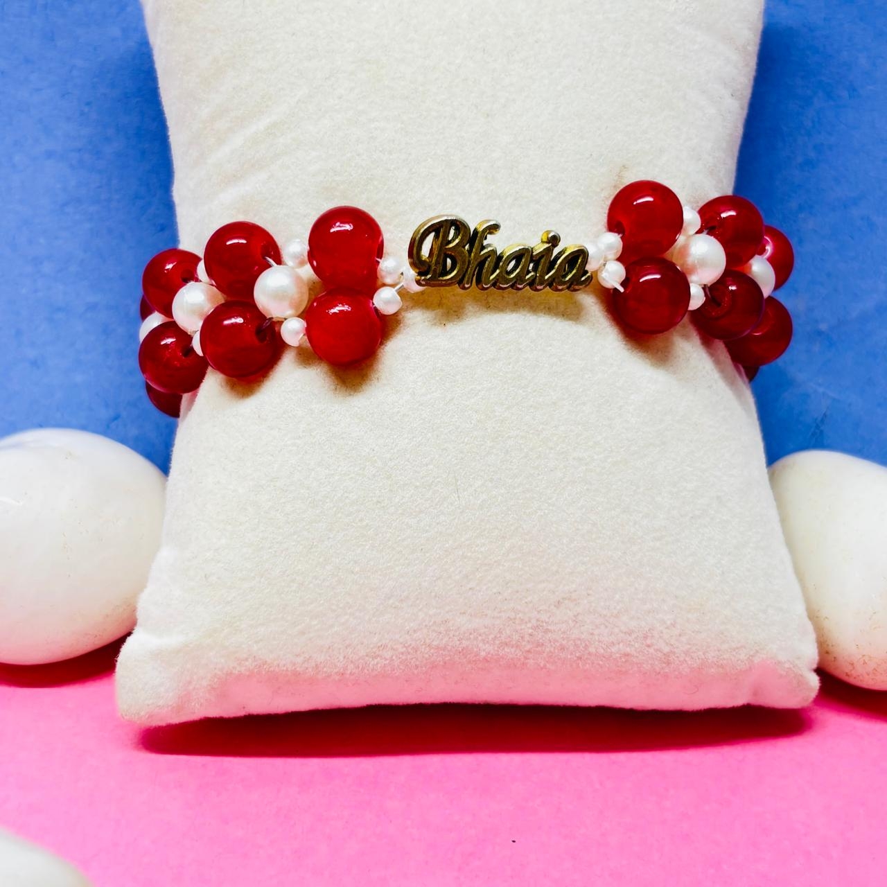 The timeless bond of sibling love shines through this exquisite Bhaiya Rakhi for Brother, thoughtfully designed for Raksha Bandhan. Featuring a striking golden "Bhaiya" charm and vibrant red and white pearl beads arranged in a stylish double-strand pattern, this rakhi beautifully blends tradition with contemporary elegance.