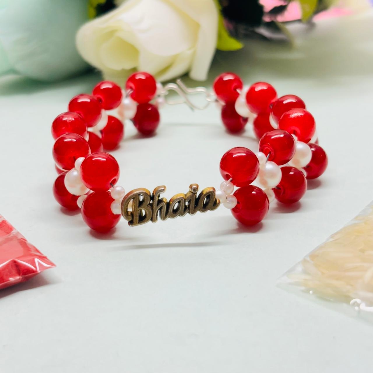 Beautiful Bhaiya Rakhi Set – Red & white double-layer beaded rakhi with golden “Bhaiya” charm, including roli and chawal.