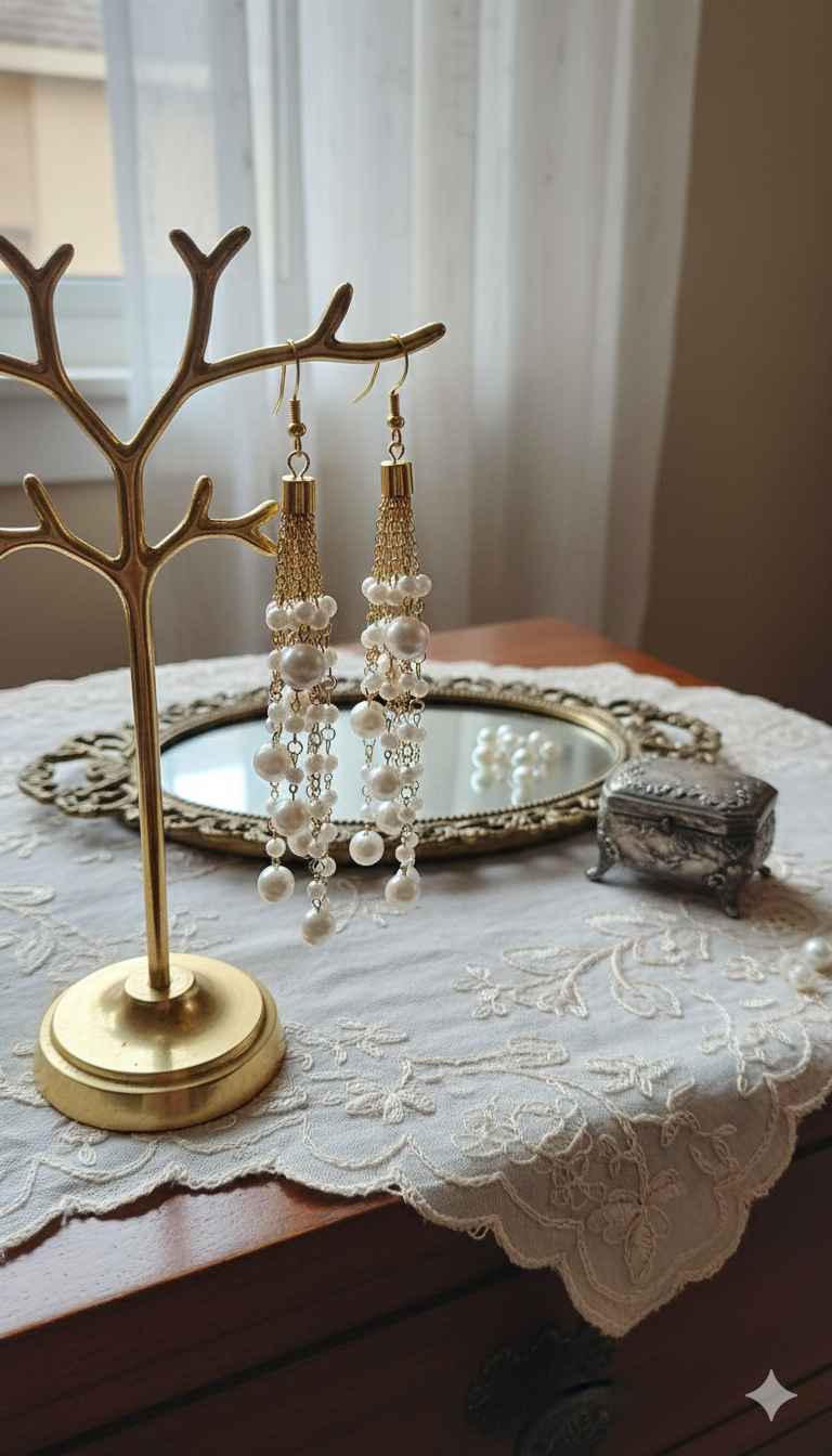 Elevate your jewelry collection with these stunning Pearl Cascade Tassel Earrings. Designed to blend timeless sophistication with modern flair, these earrings feature delicate layers of cream-white pearls suspended from intricate gold-toned chains. Their long, flowing silhouette creates a graceful "waterfall" effect that moves beautifully with every step you take