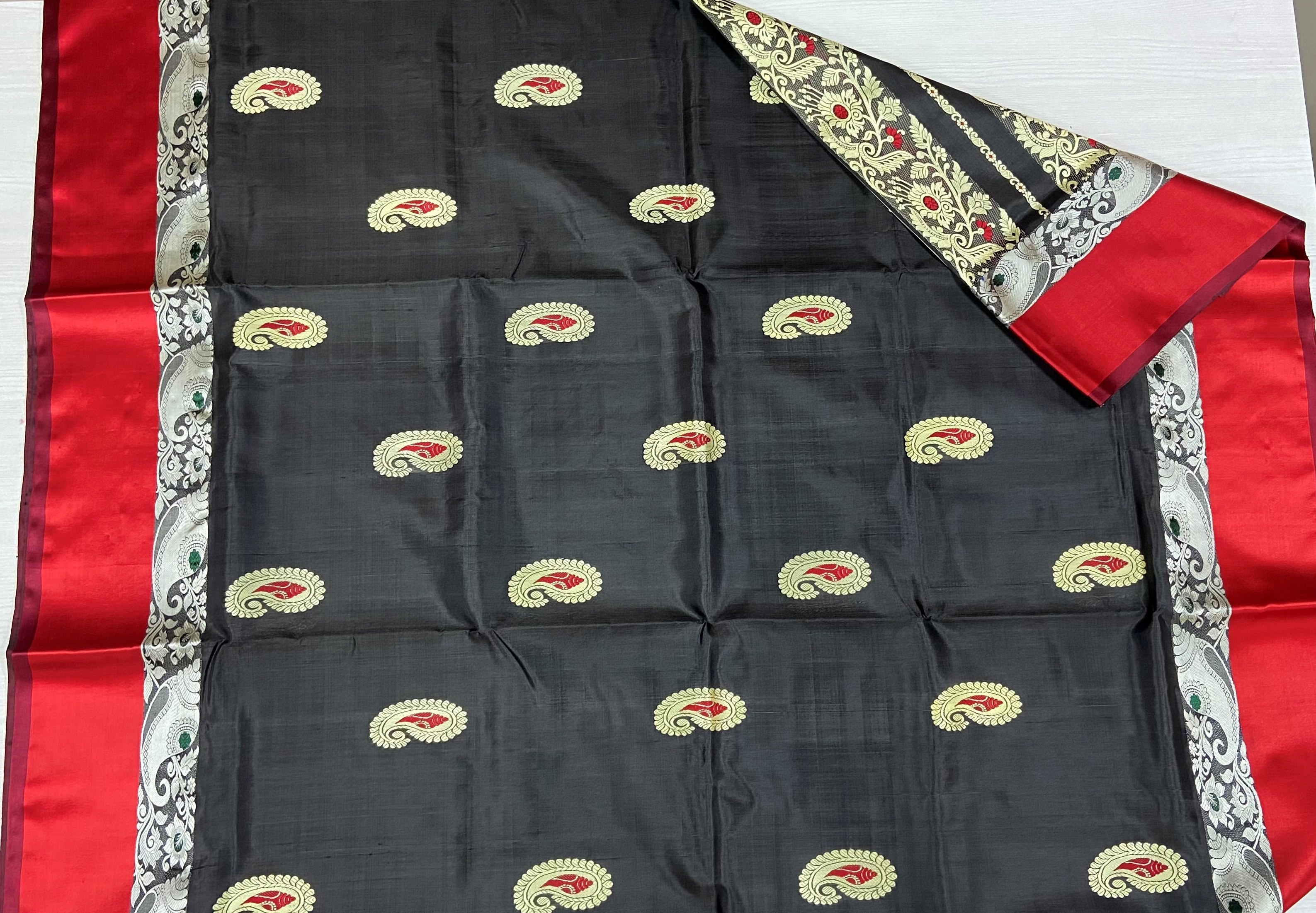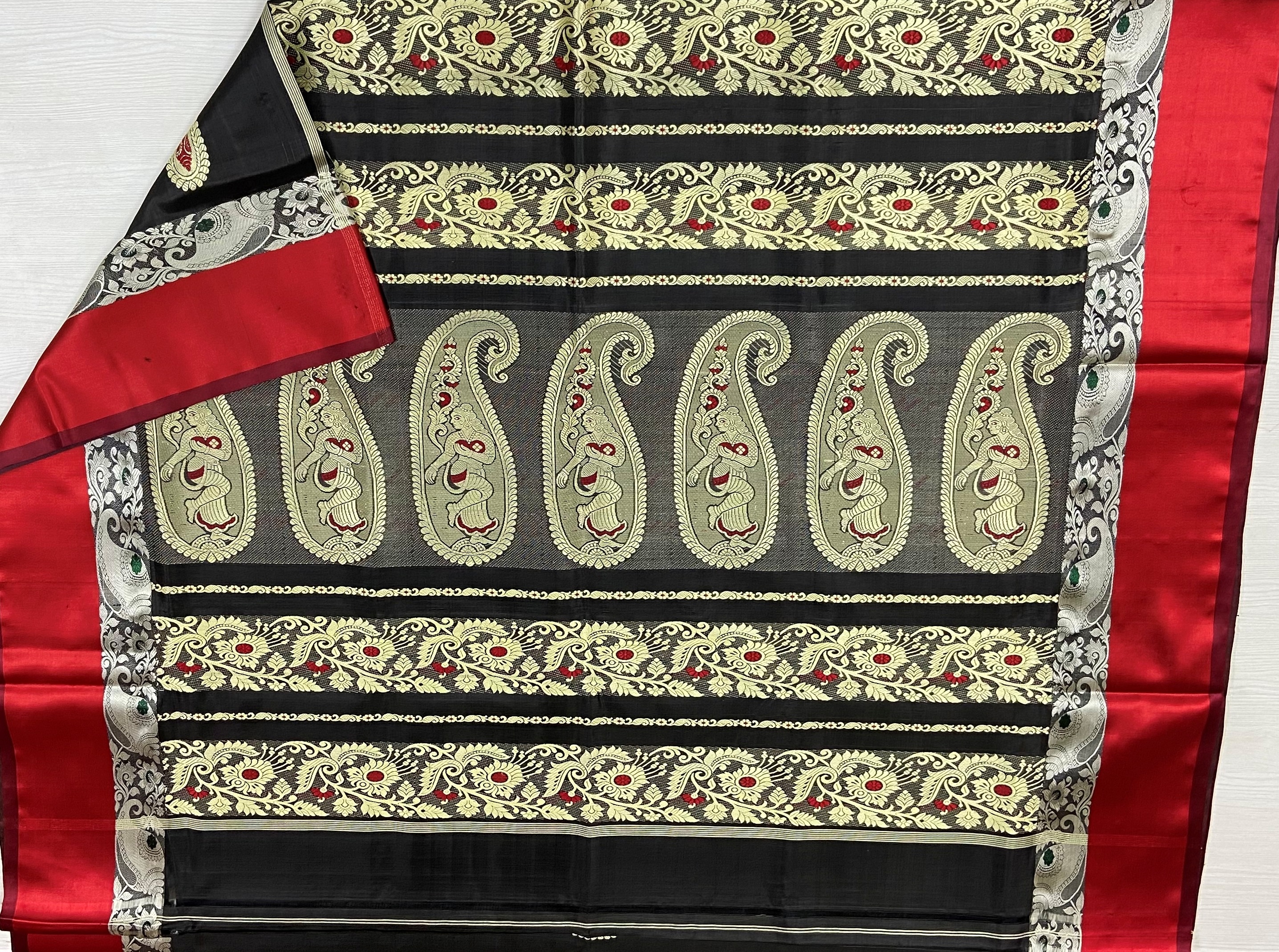 Bengal Black Mina Silk Saree with Red Border