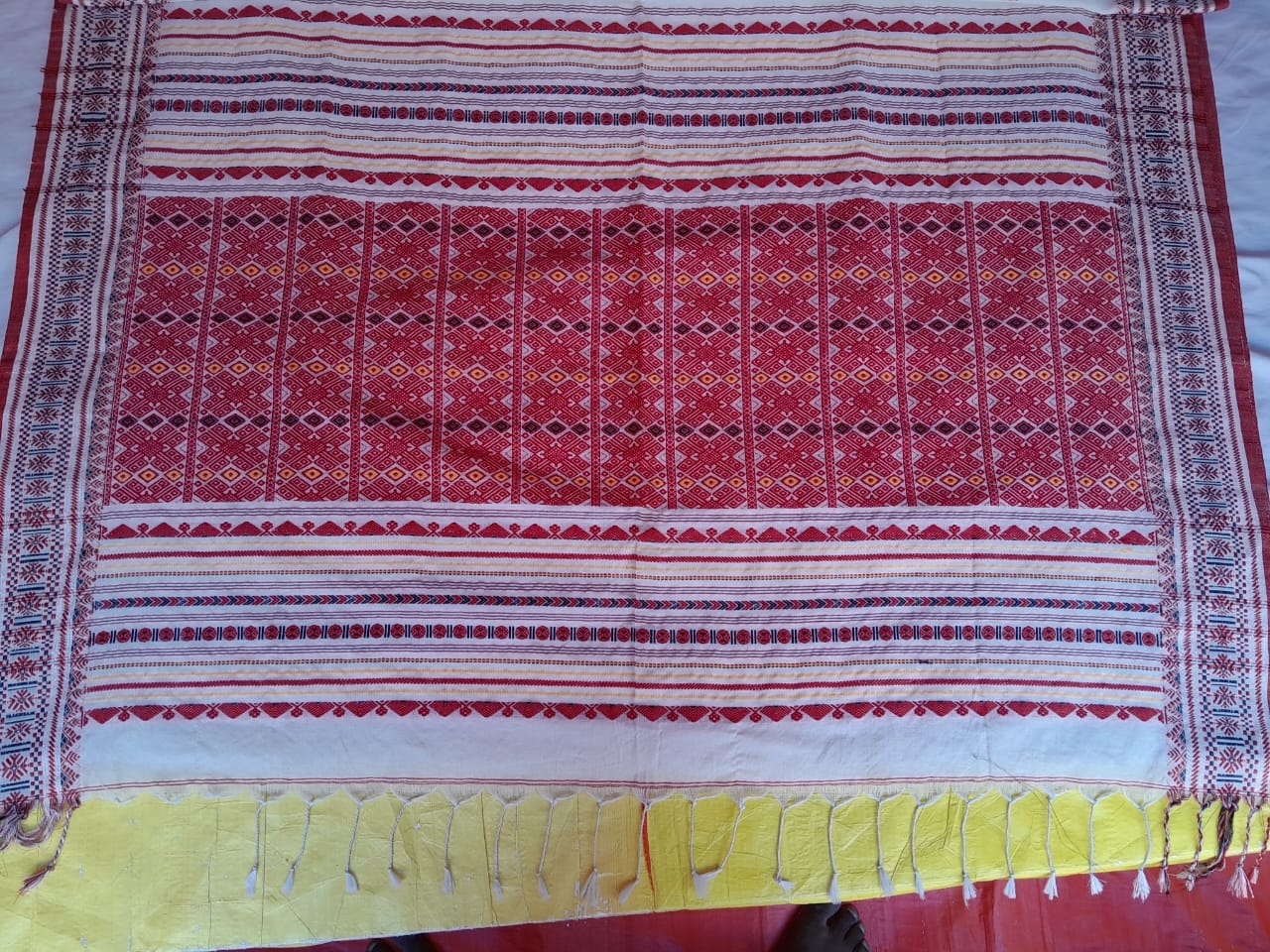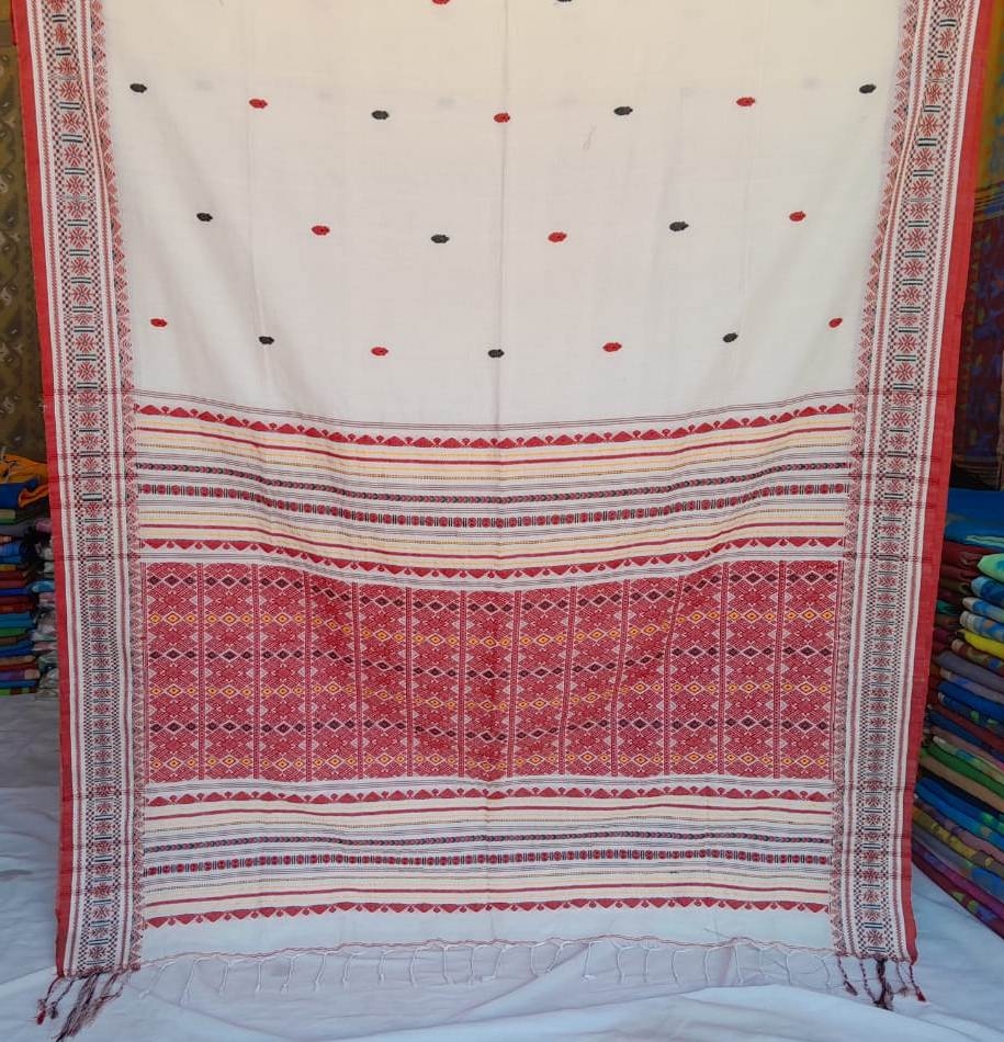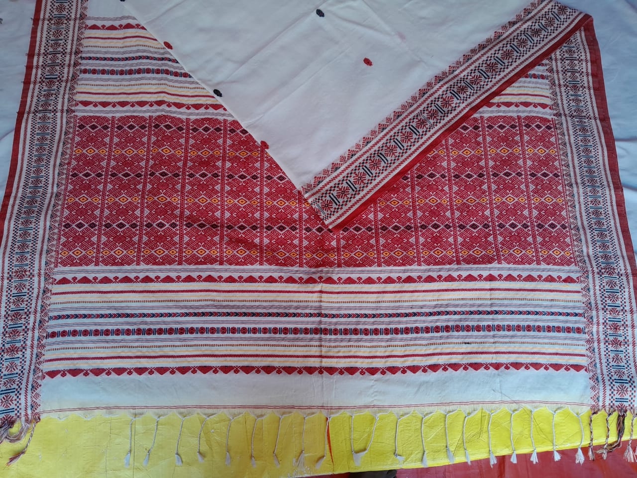 Bengal Tangail saree is known for using finer count yarn & decorated with extra warp designs using coloured yarn.Wweavers normally use 80s to 100s cotton yarn with higher reed count of 72s to 76s. The texture is generally high and compact and sized yarn is used both in warp and weft. The saree is woven with figured motifs in plain ground, with designs of extra warp in border and extra weft in body portion.