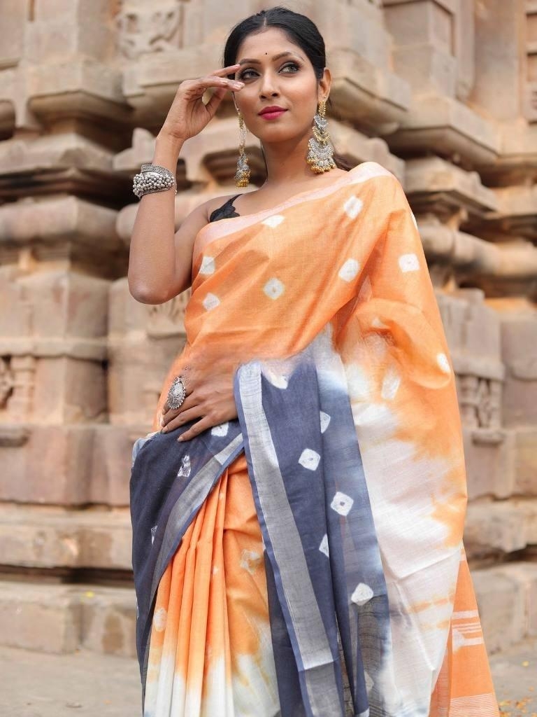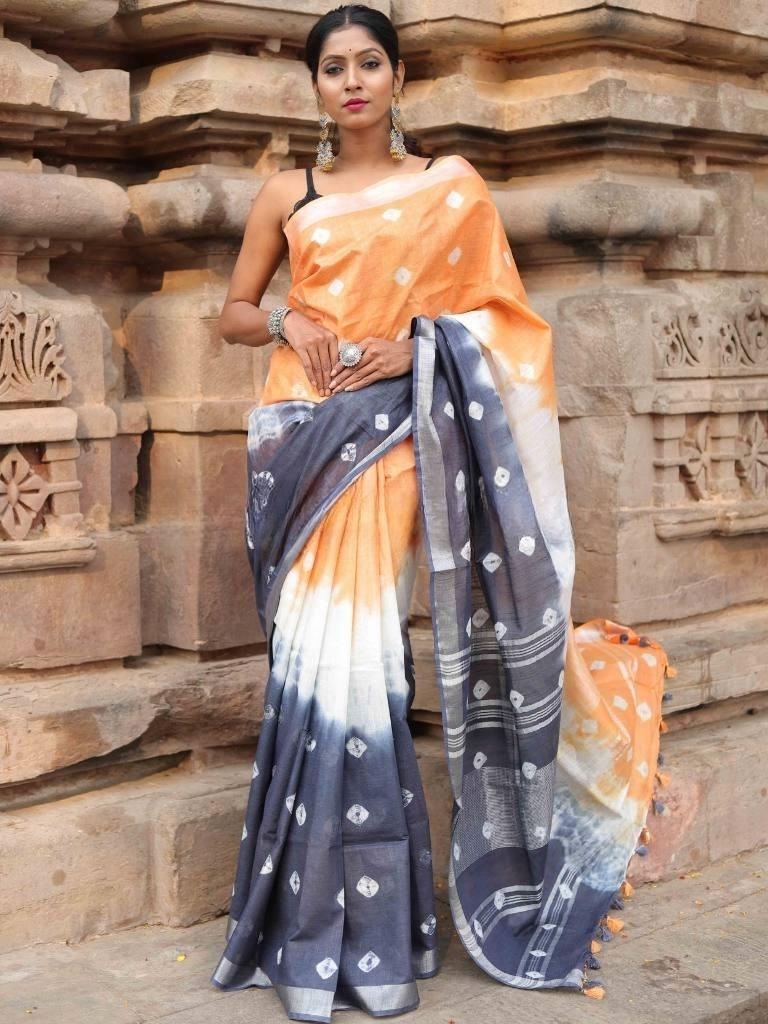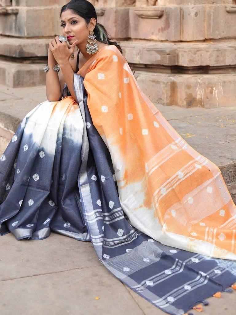 Bhagalpur Pure Linen Cotton Saree | Shibori Pattern | Grey & Peach