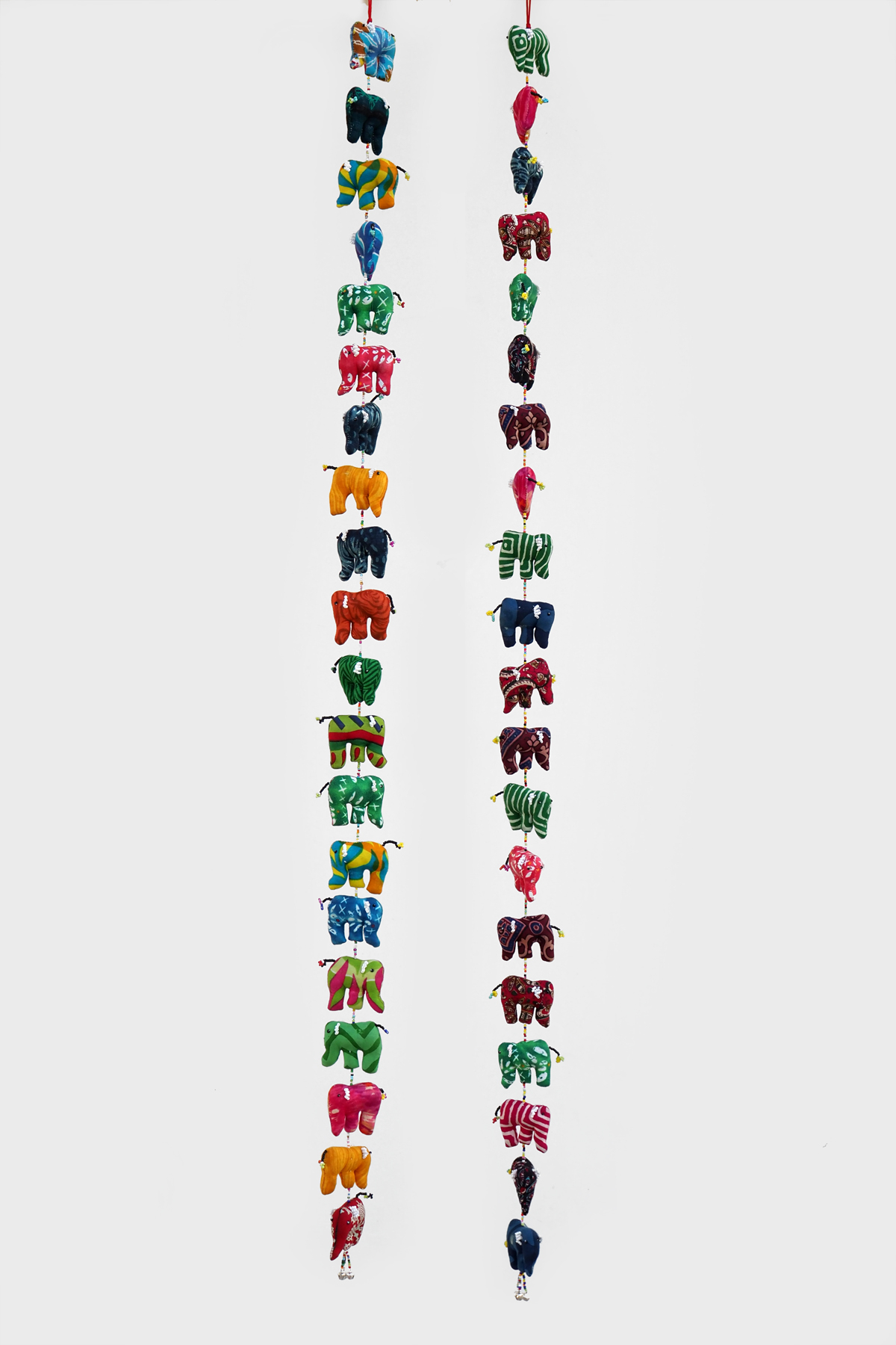 A handcrafted dangler to adorn your home.The elephants are handstiched ,made with pure cotton fabric and the filling used is polyester waste.They are attached together using glass beads in between the elephants.