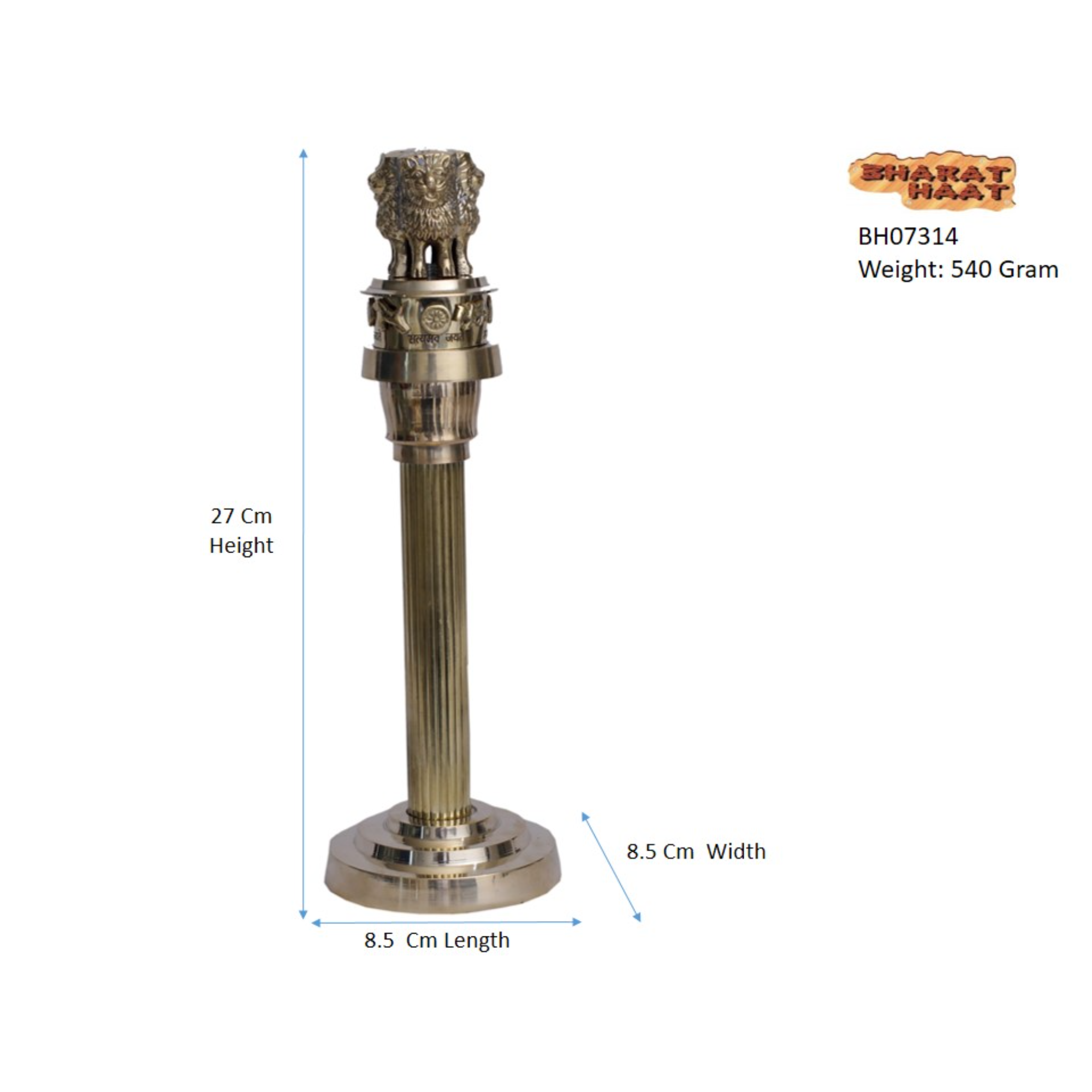 Tall Standing Brass Ashoka Stambh, measuring 3.5 x 3.5 x 11 Inch and weighing 540 grams. A premium brass emblem ideal for décor, gifting, and official spaces.