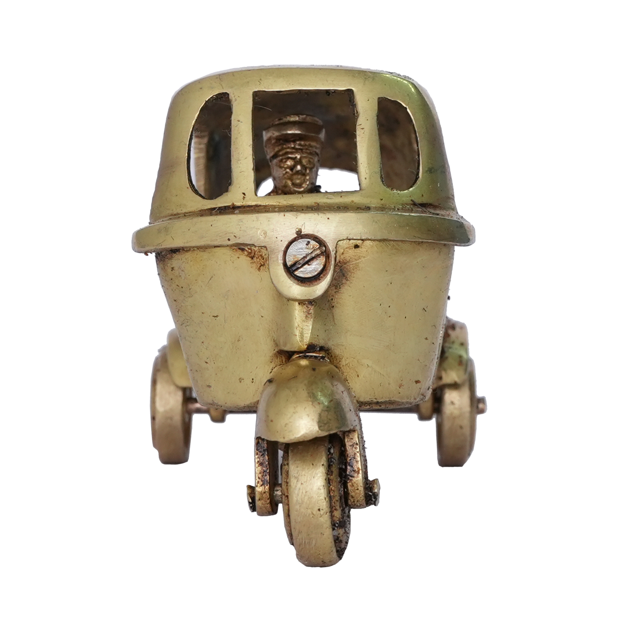 Design: Intricately crafted brass auto rickshaw showcasing detailed traditional miniature artistry