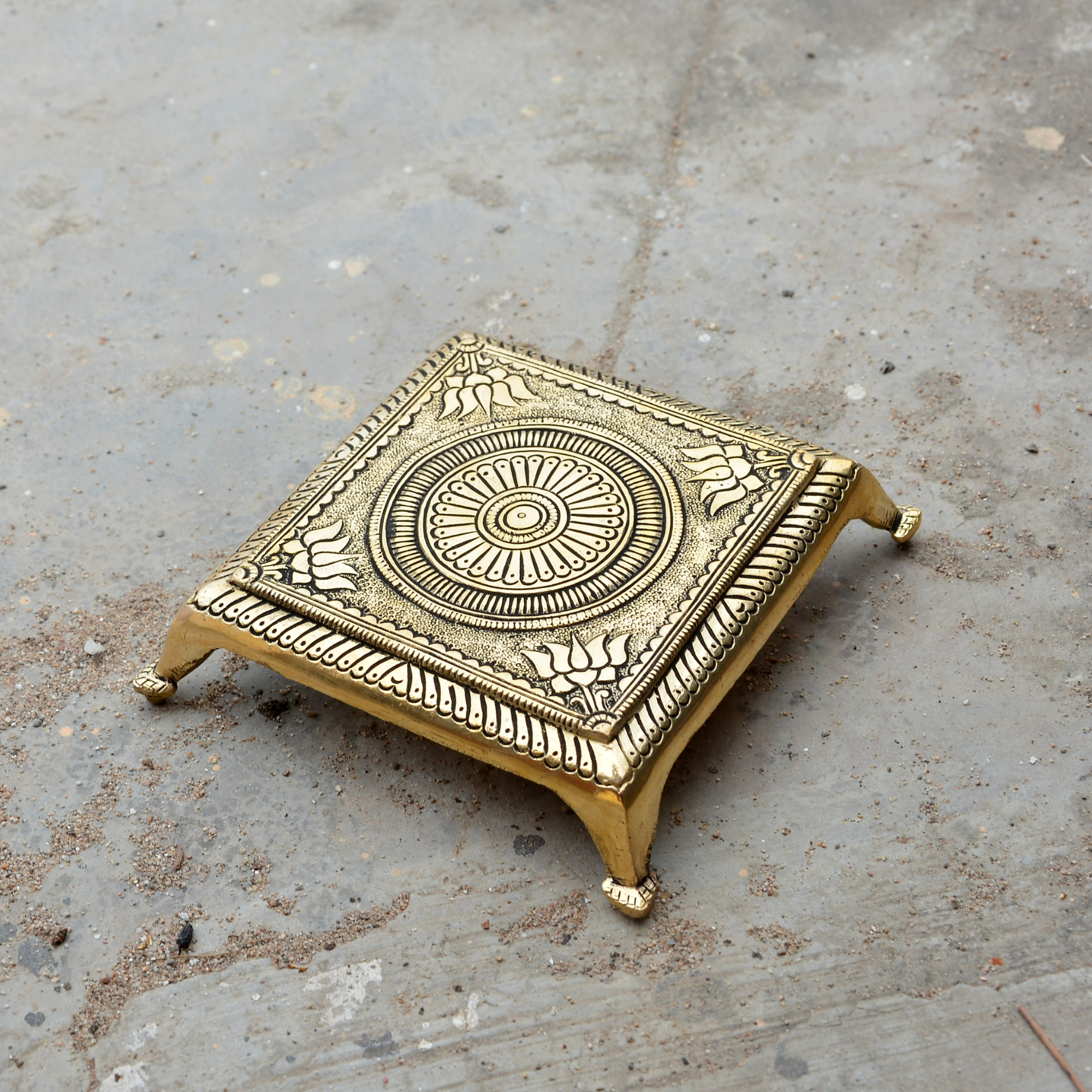 Design: Exquisitely carved brass bajath (chowki) featuring elegant motifs and ethnic artistry.