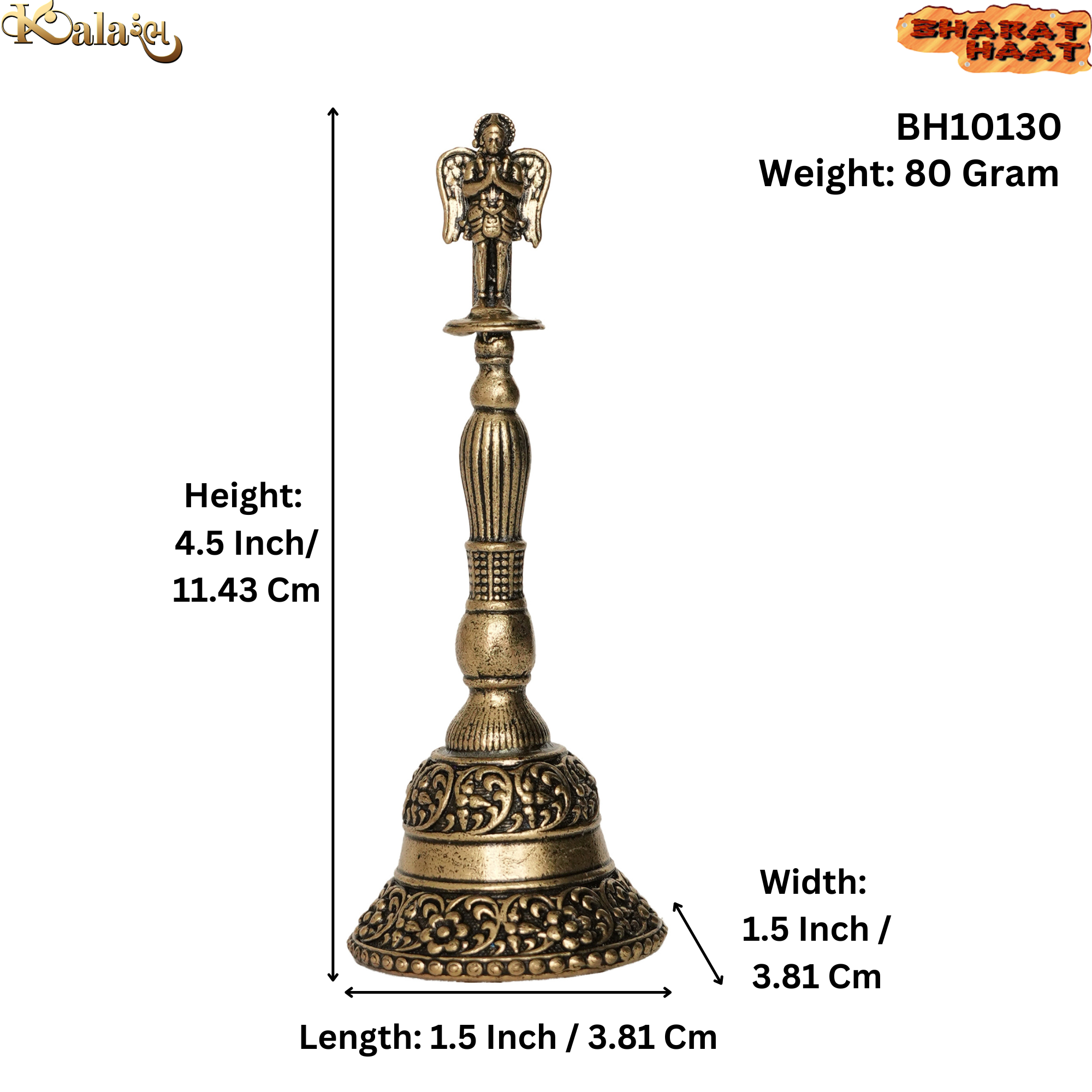 Made from 100% pure brass, this durable and beautifully polished bell is ideal for daily puja rituals, temple aarti, and festive celebrations. The bell measures 1.5 x 1.5 x 4.5 inches (3.81 x 3.81 x 11.43 cm) and weighs 80 grams, making it compact yet powerful in sound. It features a smooth handle and a detailed structure that reflects fine traditional craftsmanship.