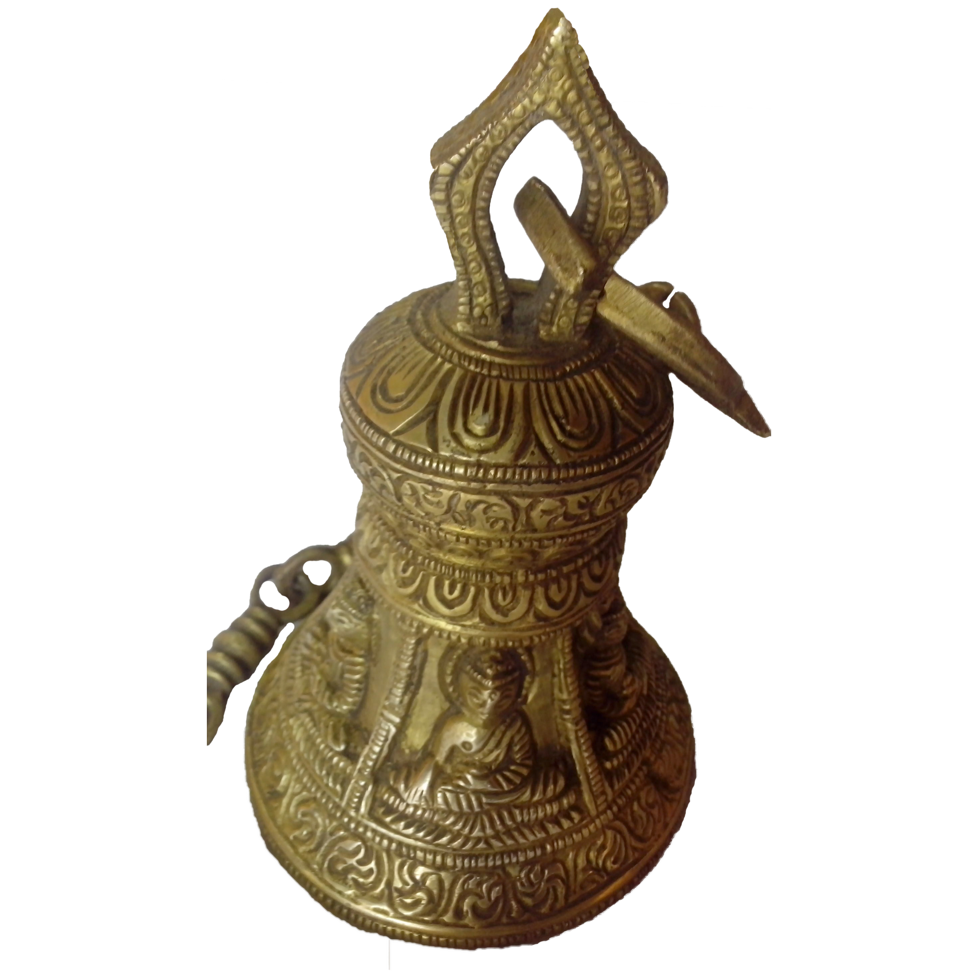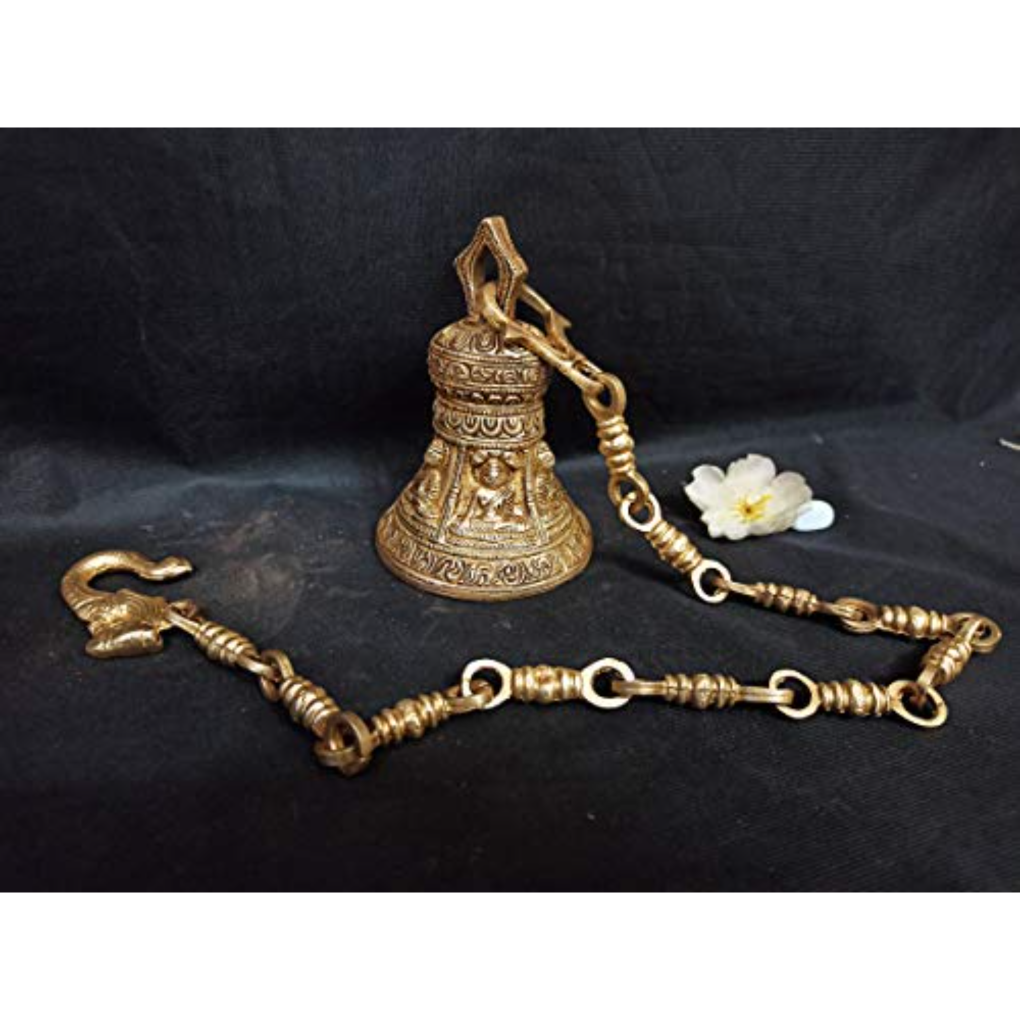 Handcrafted Brass Buddha Bell with fine carving and rich golden tone, ideal for hanging in temples, home altars, or spiritual spaces.