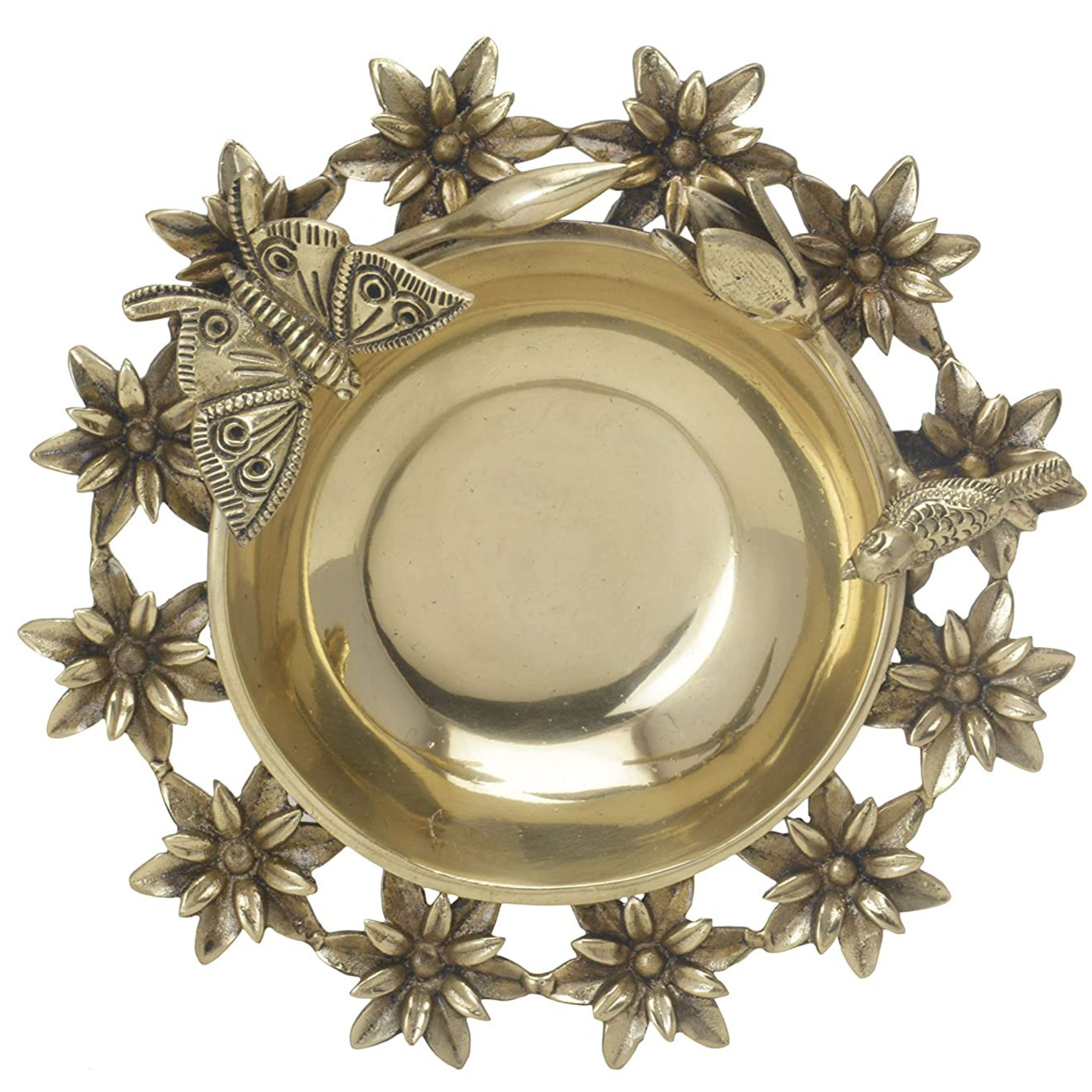 Graceful Brass Butterfly-Sparrow-Flower Urli handcrafted with floral and bird designs for a traditional touch. Ideal for décor, pooja, and gifting. Size: 9 x 9 x 2.5 Inch, Weight: 1.14 Kg, 1 Pc.