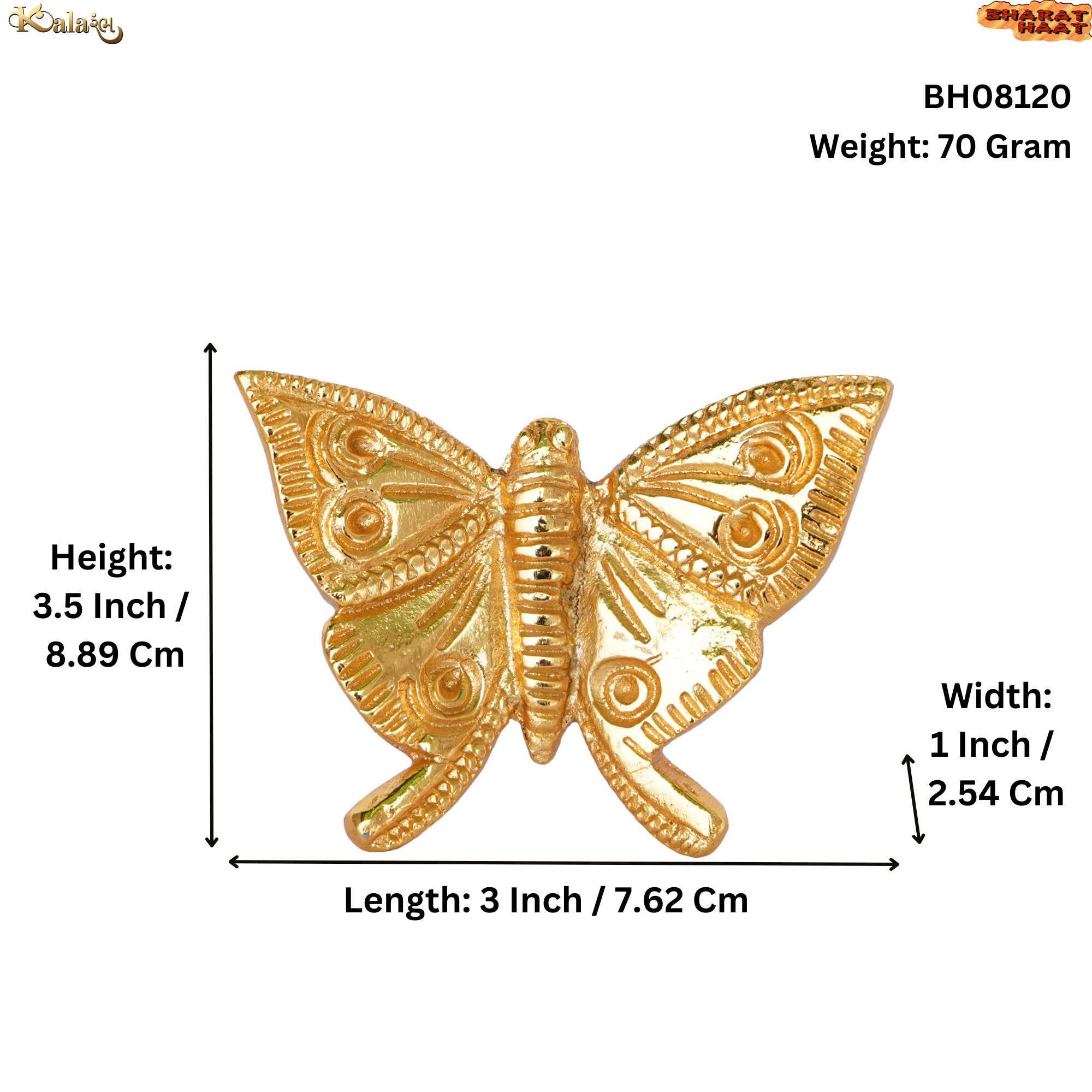 This Brass Butterfly Wall Décor measures 3 x 1 x 3.5 inches (7.62 x 2.54 x 8.89 cm) and weighs 70 grams. A beautifully detailed brass piece, perfect for wall displays, shelves, desks, or as a collectible gift for nature and art lovers.