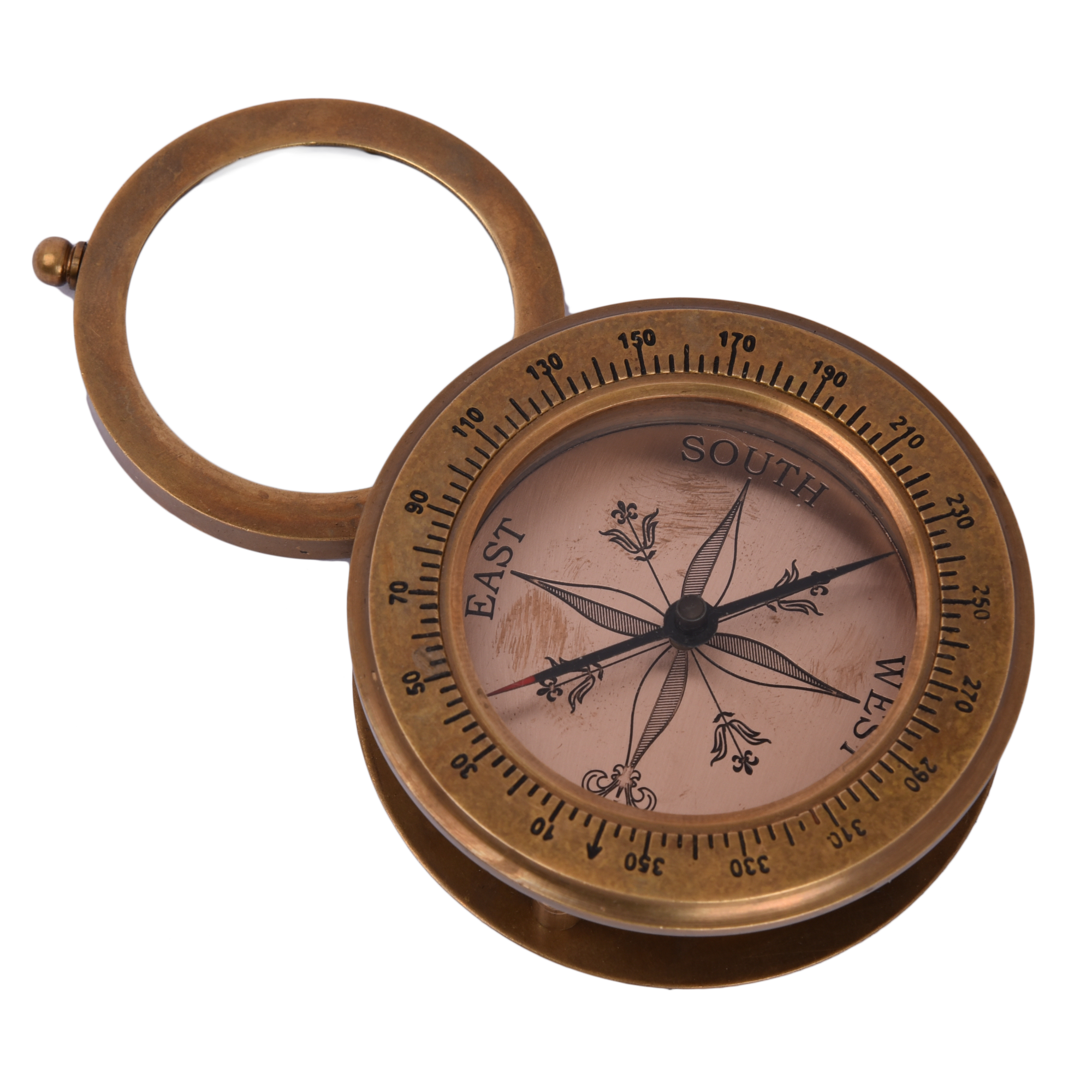 Design: Classic round compass integrated with a foldable magnifying glass for detailed reading and antique charm.