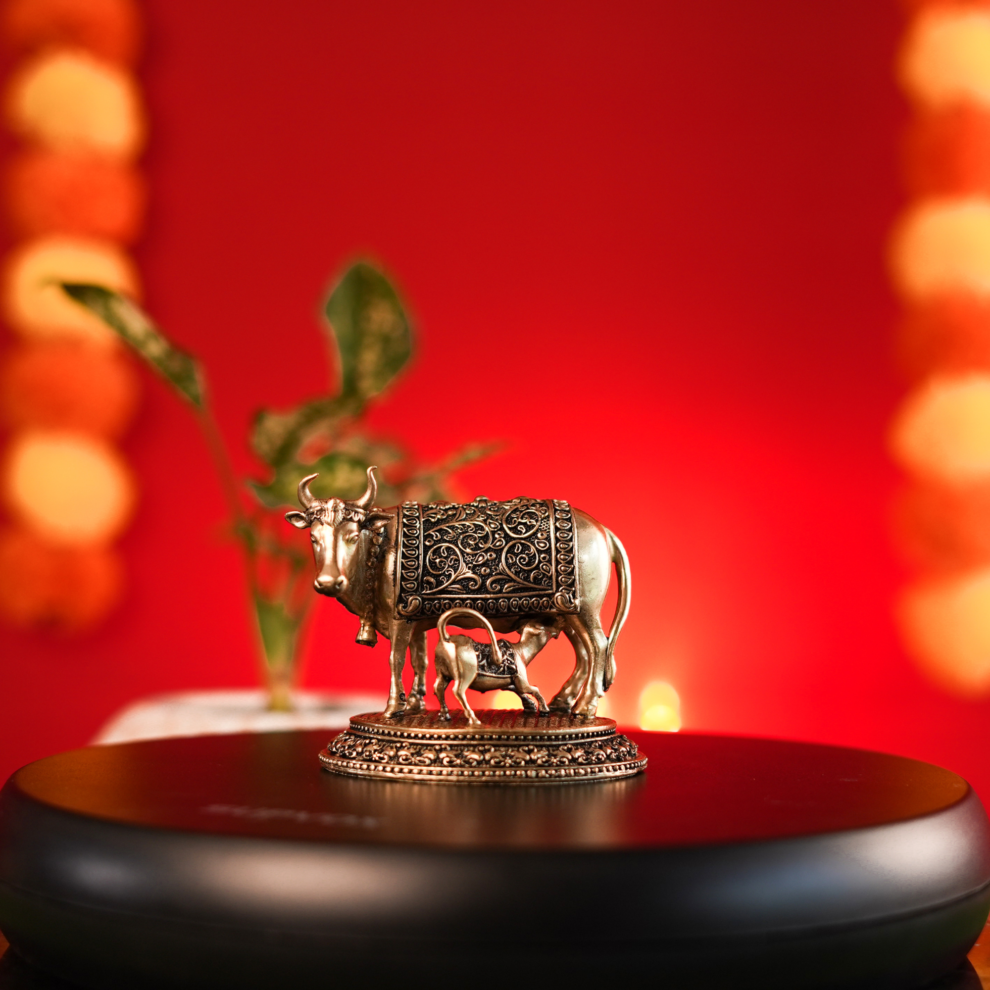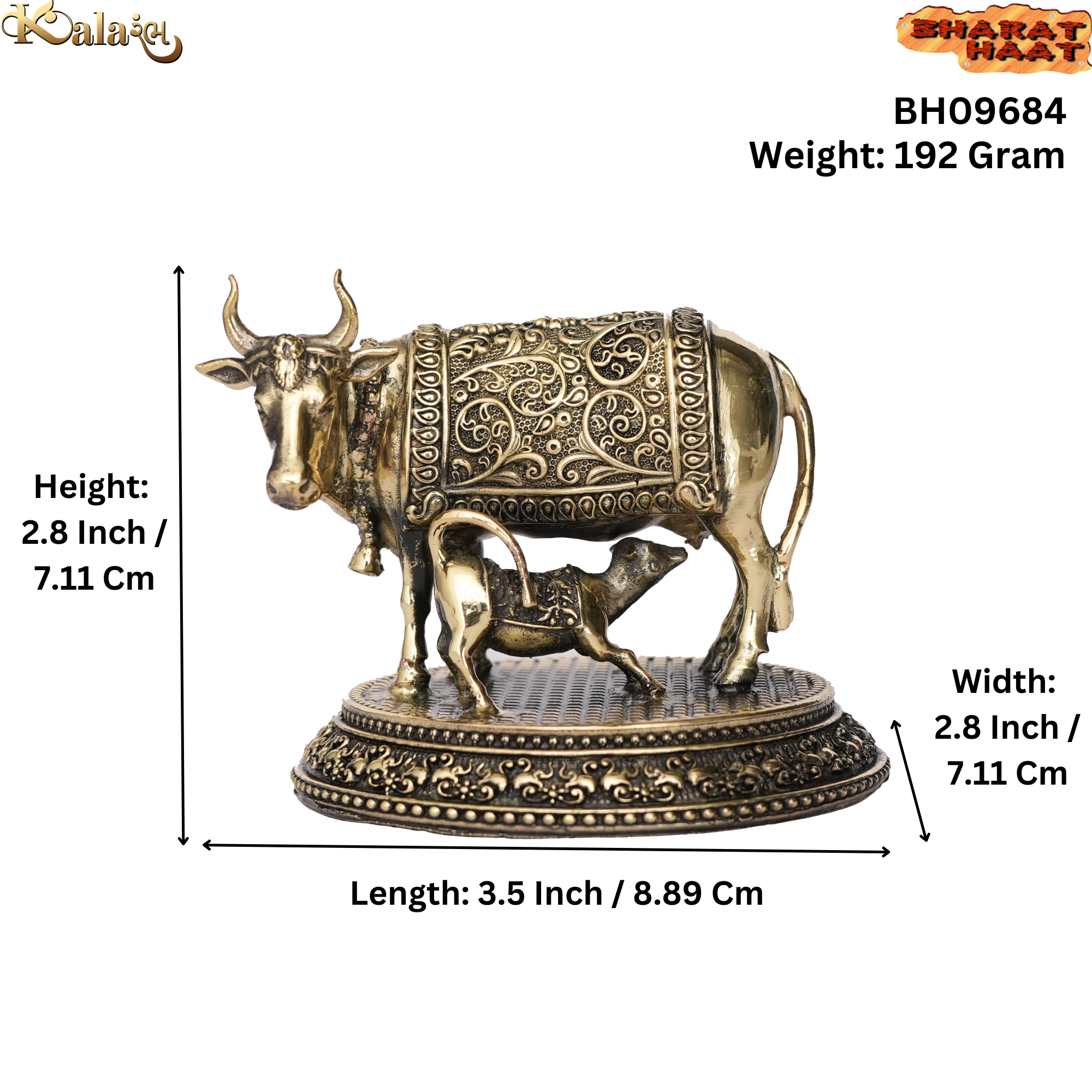 Expertly crafted from premium quality solid brass, this idol showcases intricate detailing of the mother cow and her calf in a graceful posture, radiating warmth and spiritual significance. Measuring 3.5 x 2.8 x 2.8 inches (8.89 x 7.11 x 7.11 cm) and weighing 192 grams, it is compact yet exudes a divine presence that enhances any décor setting. The antique golden finish highlights its traditional beauty and craftsmanship, making it a timeless piece of Indian artistry.