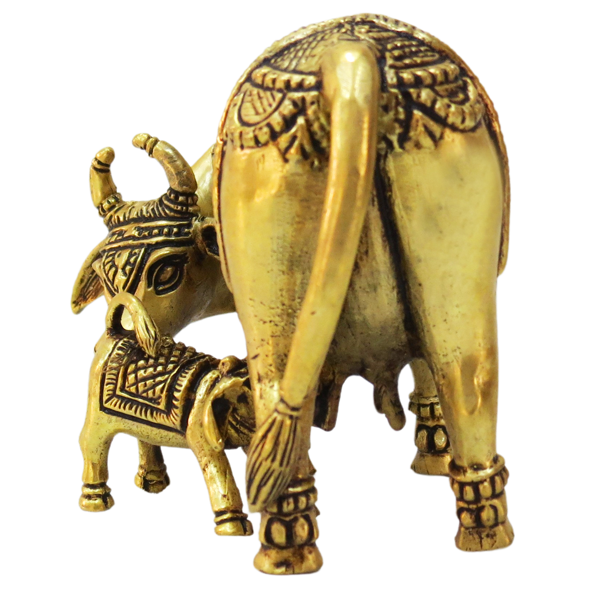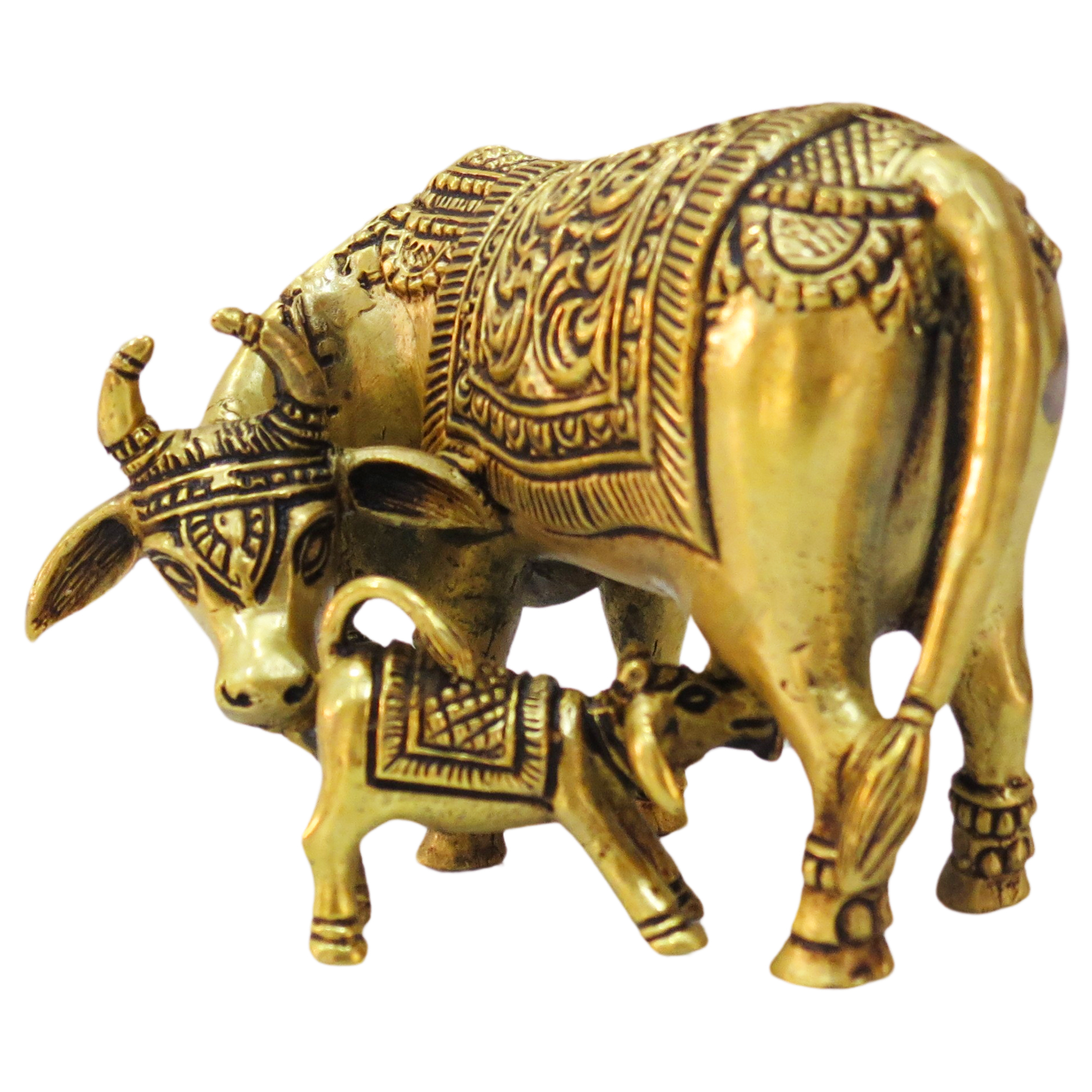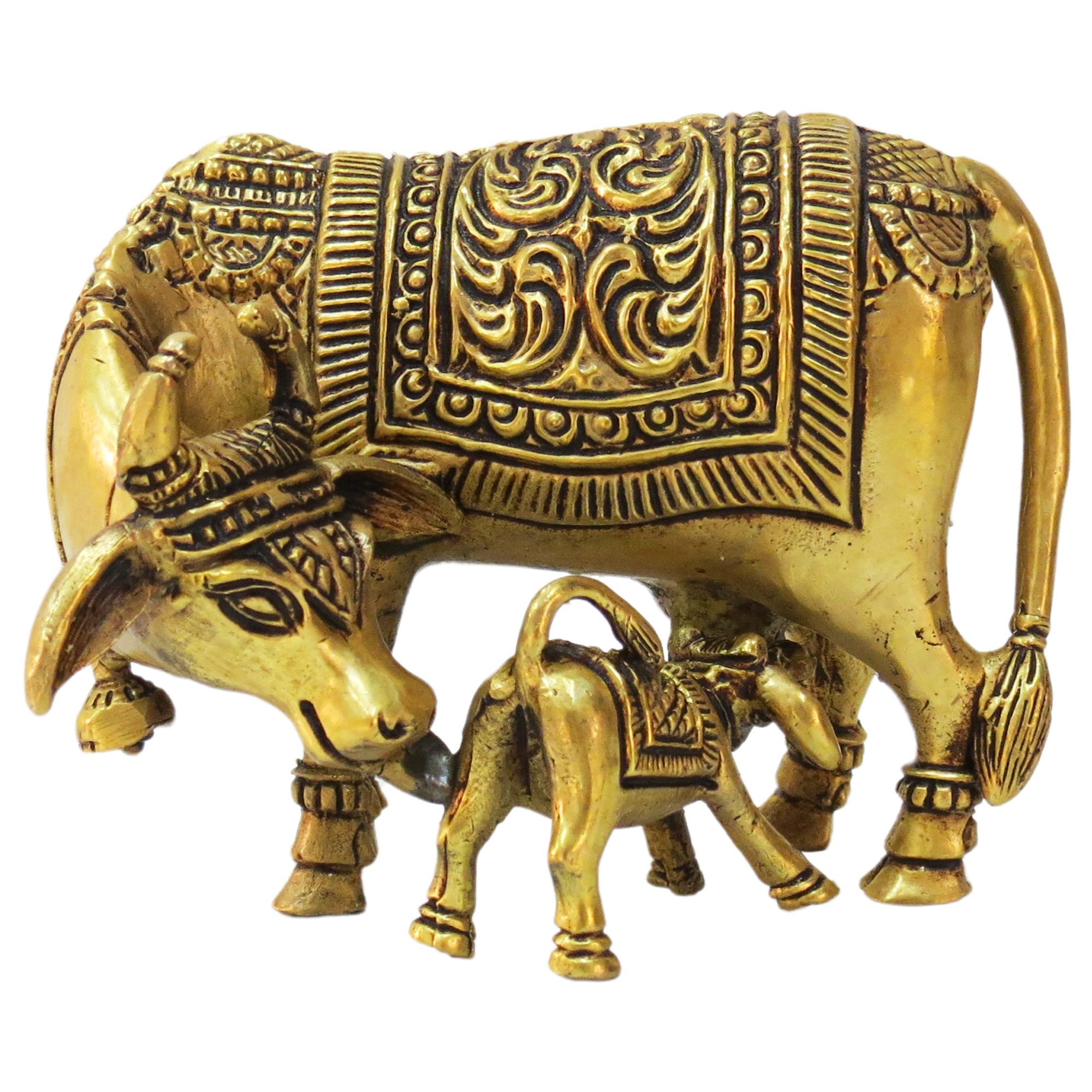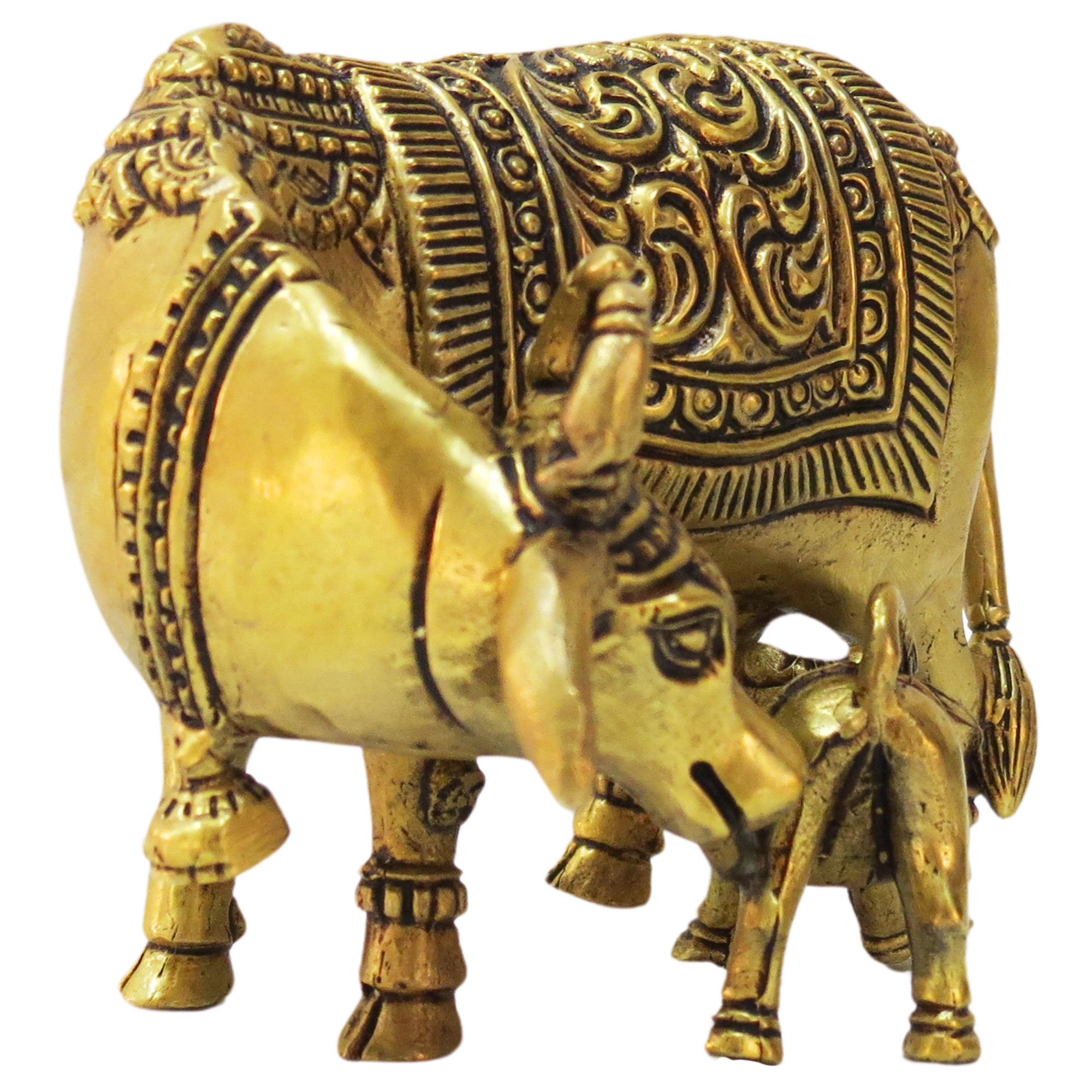 The idol features a mother cow nurturing her calf, signifying love, protection, and nourishment. Every detail, from the facial expressions to the decorative carvings, is meticulously handcrafted by skilled Indian artisans, showcasing the beauty of traditional metalwork.