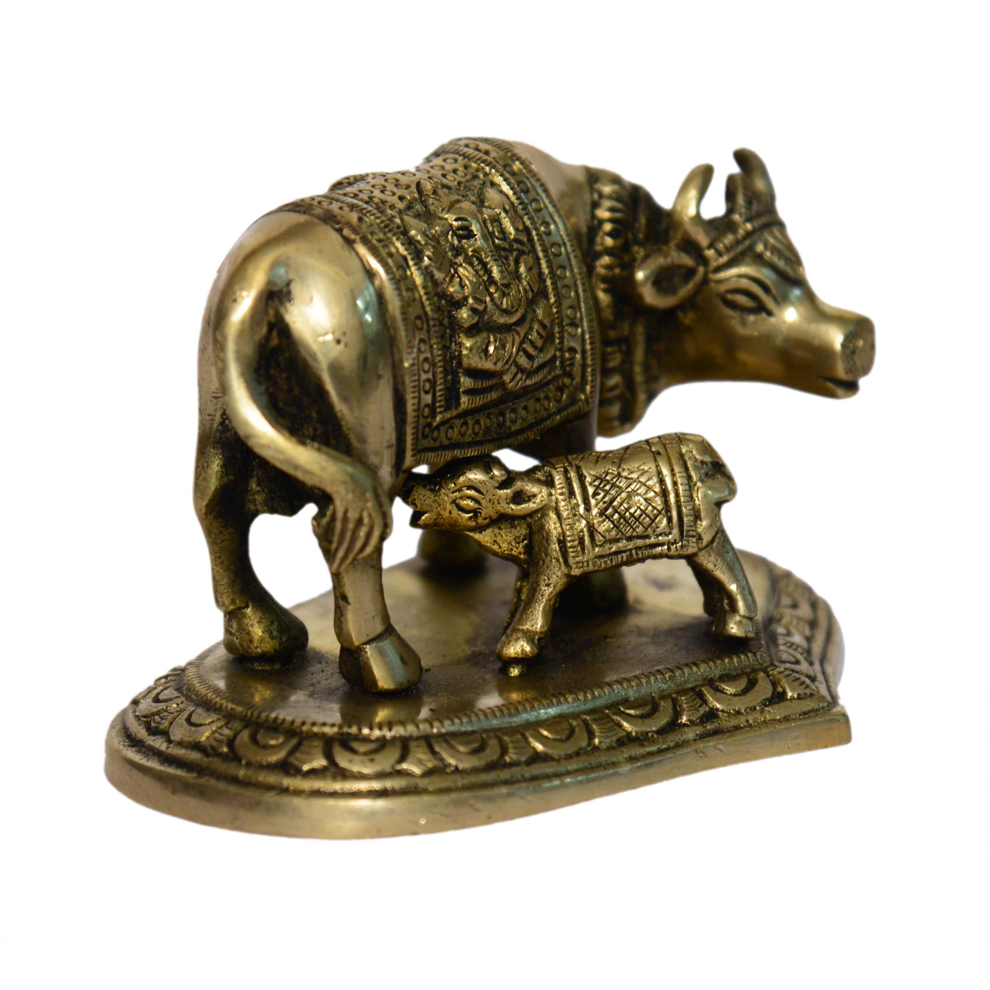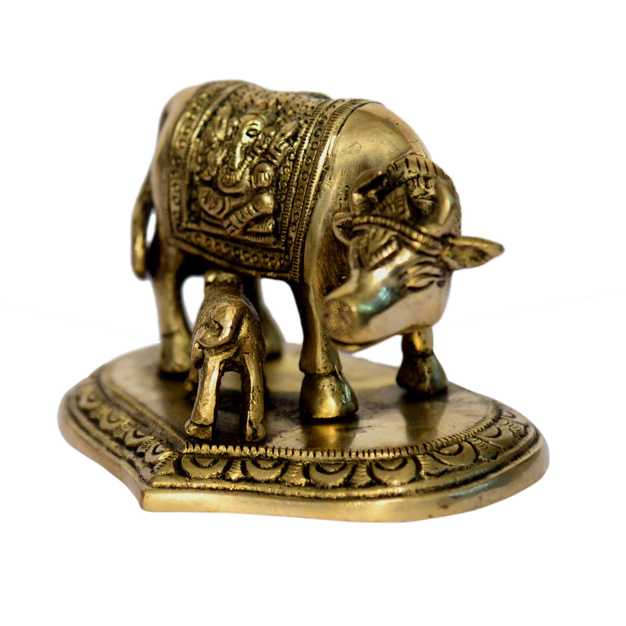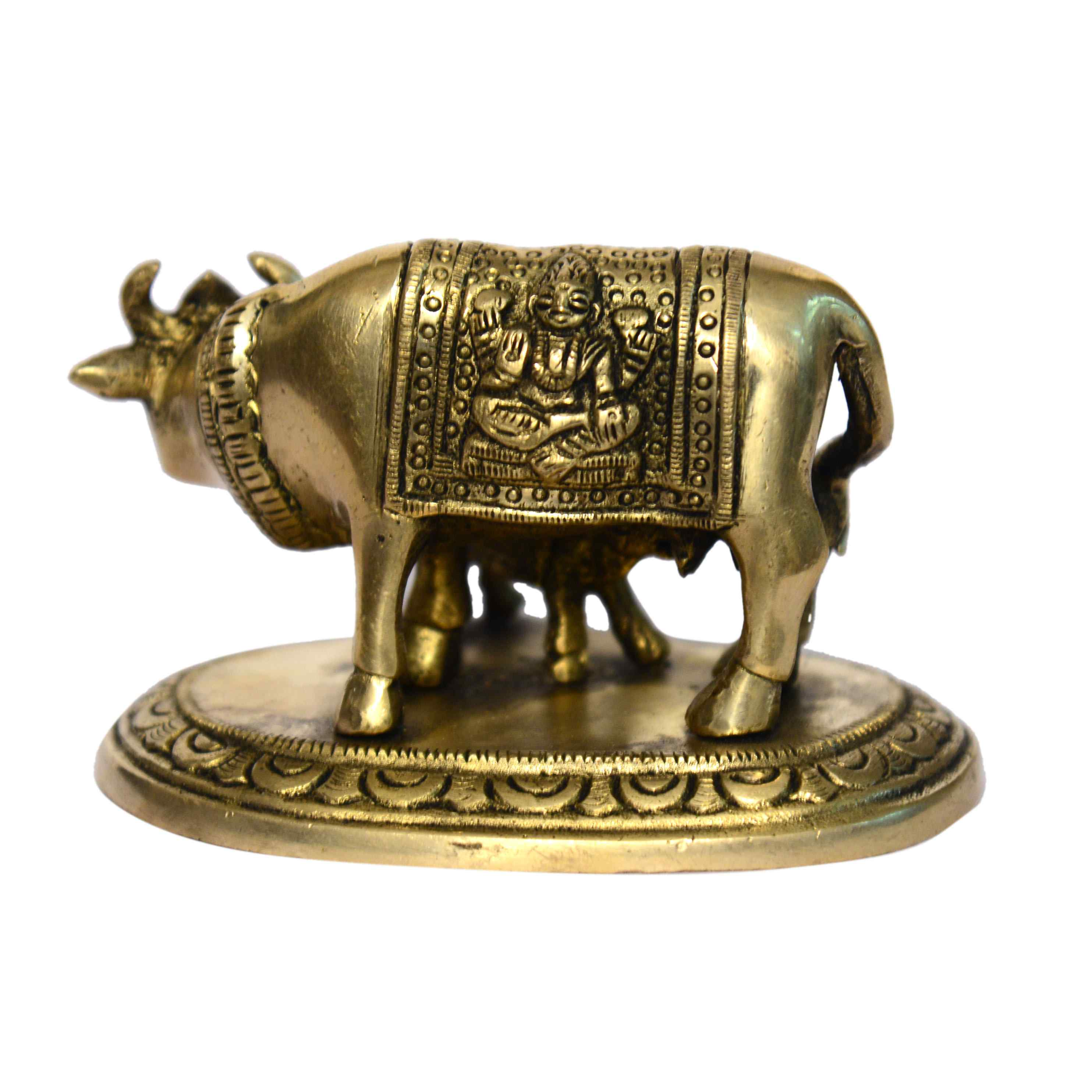 Depicts Kamdhenu cow with her calf (Vachadu) symbolising purity and abundance