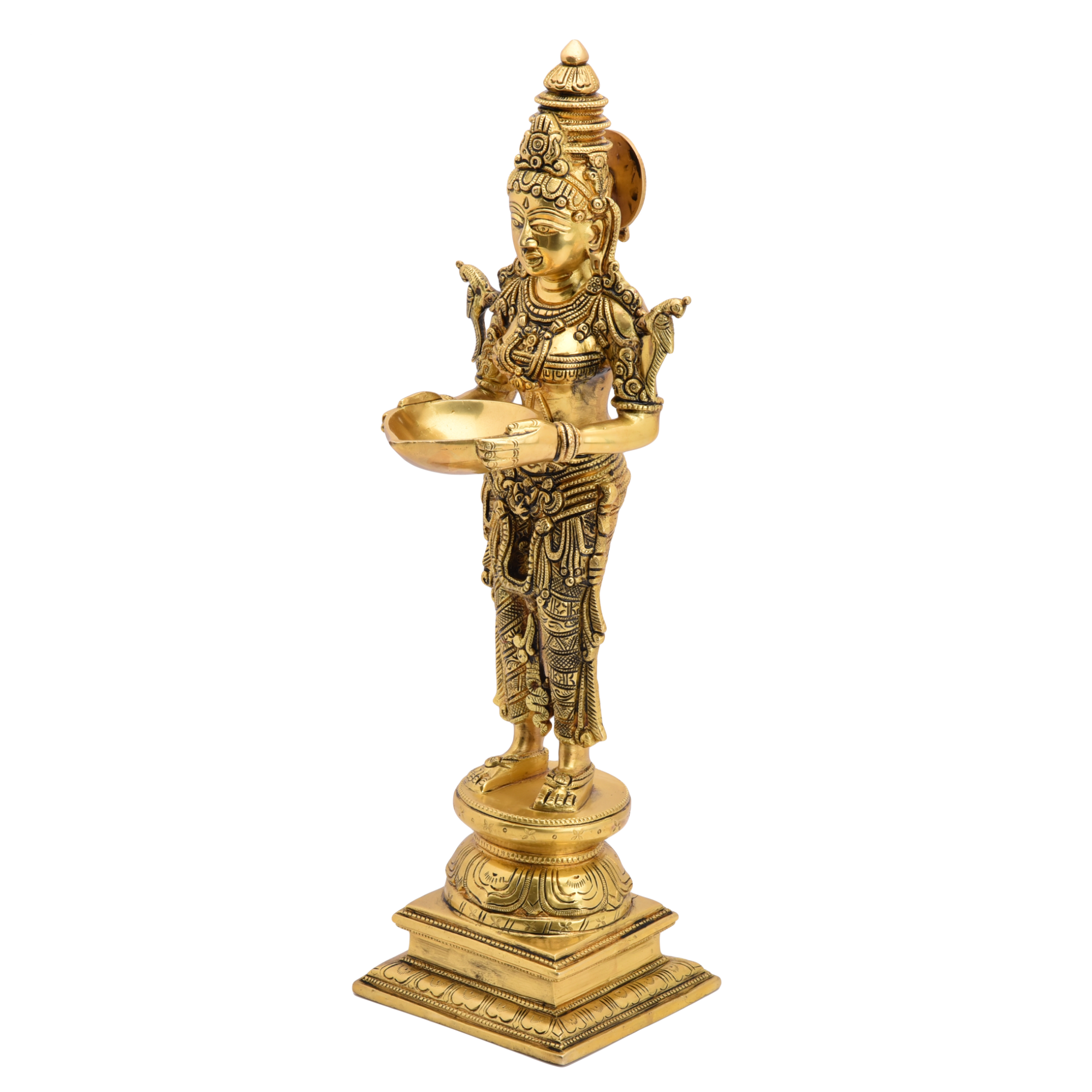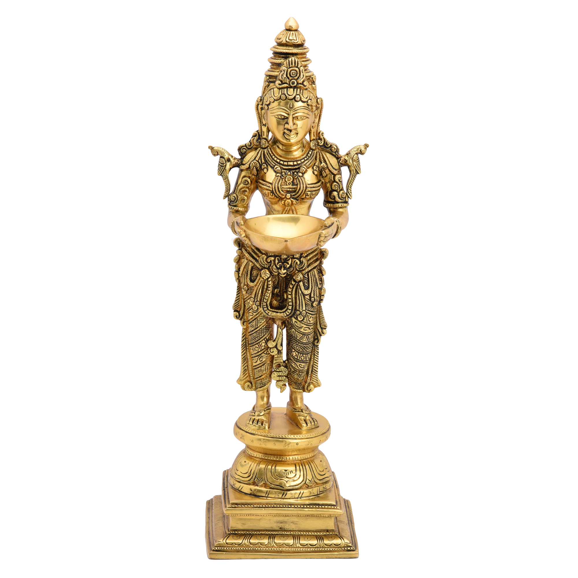Exquisite Brass Deep Lady statue featuring a graceful woman holding a diya, crafted with fine detailing for a traditional yet elegant appeal.