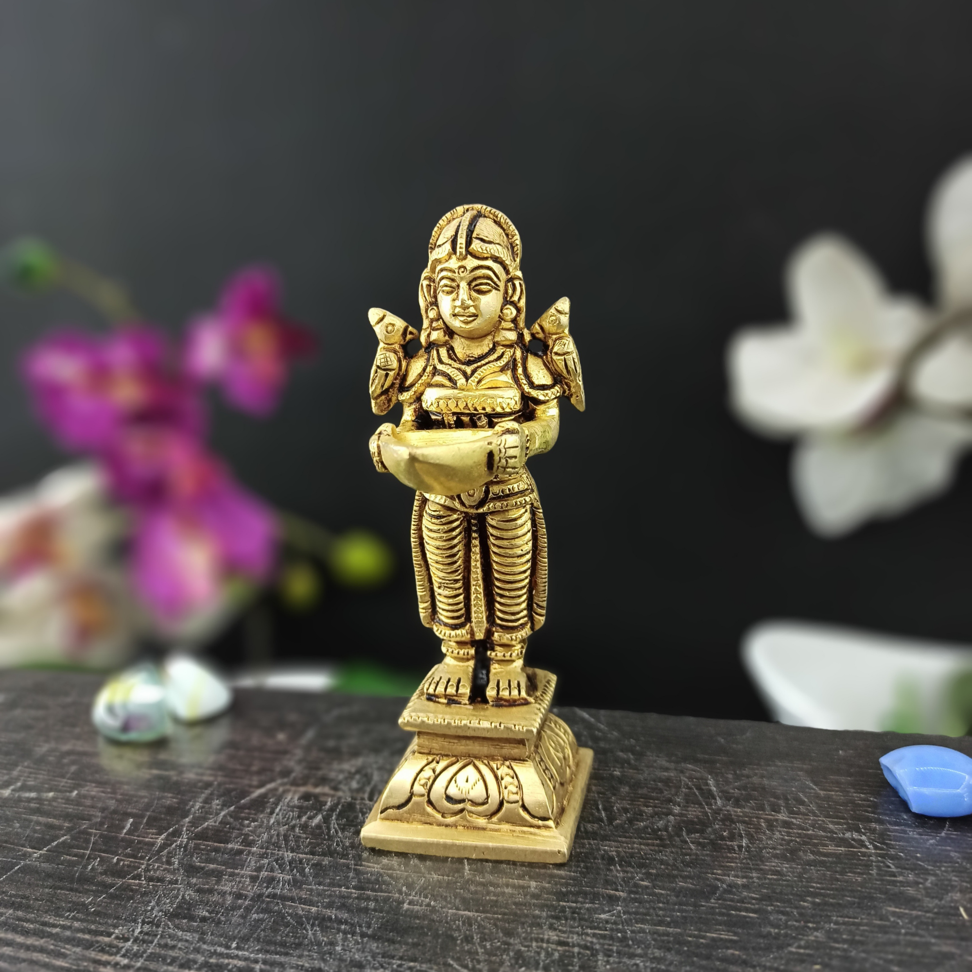 Beautifully crafted Brass Deep Lady Diya with a round base, combining elegance and traditional charm. This 4.3-inch, 250-gram diya is ideal for spiritual décor, meditation spaces, or festive gifting.