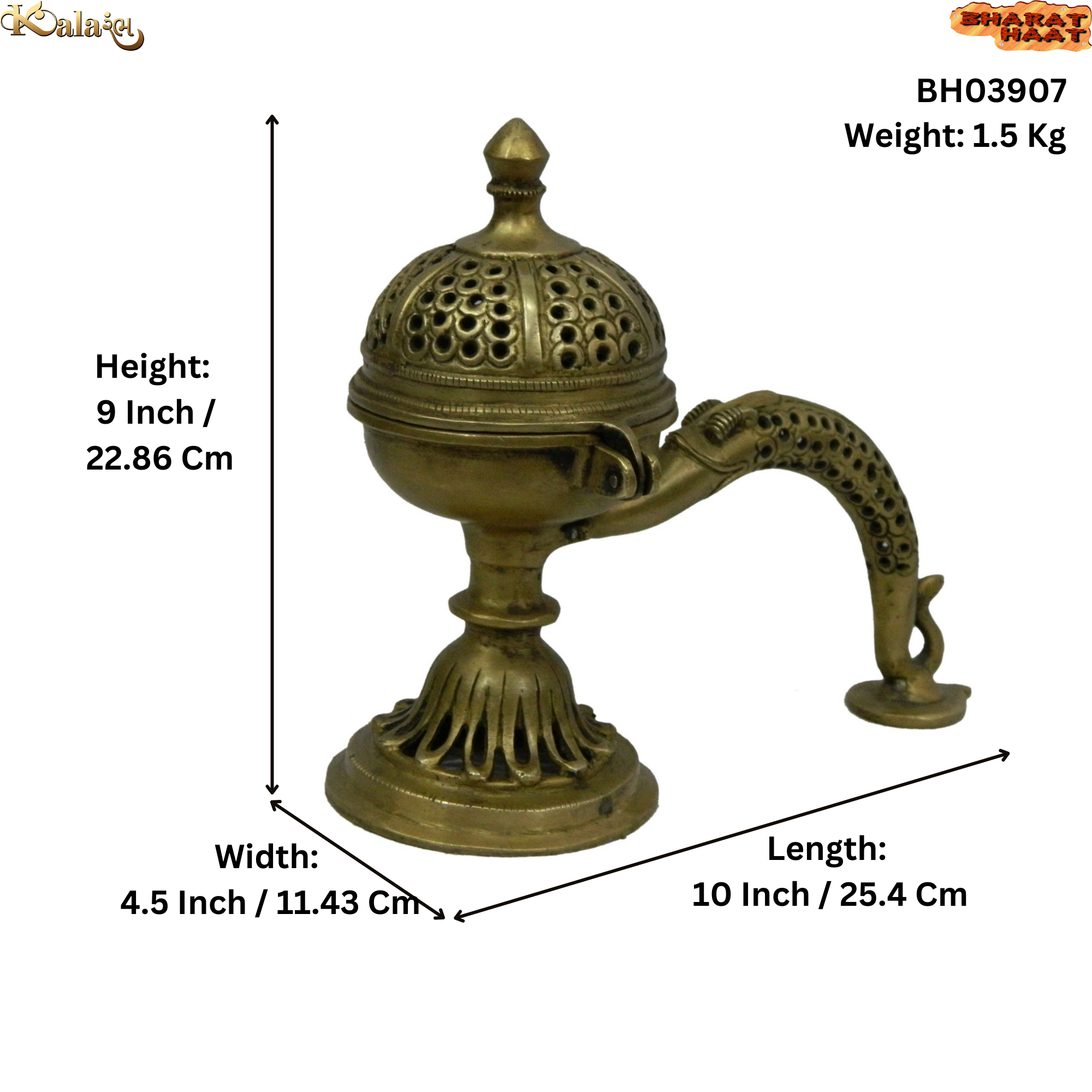 Handcrafted Brass Dhoop holder for home temples, meditation, or décor. Size: 10 x 4.5 x 9 inches, weight: 1.5 Kg, made from premium brass with intricate detailing.
