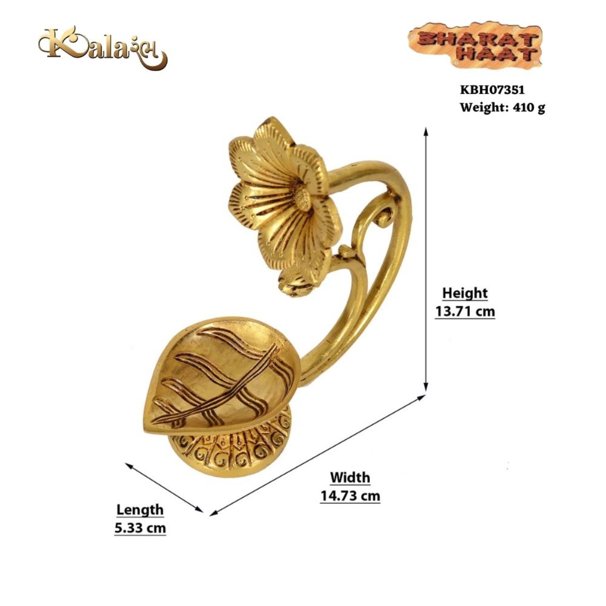 Brass Diya With Flower with dimensions 2.1 x 5.8 x 5.4 Inch and weight 410 Gram. A beautifully designed brass diya with flower motif, perfect for spiritual ambiance and home décor.