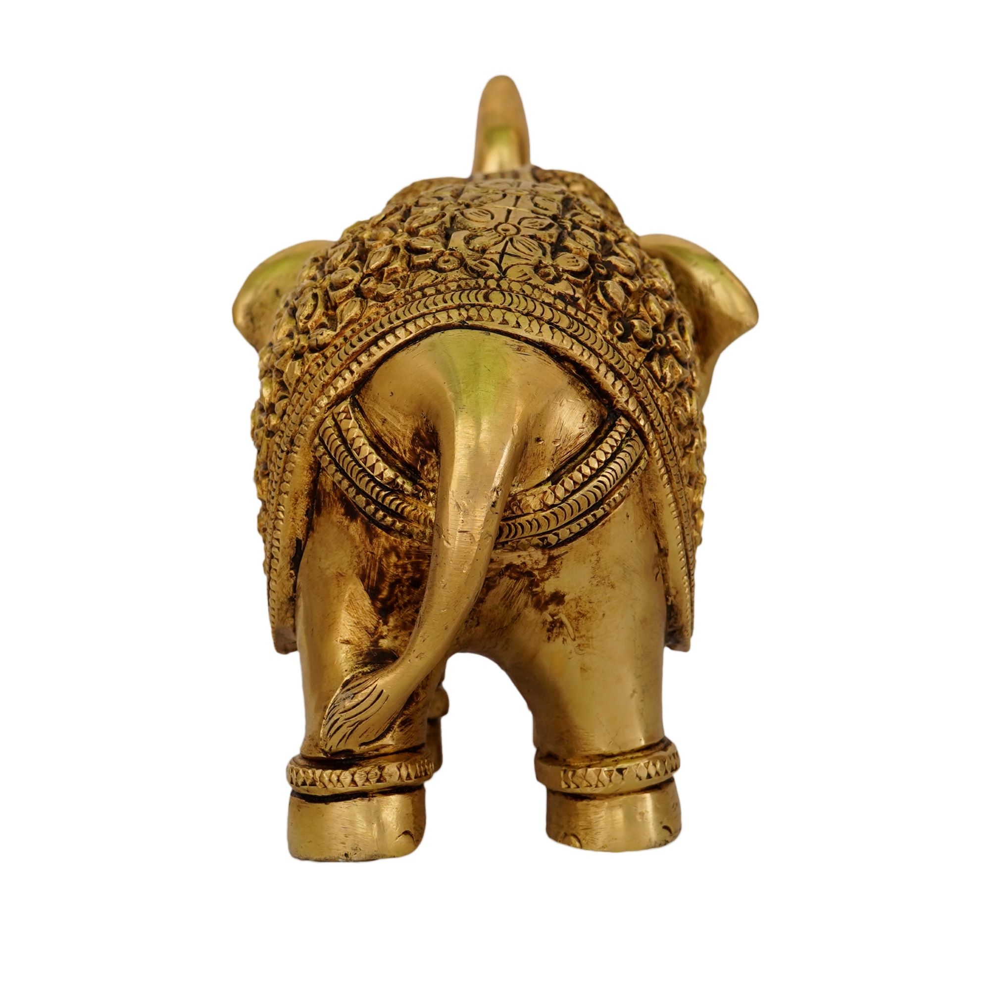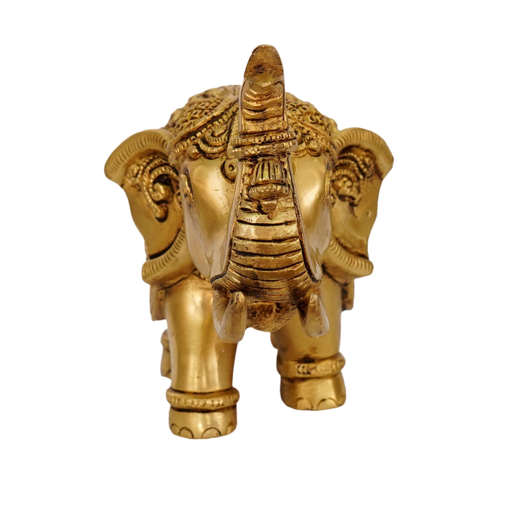 The detailed carving highlights the elephant’s realistic features, including the trunk, tusks, and decorative motifs, reflecting the skill of traditional Indian artisans. The polished brass finish adds a luxurious golden glow, making it both a decorative centerpiece and a spiritually significant idol. In Hindu culture, elephants are revered as symbols of Ganesha’s blessings, bringing luck, removing obstacles, and attracting wealth and positive energy.