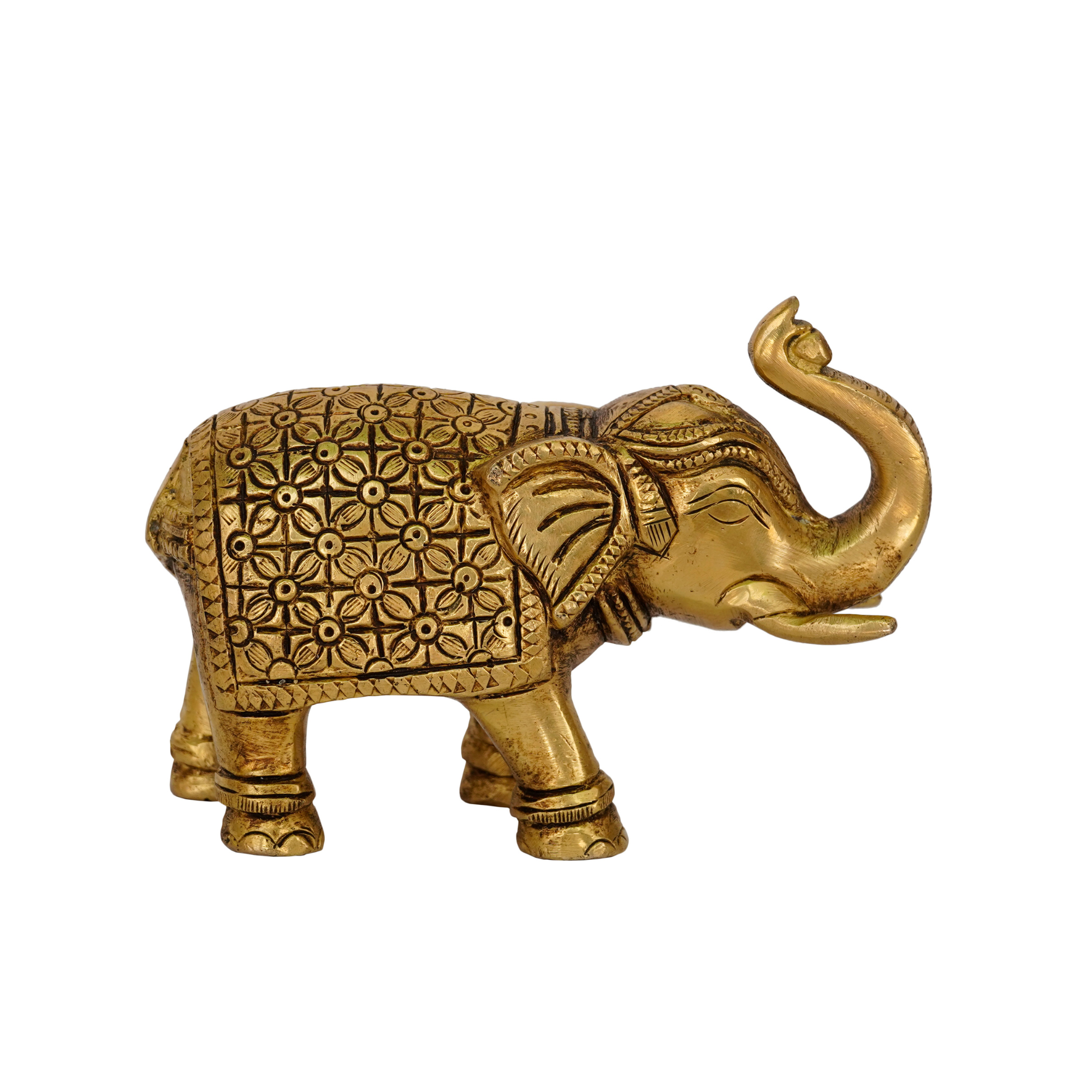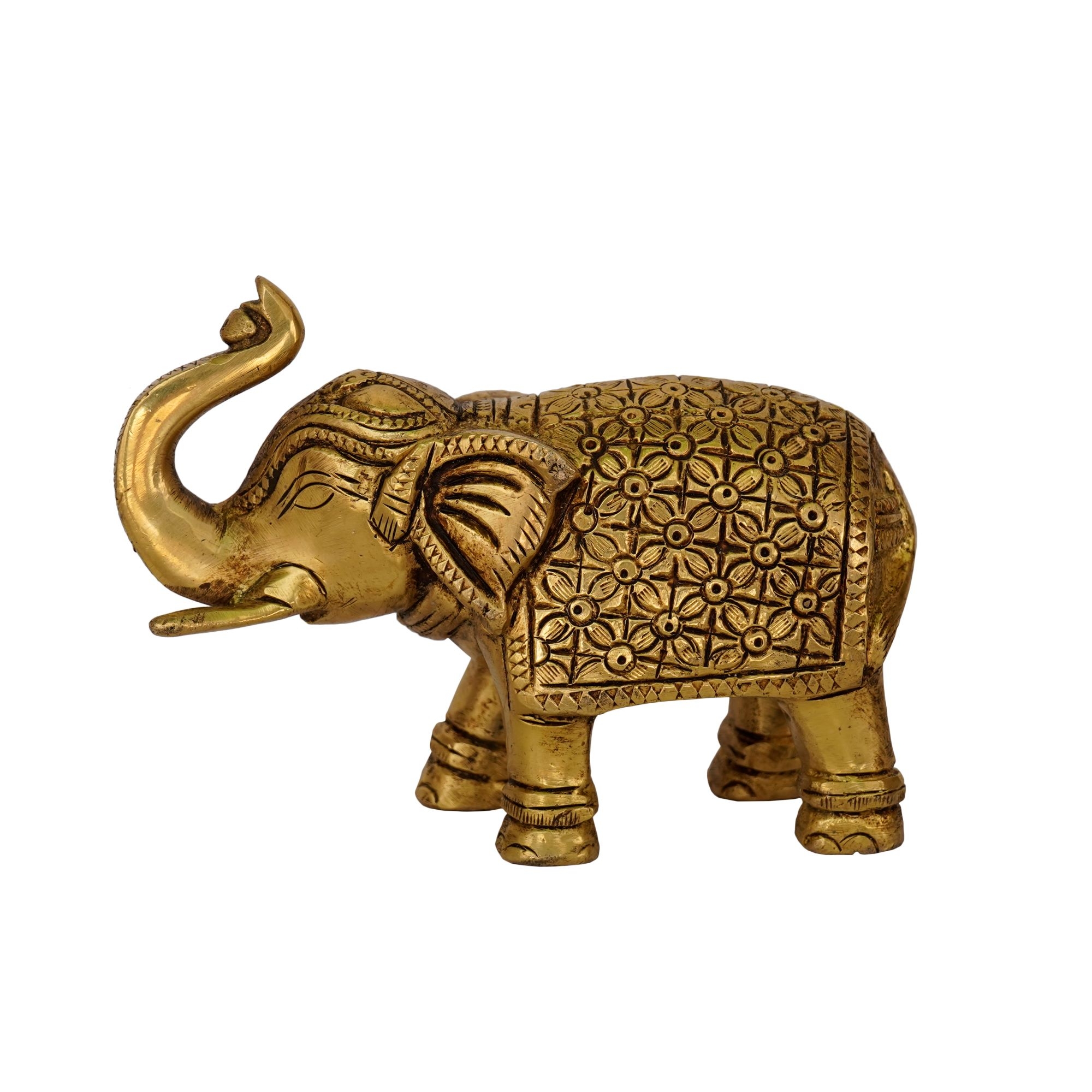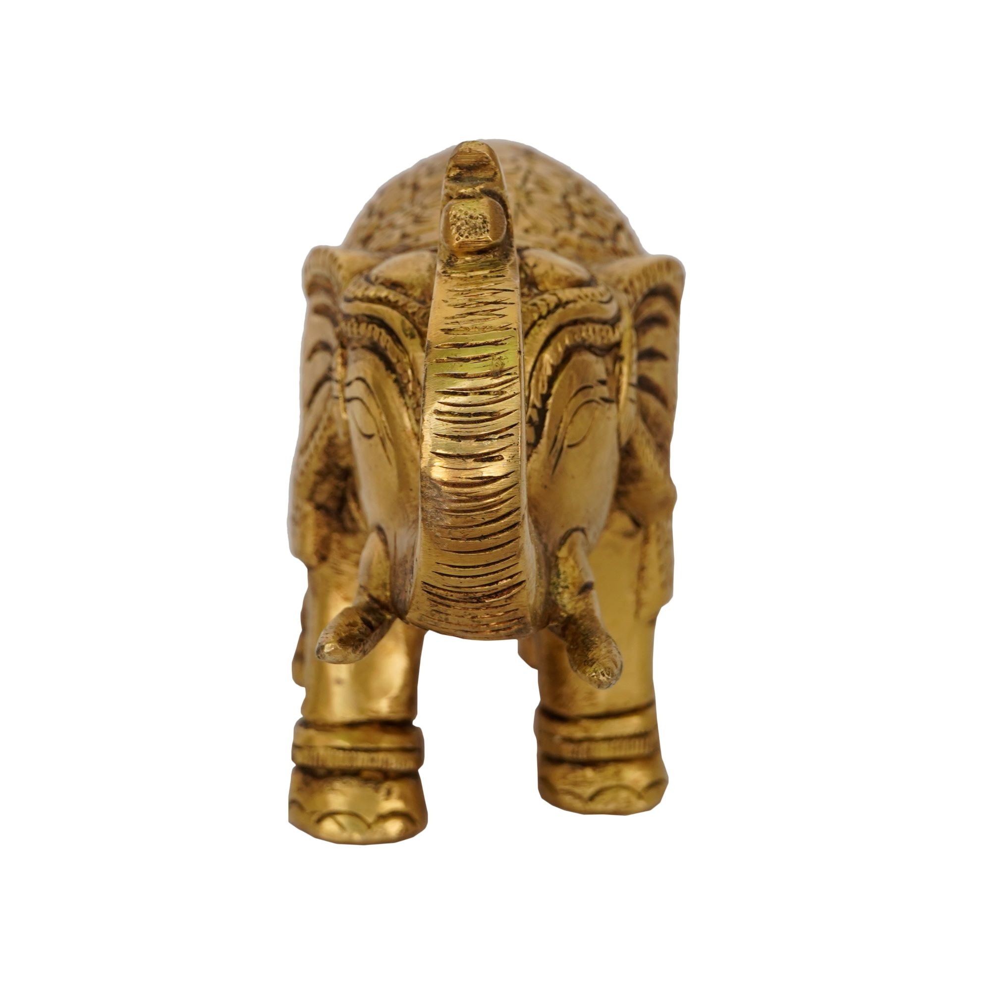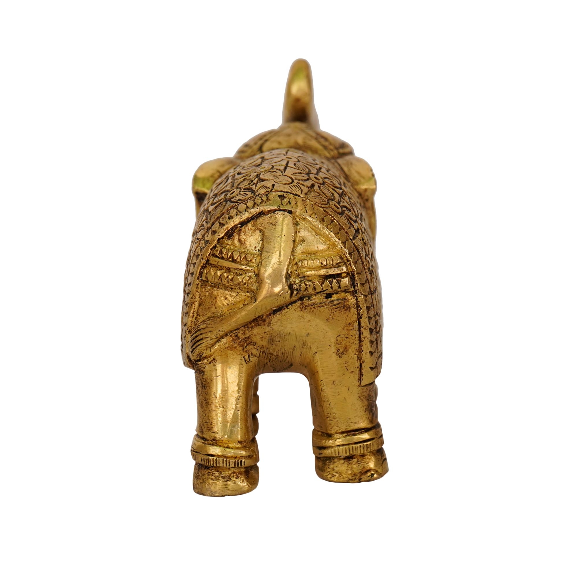 Enhance your home, temple, or office décor with this Handcrafted Brass Elephant Statue, a symbol of wisdom, strength, and prosperity. Made from pure brass, this elegant statue captures the majestic form of an elephant, revered in Indian culture as a bringer of good fortune and remover of obstacles. Measuring 5 x 2 x 3.5 inches and weighing 875 grams, it is perfectly sized for display on shelves, mantels, or home temples.