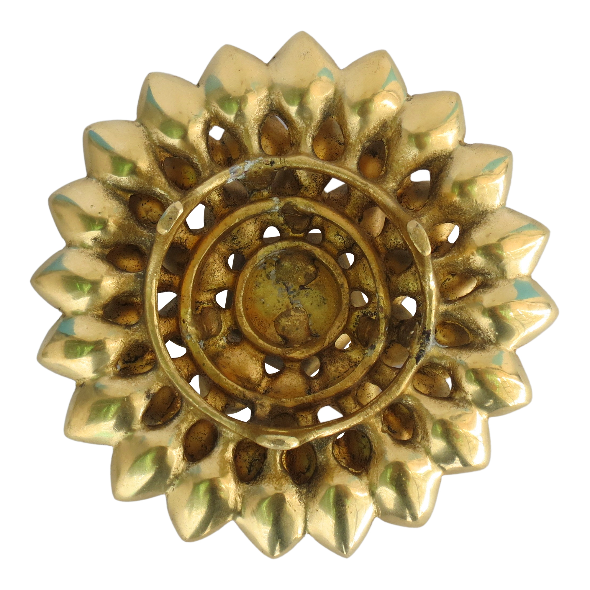 Design: Beautiful flower-shaped brass diya featuring 3 round oil lamps for puja and festive décor