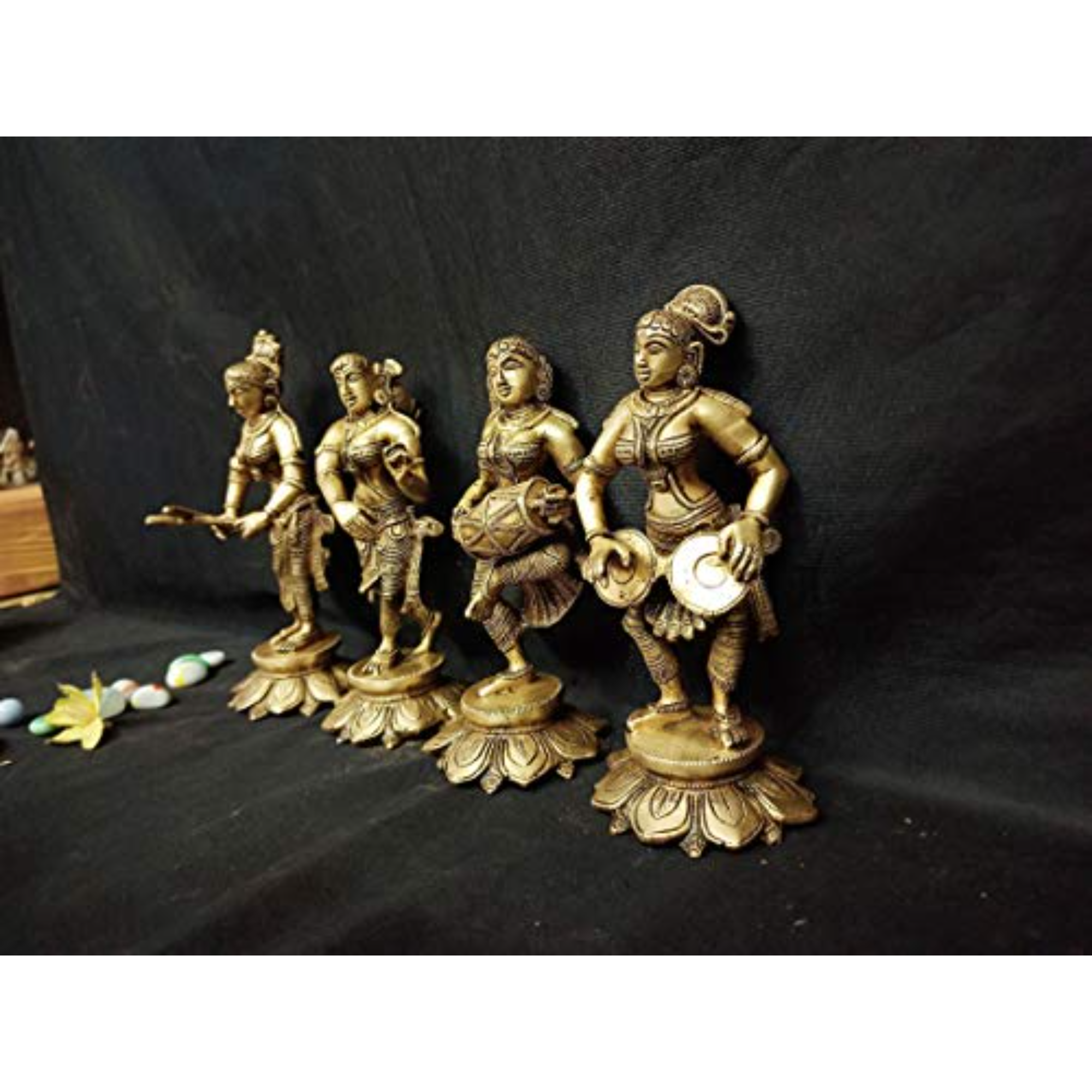 Each figurine is meticulously crafted, showcasing intricate details in the ladies' attire, musical instruments, and poses. The set measures 13 x 3 x 8 inches and weighs a substantial 5.06 kg, reflecting authentic solid brass construction and superior craftsmanship.