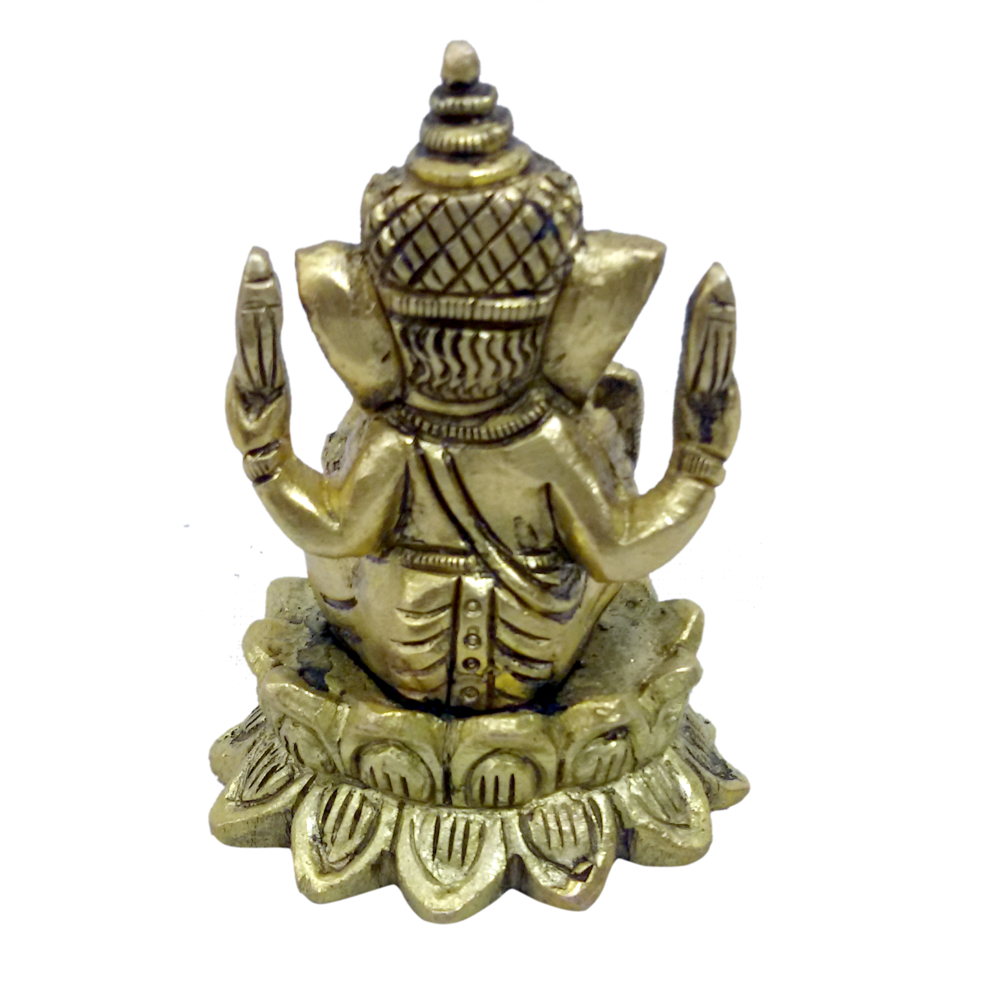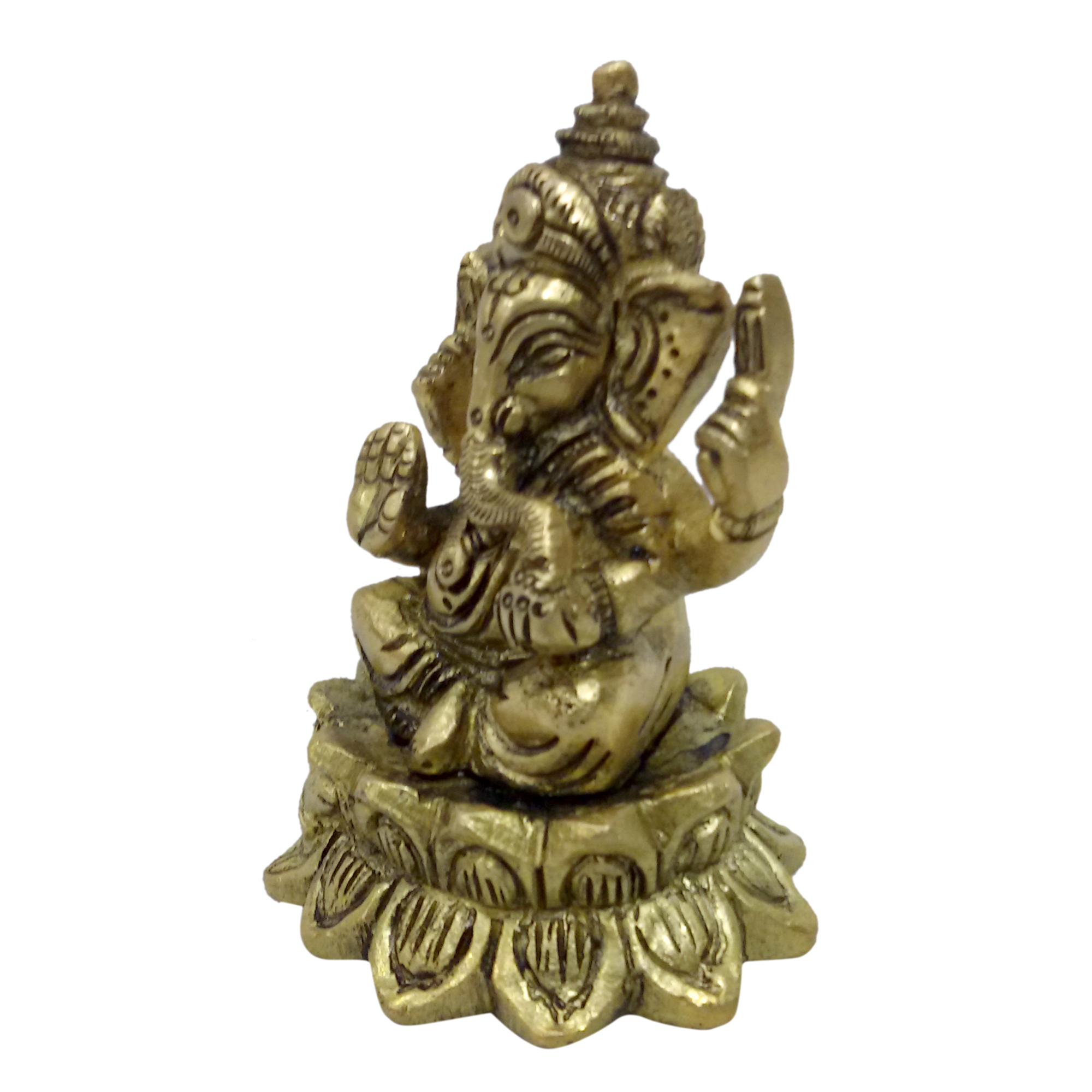Exquisitely crafted brass Ganesh idol in a sitting pose on Kamal.