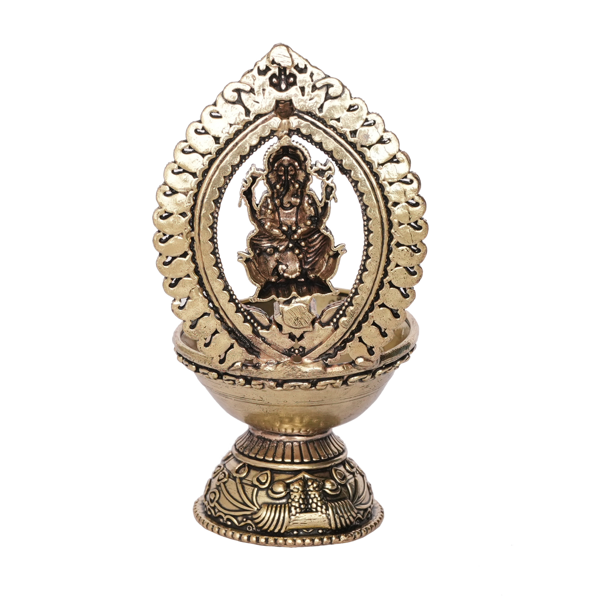 Features a beautifully crafted Lord Ganesha figure above a traditional diya