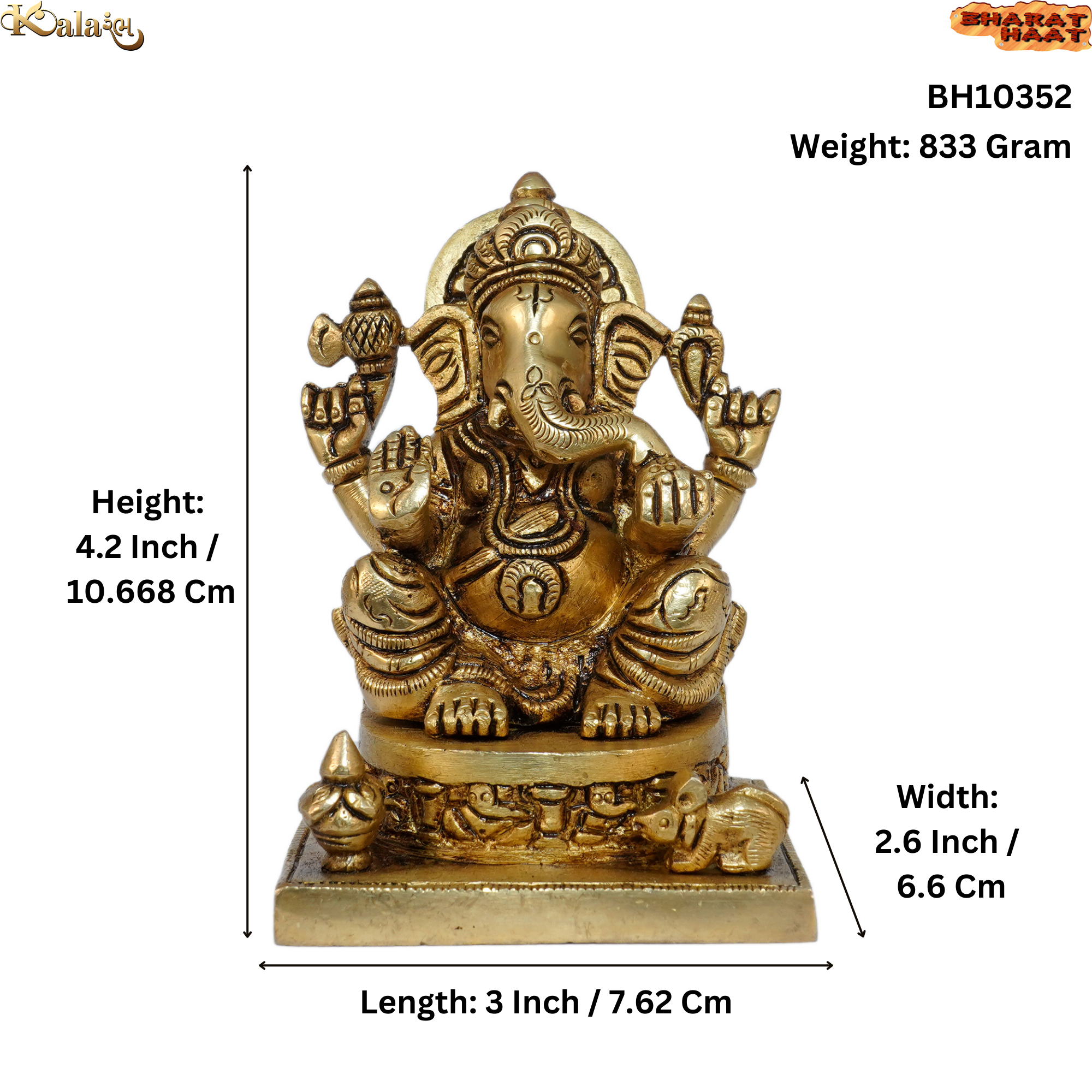 This intricately designed Brass Ganesha Murti is made from high-quality solid brass by skilled Indian artisans, featuring detailed craftsmanship and a polished antique finish. Measuring 3 x 2.6 x 4.2 inches and weighing 833 grams, this substantial idol is perfect for home temples, pooja altars, office desks, or sacred shelves, adding divine elegance and spiritual charm.