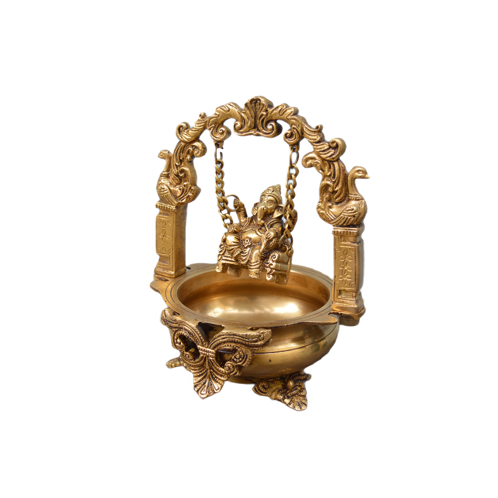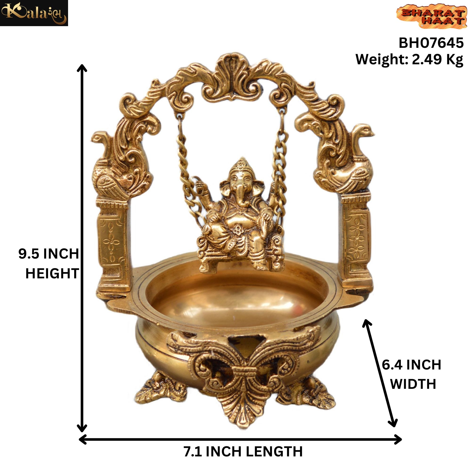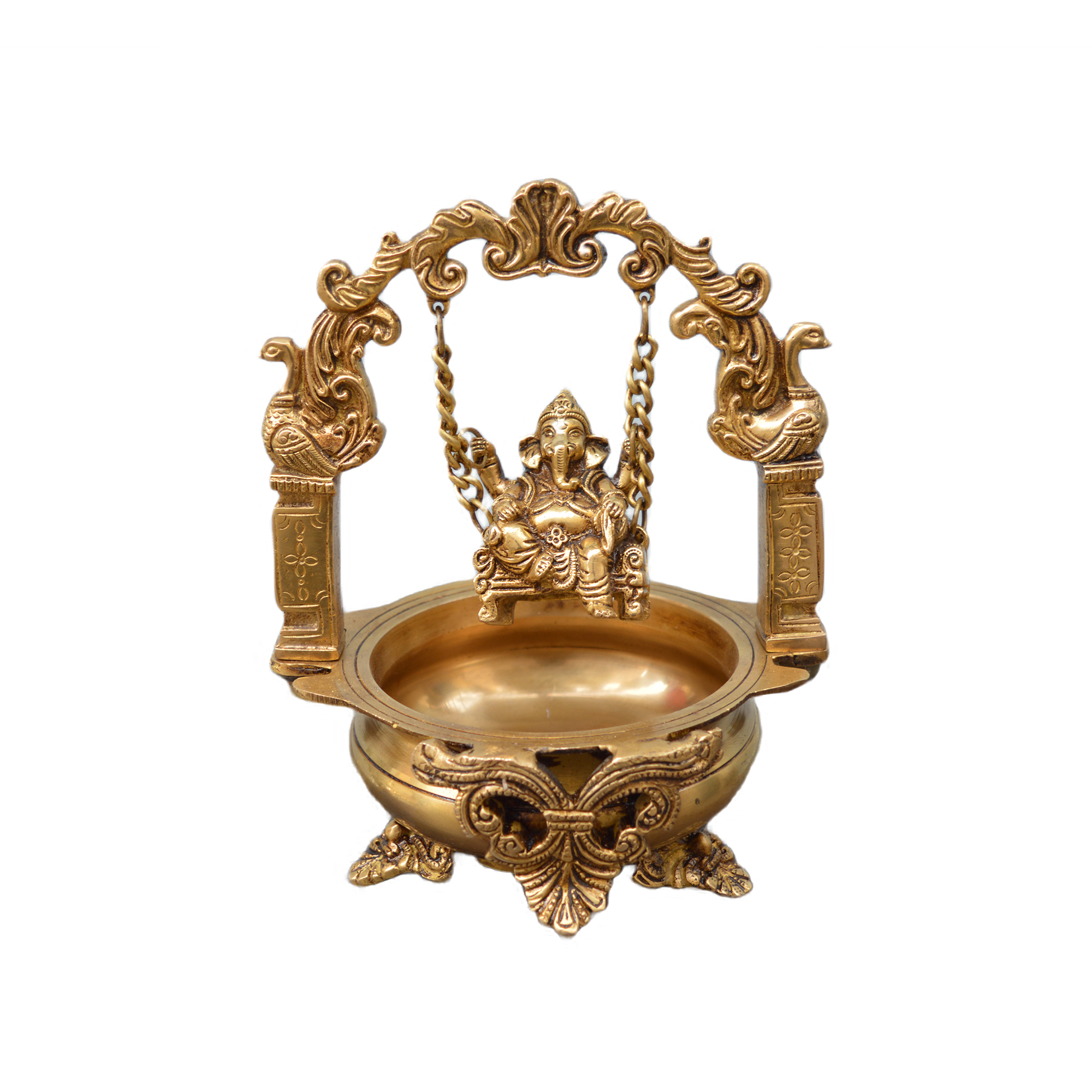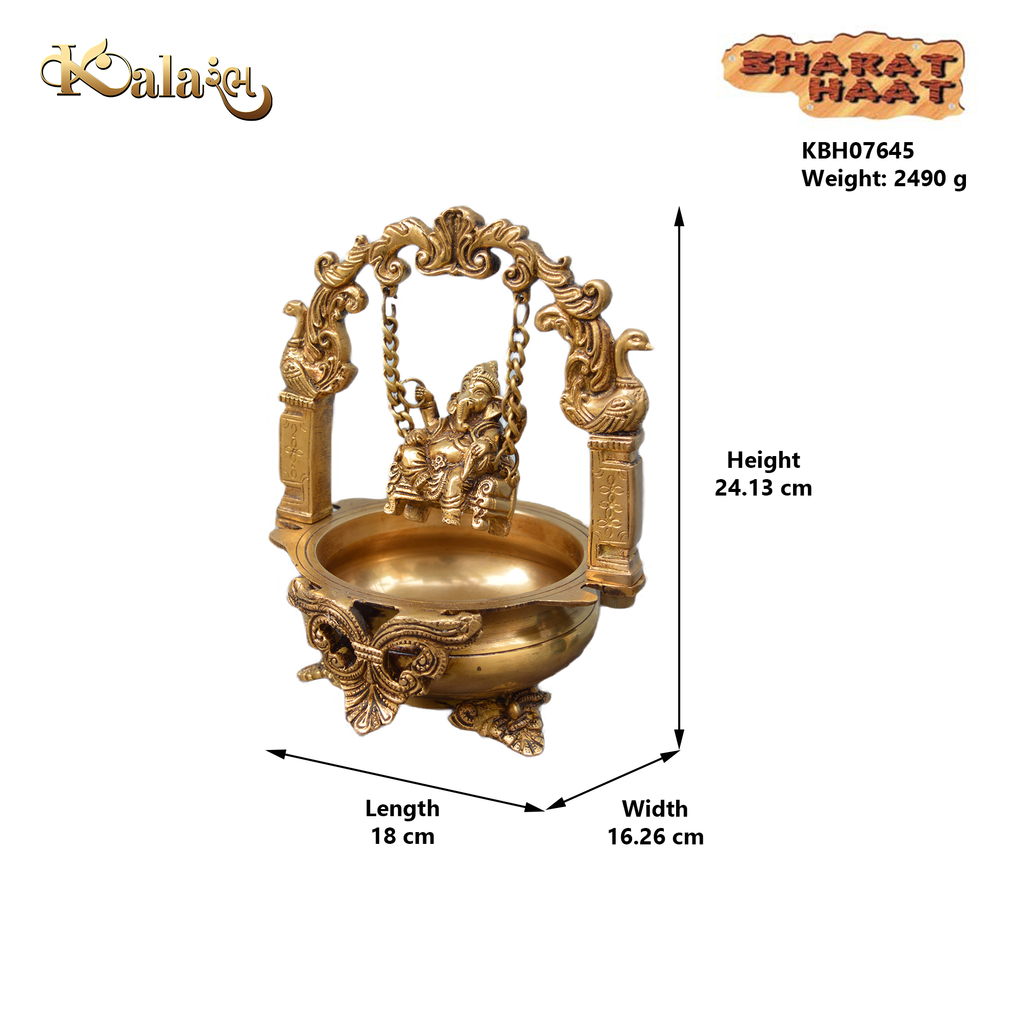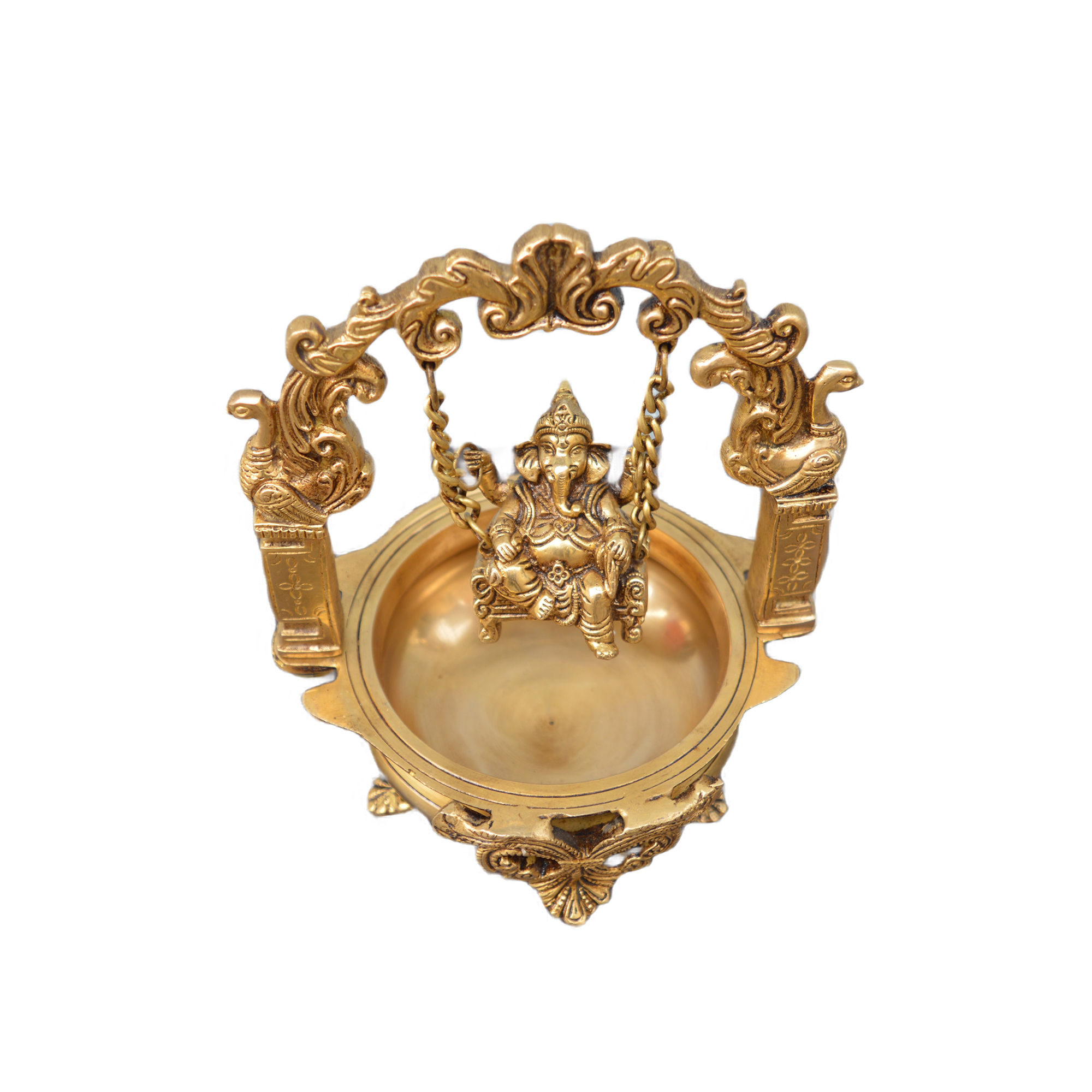 Beautifully crafted Brass Ganesha Jula showcasing Lord Ganesh seated on a swing. A symbol of prosperity and positivity, perfect for pooja rooms or as a decorative centerpiece.