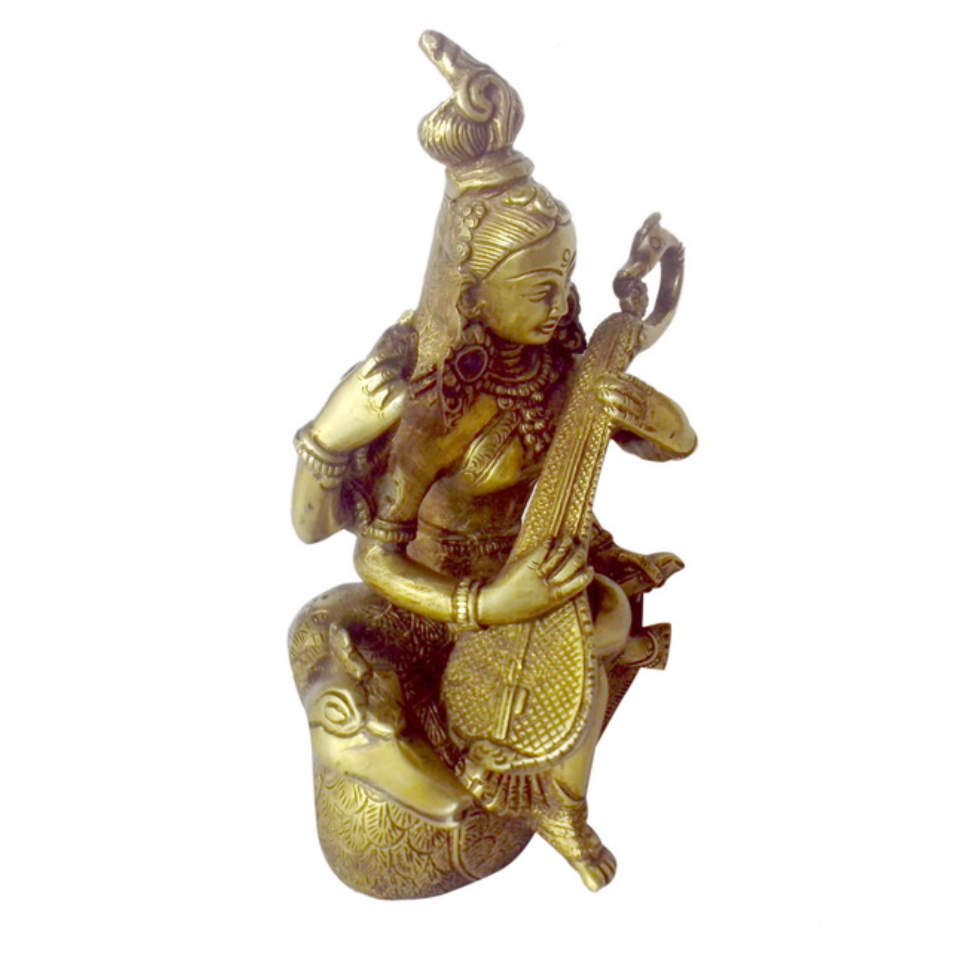 This exquisite Brass Goddess Saraswati statue is a beautiful spiritual piece for your home, puja room, or office. Crafted from premium quality brass, this elegant idol celebrates the divine wisdom and knowledge of Goddess Saraswati, the Hindu goddess of learning, arts, and music.