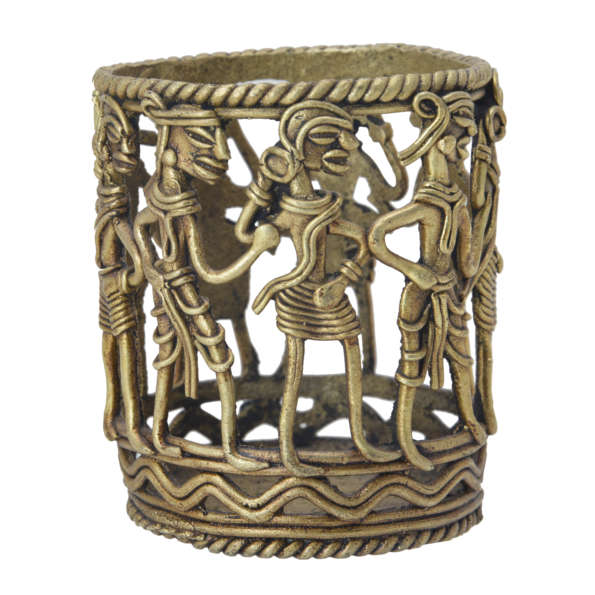 Authentic Bastar art brass pen stand featuring intricate tribal human figures. A perfect combination of functionality and traditional Indian artistry for your workspace.