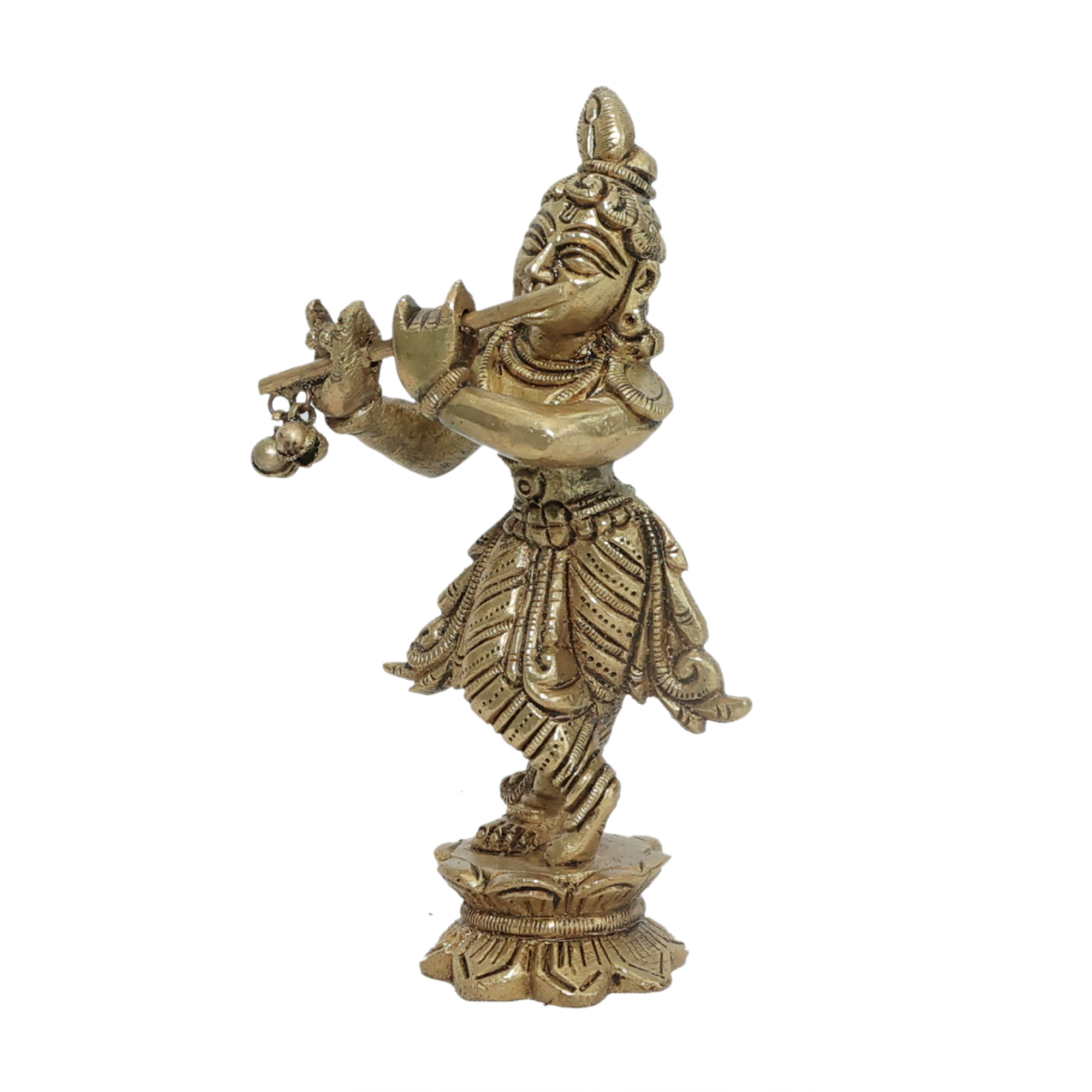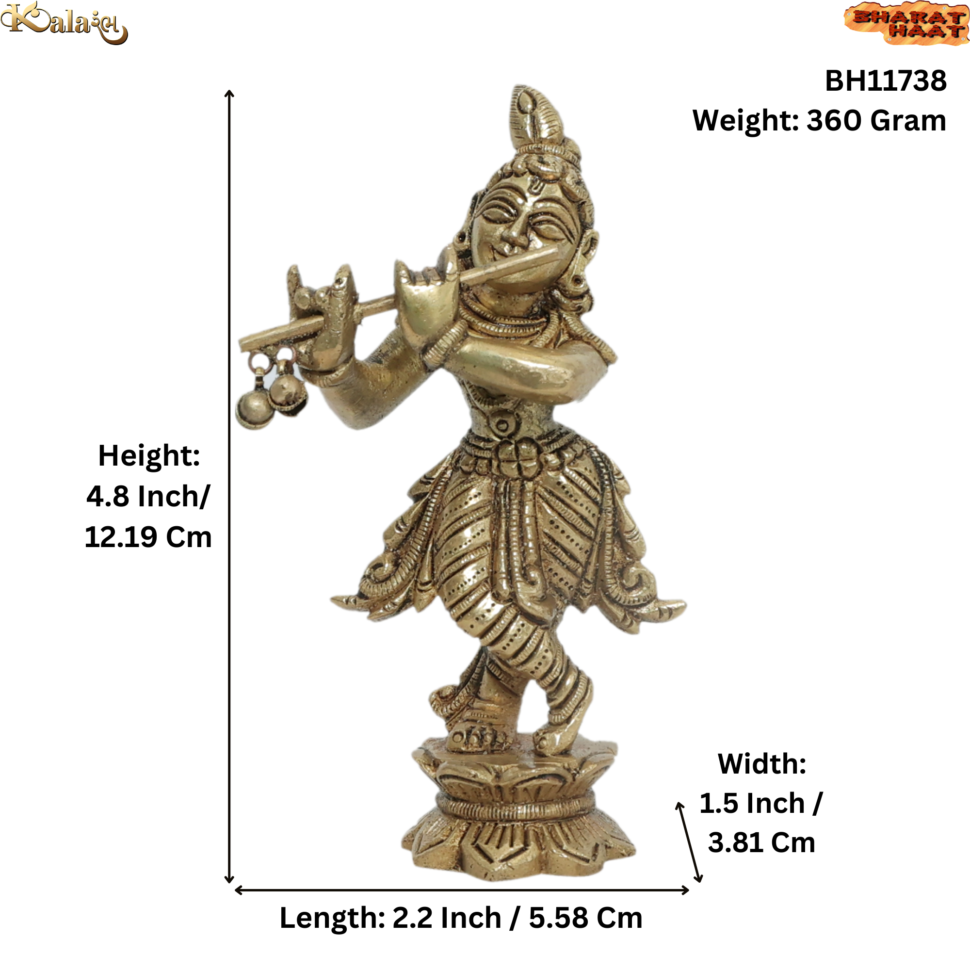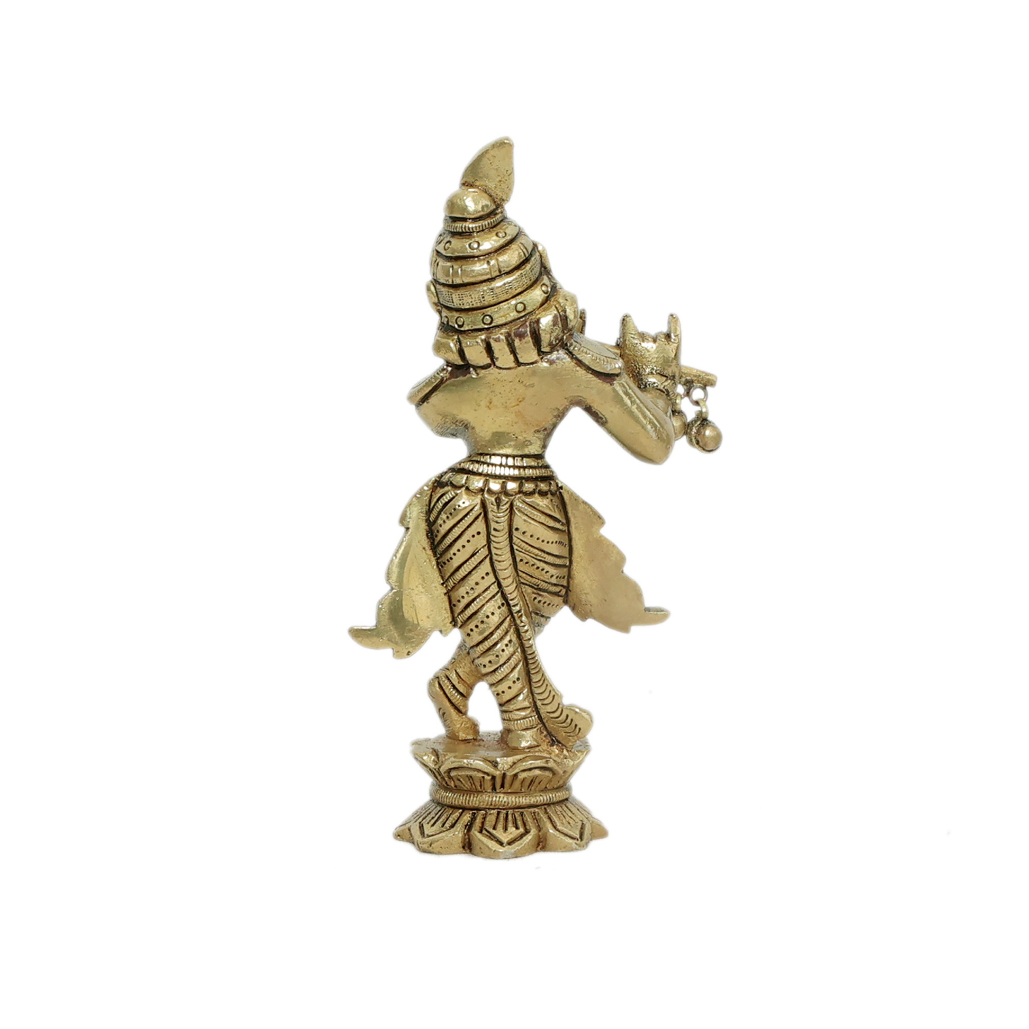 Lord Krishna brass idol perfect for mini puja setups, office temples, and personal devotion spaces. This exquisite golden murti showcases Shri Krishna's enchanting beauty with delicate craftsmanship, bringing spiritual blessings to compact worship areas and modern homes.