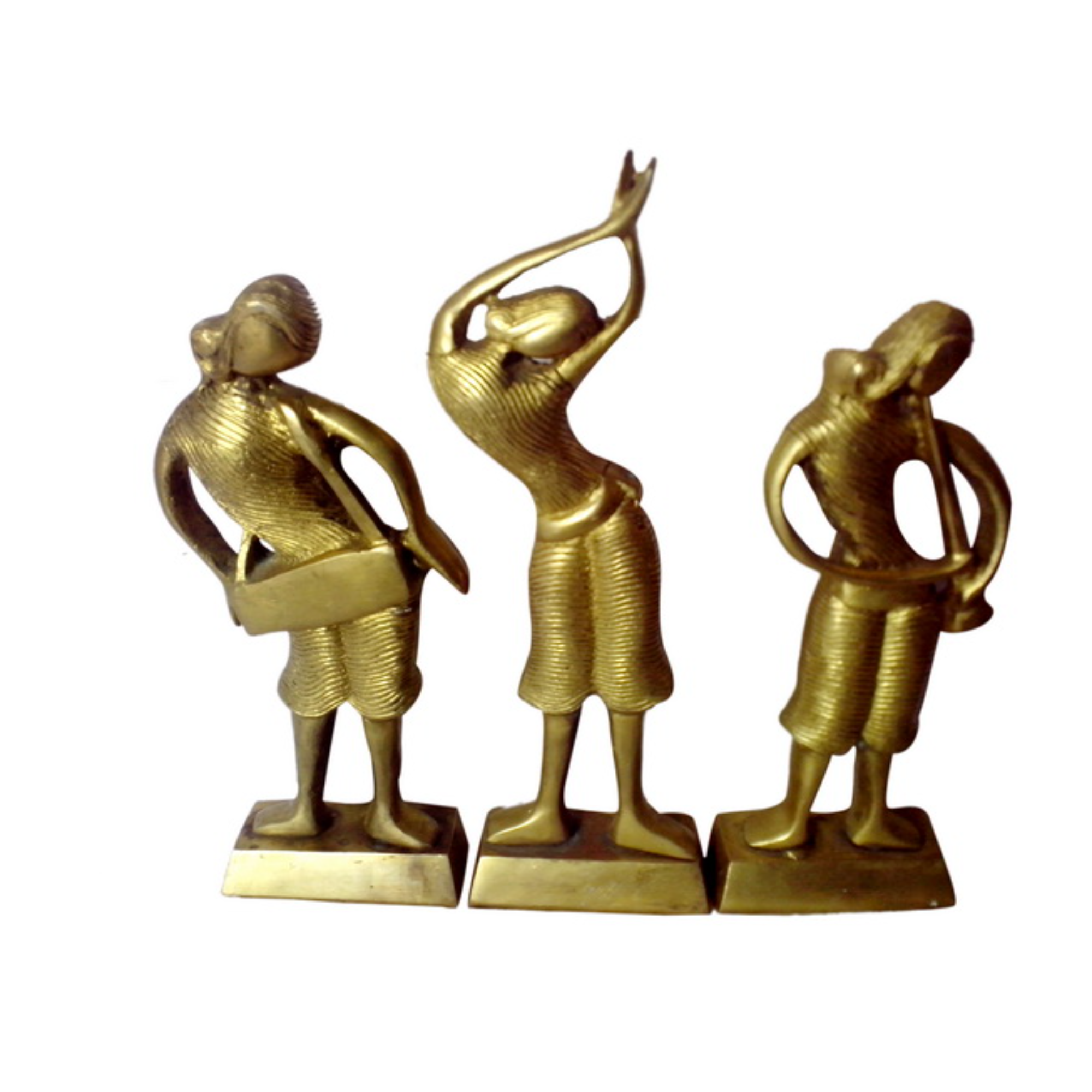 Design: Beautifully detailed set of three brass lady figurines playing musical instruments, showcasing fine artistry and elegance.