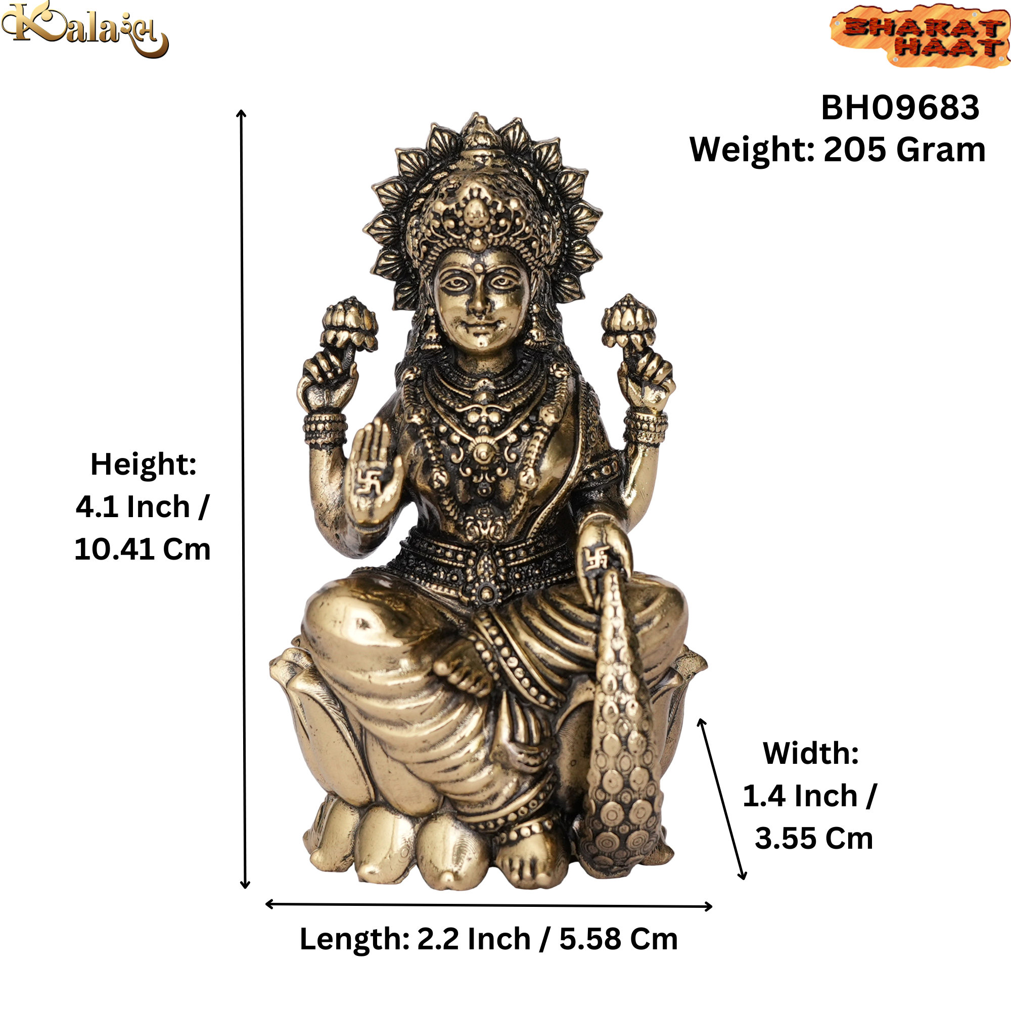 The idol measures 2.2 x 1.4 x 4.1 inches (5.58 x 3.55 x 10.41 cm) and weighs 205 grams, making it ideal for placement in home temples, pooja rooms, or office desks. Its compact size allows it to fit seamlessly in any sacred or decorative space, while the fine detailing—such as the goddess seated gracefully on a lotus and adorned with traditional ornaments—adds to its beauty and spiritual aura.
